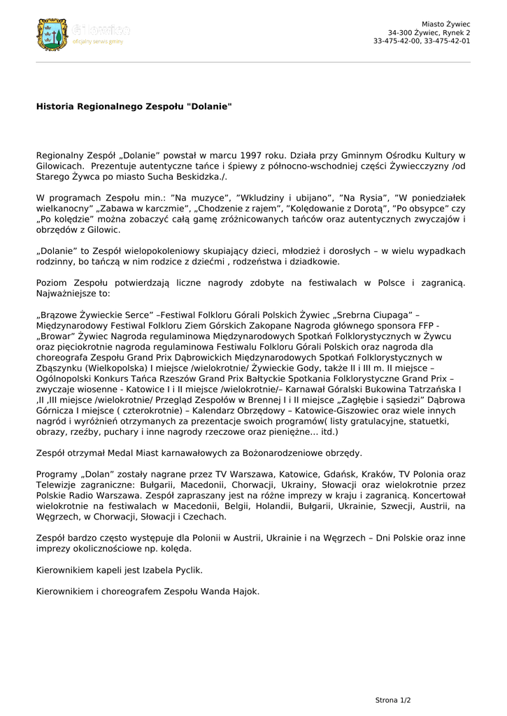 Miasto Żywiec 34-300 Żywiec, Rynek 2 33-475-42-00, 33-475-42-01 Historia Regionalnego Zespołu "Dolanie" Regionalny Zespół „Dolanie” powstał w marcu 1997 roku. Działa przy Gminnym Ośrodku Kultury w Gilowicach. Prezentuje autentyczne tańce i śpiewy z północno-wschodniej części Żywiecczyzny /od Starego Żywca po miasto Sucha Beskidzka./. W programach Zespołu min.: ”Na muzyce”, ”Wkludziny i ubijano”, ”Na Rysia”, ”W poniedziałek wielkanocny” „Zabawa w karczmie”, „Chodzenie z rajem”, ”Kolędowanie z Dorotą”, ”Po obsypce” czy „Po kolędzie” można zobaczyć całą gamę zróżnicowanych tańców oraz autentycznych zwyczajów i obrzędów z Gilowic. „Dolanie” to Zespół wielopokoleniowy skupiający dzieci, młodzież i dorosłych – w wielu wypadkach rodzinny, bo tańczą w nim rodzice z dziećmi , rodzeństwa i dziadkowie. Poziom Zespołu potwierdzają liczne nagrody zdobyte na festiwalach w Polsce i zagranicą. Najważniejsze to: „Brązowe Żywieckie Serce” –Festiwal Folkloru Górali Polskich Żywiec „Srebrna Ciupaga” – Międzynarodowy Festiwal Folkloru Ziem Górskich Zakopane Nagroda głównego sponsora FFP „Browar” Żywiec Nagroda regulaminowa Międzynarodowych Spotkań Folklorystycznych w Żywcu oraz pięciokrotnie nagroda regulaminowa Festiwalu Folkloru Górali Polskich oraz nagroda dla choreografa Zespołu Grand Prix Dąbrowickich Międzynarodowych Spotkań Folklorystycznych w Zbąszynku (Wielkopolska) I miejsce /wielokrotnie/ Żywieckie Gody, także II i III m. II miejsce – Ogólnopolski Konkurs Tańca Rzeszów Grand Prix Bałtyckie Spotkania Folklorystyczne Grand Prix – zwyczaje wiosenne - Katowice I i II miejsce /wielokrotnie/– Karnawał Góralski Bukowina Tatrzańska I ,II ,III miejsce /wielokrotnie/ Przegląd Zespołów w Brennej I i II miejsce „Zagłębie i sąsiedzi” Dąbrowa Górnicza I miejsce ( czterokrotnie) – Kalendarz Obrzędowy – Katowice-Giszowiec oraz wiele innych nagród i wyróżnień otrzymanych za prezentacje swoich programów( listy gratulacyjne, statuetki, obrazy, rzeźby, puchary i inne nagrody rzeczowe oraz pieniężne… itd.) Zespół otrzymał Medal Miast karnawałowych za Bożonarodzeniowe obrzędy. Programy „Dolan” zostały nagrane przez TV Warszawa, Katowice, Gdańsk, Kraków, TV Polonia oraz Telewizje zagraniczne: Bułgarii, Macedonii, Chorwacji, Ukrainy, Słowacji oraz wielokrotnie przez Polskie Radio Warszawa. Zespół zapraszany jest na różne imprezy w kraju i zagranicą. Koncertował wielokrotnie na festiwalach w Macedonii, Belgii, Holandii, Bułgarii, Ukrainie, Szwecji, Austrii, na Węgrzech, w Chorwacji, Słowacji i Czechach. Zespół bardzo często występuje dla Polonii w Austrii, Ukrainie i na Węgrzech – Dni Polskie oraz inne imprezy okolicznościowe np. kolęda. Kierownikiem kapeli jest Izabela Pyclik. Kierownikiem i choreografem Zespołu Wanda Hajok. Strona 1/2 Miasto Żywiec 34-300 Żywiec, Rynek 2 33-475-42-00, 33-475-42-01 Strona 2/2 Powered by TCPDF (www.tcpdf.org)