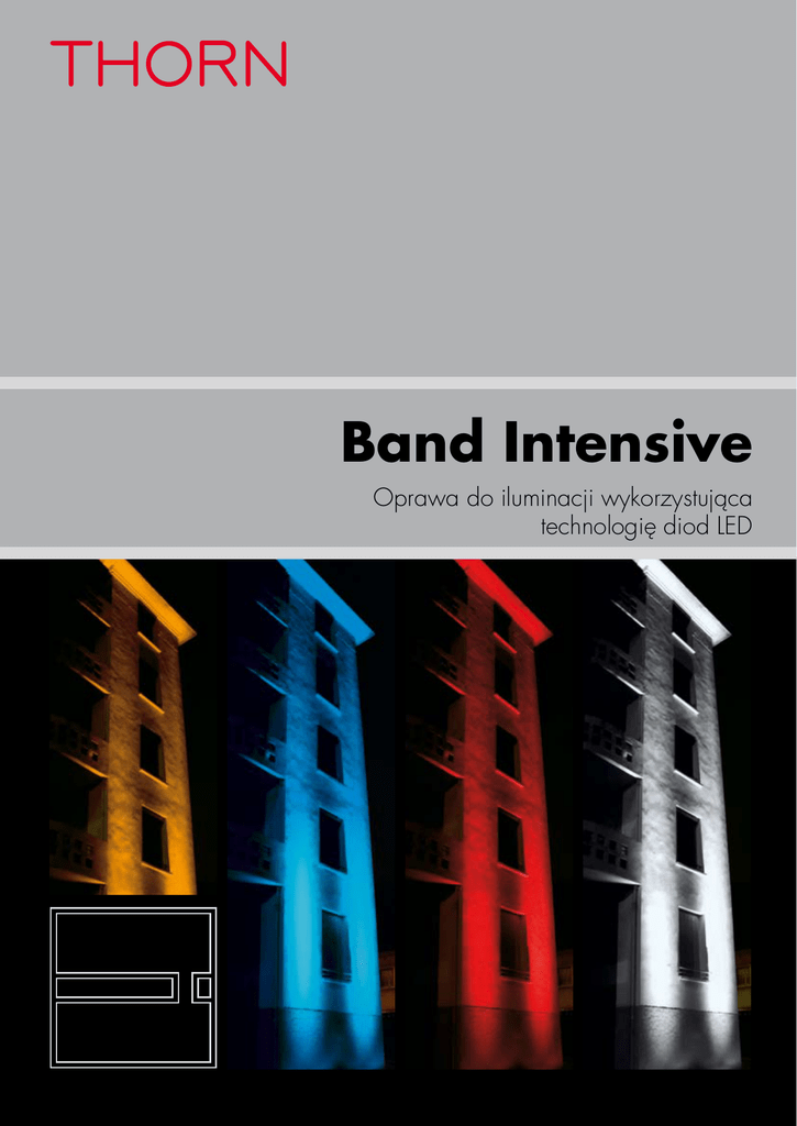 Band Intensive Oprawa do iluminacji wykorzystująca technologię diod LED Band Intensive jest uniwersalną oprawą wykorzystującą najnowszą technologię diod świecących LED, dzięki której zapewnia równomierną iluminację oświetlanych obiektów przy niskim zużyciu energii Dlaczego LED? Oświetlenie LED umożliwia projektantom i architektom uzyskanie szerokiej gamy efektów kolorystycznych przy wysokich parametrach oświetleniowych, co byłoby niemożliwe przy alternatywnych metodach oświetlenia. Diody LED charakteryzują się niskim zużyciem energii i bardzo długą żywotnością, łącząc tym samym oszczędność energii z niskimi kosztami konserwacji. Projektant: Patrick Rimoux • Równomierne oświetlenie szerokostrumieniowe, nawet jeśli wiele układów Band Intensive jest umieszczonych jeden przy drugim •Wysokie natężenie oświetlenia na wysokość 10 m (min.) •Smukły, liniowy kształt •Odporność na warunki pogodowe dzięki klasie szczelności IP67 •W wersji monochromatycznej 5 barw światła •Wersje do użytku scenicznego – 36 diod LED opartych na 3 kolorach (RGB) lub na 4 (RGBA), co zapewnia bogaty wybór barw (w tym białą). Każdym kolorem może indywidualnie sterować sterownik DMX •Bardzo niskie zużycie energii elektrycznej i długi okres eksploatacji, przy niskich kosztach instalacji i konserwacji •Uchwyty do montażu na ścianie umożliwiają kątowe ustawienie oprawy przy oświetlaniu fasad. •Klosz z hartowanego szkła NB: Należy bardzo precyzyjnie określić ustawienie w miejscu montażu, aby zapewnić liniowy rozsył światła. Wszystkie wersje Band Intensive należy stosować z przetwornicami lub sterownikami. •Możliwość wyboru technologii zmiany kolorów RGB lub RGBA Dobre parametry oświetleniowe: Wydajność wzrokowa - Diody LED o dużej mocy wytwarzają skoncentrowaną i jednorodną wiązkę - Wybór pięciu nasyconych kolorów plus możliwości płynące z dynamicznej zmiany barw RGB i RGBA Skuteczność: Zmniejszenie zużycia energii - Niskie zużycie energii elektrycznej - Niskie koszty eksploatacji Wygoda: Zadowolenie i stymulacja odbiorców - Może wytworzyć odpowiedni nastrój lub podkreślić atmosferę - Ożywia fasady i nadaje im nowy wygląd. Wnosi ruch przez stale zmieniające się kolory - Przy montażu w nieprzerwany ciąg oprawy te tworzą całościową kompozycję dzięki dużej równomierności oświetlenia Źródła światła 36 diod LED o mocy 1 W każda (3 obwody drukowane po 12 LED-ów) Wykonanie Korpus/Rama: wytłaczane aluminium pomalowane na szaro proszkową farbą strukturalną (zbliżony do RAL 9007) Inne kolory RAL farby proszkowej dostępne na żądanie Dystanse: stal chromowana pomalowana na szaro proszkową farbą strukturalną (zbliżony do RAL 9007) Uchwyty montażowe: wytłaczane aluminium pomalowane na szaro proszkową farbą strukturalną (zbliżony do RAL 9007) Zaślepki końcowe: stal chromowana pomalowana na szaro proszkową farbą strukturalną (zbliżony do RAL 9007) Klosz: szkło hartowane 6 mm Uszczelka: silikon Montaż Nadaje się do montażu na powierzchniach i ścianach. Dostarczana z fabrycznym okablowaniem, przewodem o długości 1500 mm (2 x 1,0 mm2 przy wersji monochromatycznej, 4 x 1,0 mm2 przy wersji RGB i 5 x 1,0 mm2 przy wersji RGBA), który należy podłączyć do sterownika lub przetwornicy o klasie szczelności IP66. Maksymalna odległość pomiędzy projektorem a jego sterownikiem lub przetwornicą wynosi 53 m. Montaż na powierzchni: Maksymalna odległość pomiędzy ścianą a oprawą wynosi 150 mm. Kąt nachylenia +/-30° Montaż na ścianie: Używając dwóch śrub M6 przymocuj do ściany dwa uchwyty montażowe (dostarczone z oprawą) umieszczając je w odległości 700 mm od siebie. Przed zainstalowaniem oprawy, do zaślepek na obu jej końcach należy przymocować dystanse, używając śrub M8 dostarczonych z oprawą. Włóż oprawę w uchwyty montażowe – dystanse wsuną się w uchwyty, tworząc regulowane mocowanie. Dokręć oprawę kluczem do wkrętów z gniazdem sześciokątnym. Możliwa regulacja 65-milimetrowego odstępu pomiędzy projektorem a ścianą wynosi +/-15 mm. Kąt nachylenia +/-30°. Przy tworzeniu ciągłej belki oświetleniowej maksymalna odległość pomiędzy dwiema oprawami Band Intensive wynosi 30 mm. Instalacja przetwornicy lub sterownika Monochromatyczną oprawę Band Intensive należy stosować z przetwornicą. Wersje RGB/ RGBA muszą być stosowane ze sterownikiem kompatybilnym ze standardowym systemem sterującym DMX. Przetwornica do wersji monochromatycznej jest mocowana za pomocą podpórki przykręcanej dwoma śrubami M4 pod projektorem lub bezpośrednio na ścianie. Dławik kablowy PG9 z kostką zaciskową 2 x 1,5 mm2 na kabel o przekroju kołowym i średnicy zewnętrznej 5,5-9 mm. Sterownik do wersji RGB lub RGBA jest mocowany do ściany za pomocą czterech śrub M5. Dławik kablowy PE20 z kostką zaciskową 2 x 1,5 mm2 na kabel o przekroju kołowym i średnicy zewnętrznej 8-13 mm. Możliwe okablowanie przelotowe przetwornicy i sterownika. Normy Projekt i produkcja zgodne z EN 60598 Klasa III bezpieczeństwa elektrycznego (Band) Klasa II bezpieczeństwa elektrycznego (przetwornica i sterownik) Odporność na uderzenia: IK08/5 N/m IP67 IP66 (przetwornica i sterownik) 15.0m 12.5m 800 50 10.0m 100 60 7.5m 5.0m 180 390 290 50 2.5m 50 Przetwornica dla wersji monochromatycznej Montaż 60 Sterownik dla wersji RGB/RGBA 88˚ 0.0m -1.5m -1.0m -0.5m 0.0m 0.5m 1.0m 1.5m 1 luks 2,5 luksa 5 luks 10 luks 25 luks 50 luks 0.10m 150 luks Opis typów Dostarczana w komplecie z diodami LED. W celu skompletowania zestawu należy zamówić oprawę oraz jedną przetwornicę lub jeden sterownik. Opis Źródło światła Ciężar (kg) Symb.zam Oprawa monochromatyczna BAND NW 43W 36LED AMB BAND NW 43W 36LED RED BAND NW 43W 36LED GRN BAND NW 43W 36LED BLU BAND NW 43W 36LED WHITE/5500K 4,6 4,6 4,6 4,6 4,6 96251168 96251169 96251170 96251171 96251172 Prz