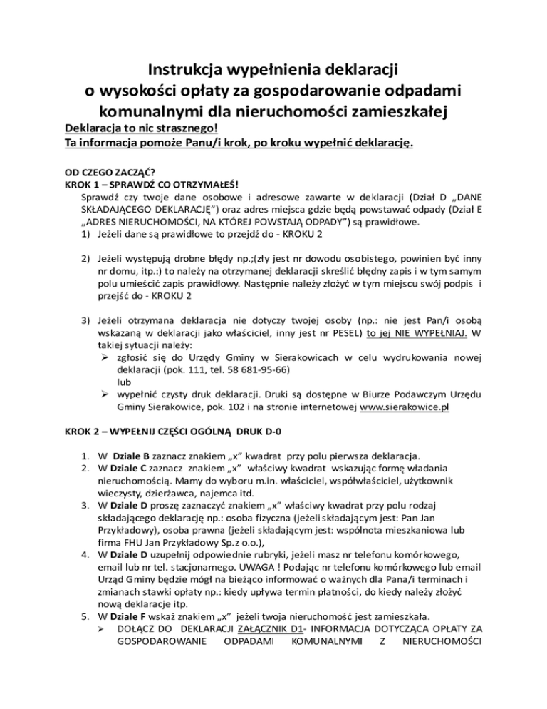 Instrukcja wypełnienia deklaracji o wysokości opłaty za gospodarowanie odpadami komunalnymi dla nieruchomości zamieszkałej Deklaracja to nic strasznego! Ta informacja pomoże Panu/i krok, po kroku wypełnić deklarację. OD CZEGO ZACZĄĆ? KROK 1 – SPRAWDŹ CO OTRZYMAŁEŚ! Sprawdź czy twoje dane osobowe i adresowe zawarte w deklaracji (Dział D „DANE SKŁADAJĄCEGO DEKLARACJĘ”) oraz adres miejsca gdzie będą powstawać odpady (Dział E „ADRES NIERUCHOMOŚCI, NA KTÓREJ POWSTAJĄ ODPADY”) są prawidłowe. 1) Jeżeli dane są prawidłowe to przejdź do - KROKU 2 2) Jeżeli występują drobne błędy np.;(zły jest nr dowodu osobistego, powinien być inny nr domu, itp.:) to należy na otrzymanej deklaracji skreślić błędny zapis i w tym samym polu umieścić zapis prawidłowy. Następnie należy złożyć w tym miejscu swój podpis i przejść do - KROKU 2 3) Jeżeli otrzymana deklaracja nie dotyczy twojej osoby (np.: nie jest Pan/i osobą wskazaną w deklaracji jako właściciel, inny jest nr PESEL) to jej NIE WYPEŁNIAJ. W takiej sytuacji należy: zgłosić się do Urzędy Gminy w Sierakowicach w celu wydrukowania nowej deklaracji (pok. 111, tel. 58 681-95-66) lub wypełnić czysty druk deklaracji. Druki są dostępne w Biurze Podawczym Urzędu Gminy Sierakowice, pok. 102 i na stronie internetowej www.sierakowice.pl KROK 2 – WYPEŁNIJ CZĘŚCI OGÓLNĄ DRUK D-0 1. W Dziale B zaznacz znakiem „x” kwadrat przy polu pierwsza deklaracja. 2. W Dziale C zaznacz znakiem „x” właściwy kwadrat wskazując formę władania nieruchomością. Mamy do wyboru m.in. właściciel, współwłaściciel, użytkownik wieczysty, dzierżawca, najemca itd. 3. W Dziale D proszę zaznaczyć znakiem „x” właściwy kwadrat przy polu rodzaj składającego deklarację np.: osoba fizyczna (jeżeli składającym jest: Pan Jan Przykładowy), osoba prawna (jeżeli składającym jest: wspólnota mieszkaniowa lub firma FHU Jan Przykładowy Sp.z o.o.), 4. W Dziale D uzupełnij odpowiednie rubryki, jeżeli masz nr telefonu komórkowego, email lub nr tel. stacjonarnego. UWAGA ! Podając nr telefonu komórkowego lub email Urząd Gminy będzie mógł na bieżąco informować o ważnych dla Pana/i terminach i zmianach stawki opłaty np.: kiedy upływa termin płatności, do kiedy należy złożyć nową deklaracje itp. 5. W Dziale F wskaż znakiem „x” jeżeli twoja nieruchomość jest zamieszkała. DOŁĄCZ DO DEKLARACJI ZAŁĄCZNIK D1- INFORMACJA DOTYCZĄCA OPŁATY ZA GOSPODAROWANIE ODPADAMI KOMUNALNYMI Z NIERUCHOMOŚCI 6. 7. 8. 9. ZAMIESZKAŁEJ – Jak go wypełnić w dalszej części instrukcji (KROK 3); Skoryguj ewentualne błędy w adresie zamieszkania. Podaj adres do korespondencji jeżeli jest inny niż adres zamieszkania/siedziby. Dział G - wypełnij jeżeli odpady mają być odbierane z innego miejsca niż adres gdzie powstają (wskazany w dziale E). Dział H- określ co planujesz robić z odpadami zielonymi i popiołem - zaznacz „x” przy właściwym polu. Twój wybór nie wpływa na wysokość ponoszonej opłaty. Dział I – zaznacz znakiem „x” kwadrat przy polu Załącznik D1 Dział J – zaznacz znakiem „x” Tak jeżeli podałeś w deklaracji nr telefonu komórkowego lub email oraz wpisz datę i złóż swój podpis. KROK 3 – WYPEŁNIJ ZAŁĄCZNIK I OBLICZ SWOJĄ OPŁATĘ DRUK D-1 1. Zapoznaj się z definicją gospodarstwa domowego. 2. Dział A1. Zadecyduj czy odpady na twojej nieruchomości będą gromadzone i odbierane w sposób selektywny. Jeżeli TAK to zaznacz właściwy kwadrat w poz. 1, a będziesz płacić niższe stawki opłaty. Jeżeli NIE to zaznacz właściwy kwadrat w poz. 2, ale będziesz płacić wyższe stawki opłaty. 3. Następnie określ ilość i wielkość gospodarstwa domowego jakie występuje na twojej nieruchomości. Przykładowo na nieruchomości może być jedno gospodarstwo 3osobowe lub dwa gospodarstwa 2-osobowe i jedno gospodarstwo 5-osobowe. Stawki opłat zostały zróżnicowane i są inne w gospodarstwach 1-osobowych, 2-osobowych, 3-osobowych, 4-osobowych, 5-osobowych, 6-osobowych i większych. Powyżej 6 osób w gospodarstwie domowym stawka opłaty pozostaje na stałym poziomie. Uwaga! Jeśli ilość osób zameldowanych będzie wyższa niż liczba osób zadeklarowanych, to taka deklaracja będzie wymagała weryfikacji i złożenia stosownych wyjaśnień i oświadczeń przez właściciela nieruchomości. 4. Oblicz wysokość opłaty miesięcznej i kwartalnej. W odpowiednim wierszu kolumny nr 2 tabeli, wpisz ile jest gospodarstw domowych. Następnie przemnóż liczbę gospodarstw x stawkę opłaty z kol. 3, jeżeli będziesz segregował odpady, lub stawkę z kolumny 4 jeżeli tego nie będziesz robić. Otrzymaną kwotę wpisz w odpowiednim polu kolumny nr 5. Następnie kwotę opłaty miesięcznej przemnóż x 3 (kwartały), by uzyskać wysokość kwartalnej opłaty. Taką opłatę będzie należało uiszczać od 1 lipca 2013 r. raz na kwartał, do 15 marca, 15 czerwca, 15 września i 15 grudnia każdego roku kalendarzowego. Termin wniesienia pierwszej opłaty upływa 15 września 2013 roku. 5. Dział B1 – Należy wypełnić, jeżeli więcej osób jest zameldowanych, niż faktycznie zamieszkuje. Właściciel takiej nieruchomości może wykazać stan faktyczny dołączając do deklaracji oświadczenia. W takim przypadku proszę zaznaczyć właściwy kwadrat i stosowne oświadczenie/zaświadczenie złożyć wraz z deklaracją. Druki oświadczeń są dostępne w Biurze Podawczym Urzędy Gminy w Sierakowicach w pok. 102. 6. Dział D1- wpisz datę i złóż swój podpis na załączniku deklaracji.