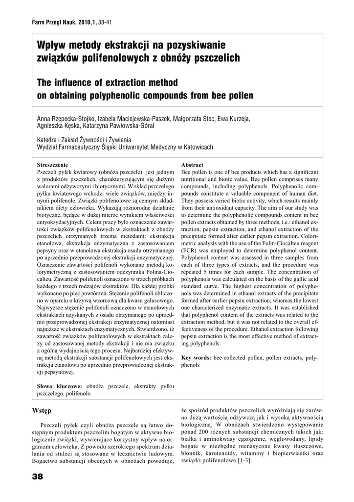 &ARM0RZEGL.AUK 7PYWMETODYEKSTRAKCJINAPOZYSKIWANIE ZWIZKÌWPOLIFENOLOWYCHZOBNÌYPSZCZELICH 4HEINFLUENCEOFEXTRACTIONMETHOD ONOBTAININGPOLYPHENOLICCOMPOUNDSFROMBEEPOLLEN !NNA2ZEPECKA3TOJKO)ZABELA-ACIEJEWSKA0ASZEK-AGORZATA3TEC%WA+URZEJA !GNIESZKA+ÃSKA+ATARZYNA0AWOWSKA'ÌRAL +ATEDRAI:AKADYWNOuCIIYWIENIA 7YDZIA&ARMACEUTYCZNYgLSKI5NIWERSYTET-EDYCZNYW+ATOWICACH Streszczenie Pszczeli pyłek kwiatowy (obnóża pszczele) jest jednym z produktów pszczelich, charakteryzującym się dużymi walorami odżywczymi i biotycznymi. W skład pszczelego pyłku kwiatowego wchodzi wiele związków, między innymi polifenole. Związki polifenolowe są cennym składnikiem diety człowieka. Wykazują różnorodne działanie biotyczne, będące w dużej mierze wynikiem właściwości antyoksydacyjnych. Celem pracy było oznaczenie zawartości związków polifenolowych w ekstraktach z obnóży pszczelich otrzymanych trzema metodami: ekstrakcja etanolowa, ekstrakcja enzymatyczna z zastosowaniem pepsyny oraz w etanolowa ekstrakcja osadu otrzymanego po uprzednio przeprowadzonej ekstrakcji enzymatycznej. Oznaczenie zawartości polifenoli wykonano metodą kolorymetryczną z zastosowaniem odczynnika Folina-Ciocalteu. Zawartość polifenoli oznaczono w trzech próbkach każdego z trzech rodzajów ekstraktów. Dla każdej próbki wykonano po pięć powtórzeń. Stężenie polifenoli obliczono w oparciu o krzywą wzorcową dla kwasu galusowego. Najwyższe stężenie polifenoli oznaczono w etanolowych ekstraktach uzyskanych z osadu otrzymanego po uprzednio przeprowadzonej ekstrakcji enzymatycznej natomiast najniższe w ekstraktach enzymatycznych. Stwierdzono, iż zawartość związków polifenolowych w ekstraktach zależy od zastosowanej metody ekstrakcji i nie ma związku z ogólną wydajnością tego procesu. Najbardziej efektywną metodą ekstrakcji substancji polifenolowych jest ekstrakcja etanolowa po uprzednio przeprowadzonej ekstrakcji pepsynowej. Abstract Bee pollen is one of bee products which has a significant nutritional and biotic value. Bee pollen comprises many compounds, including polyphenols. Polyphenolic compounds constitute a valuable component of human diet. They possess varied biotic activity, which results mainly from their antioxidant capacity. The aim of our study was to determine the polyphenolic compounds content in bee pollen extracts obtained by three methods, i.e.: ethanol extraction, pepsin extraction, and ethanol extraction of the precipitate formed after earlier pepsin extraction. Colorimetric analysis with the use of the Folin-Ciocalteu reagent (FCR) was employed to determine polyphenol content. Polyphenol content was assessed in three samples from each of three types of extracts, and the procedure was repeated 5 times for each sample. The concentration of polyphenols was calculated on the basis of the gallic acid standard curve. The highest concentration of polyphenols was determined in ethanol extracts of the precipitate formed after earlier pepsin extraction, whereas the lowest one characterized enzymatic extracts. It was established that polyphenol content of the extracts was related to the extraction method, but it was not related to the overall effectiveness of the procedure. Ethanol extraction following pepsin extraction is the most effective method of extracting polyphenols. Key words: bee-collected pollen, pollen extracts, polyphenols Słowa kluczowe: obnóża pszczele, ekstrakty pyłku pszczelego, polifenole. Wstęp Pszczeli pyłek czyli obnóża pszczele są łatwo dostępnym produktem pszczelim bogatym w aktywne biologicznie związki, wywierające korzystny wpływ na organizm człowieka. Z powodu szerokiego spektrum działania od stuleci są stosowane w lecznictwie ludowym. Bogactwo substancji obecnych w obnóżach powoduje, że spośród produktów pszczelich wyróżniają się zarówno dużą wartością odżywczą jak i wysoką aktywnością biologiczną. W obnóżach stwierdzono występowanie ponad 200 różnych substancji chemicznych takich jak: białka i aminokwasy egzogenne, węglowodany, lipidy bogate w niezbędne nienasycone kwasy tłuszczowe, błonnik, karotenoidy, witaminy i biopierwiastki oraz związki polifenolowe [1-3]. COPYRIGHT'RUPADR!2+WIECIÊSKIEGO)33. Badania doświadczalne i kliniczne dowodzą, iż obnóża pszczele wykazują korzystne działanie farmakologiczne w stanach zapalnych gruczołu krokowego jak również zaburzeniach przemiany lipidowej, a także wykazują działanie detoksykacyjne, antybakteryjne i przeciwgrzybicze, antyalergiczne, antyoksydacyjne [4, 5]. Obok zastosowania w medycynie, pszczeli pyłek kwiatowy wykorzystywany jest często w żywieniu jako składnik wspomagający odżywianie. Spożywany w niewielkich ilościach, zapobiega niedoborom niektórych składników odżywczych [6]. Dlatego też, wśród wielu zastosowań pszczelego pyłku kwiatowego w medycynie, nie sposób pominąć tak cennego działania pyłku, jakim jest działanie prozdrowotne. Z tego względu pszczeli pyłek kwiatowy wykorzystywany jest również w leczeniu chorób cywilizacyjnych, na które zapada coraz większa cześć populacji. Prewencyjne działanie pyłku w stosunku do niektórych chorób zdeterminowane jest obecnością w jego składzie tak cennych substancji jakimi są związki polifenolowe [4, 7, 8]. Polifenole są substancjami o działaniu antyoksydacyjnym, chronią komórki przed uszkodzeniami wywołanymi przez wolne rodniki - cząsteczki o dużej reaktywności. Wolne rodniki niszczą błony komórkowe oraz zaburzają podstawowe procesy enzymatyczne przebiegające w komórce, przez co zakłóceniu ulega homeostaza całego organizmu. Substancje o właściwościach antyoksydacyjnych mają zdolność wychwytywania wolnych rodników, dzięki czemu zapobiegają wielu chorobom, wywołanym stresem tlenowym [7, 9]. Badania epidemiologiczne wykazują wyraźną zależność między zwiększeniem spożycia substancji antyoksydacyjnych, a zmniejszeniem zachorowalności i