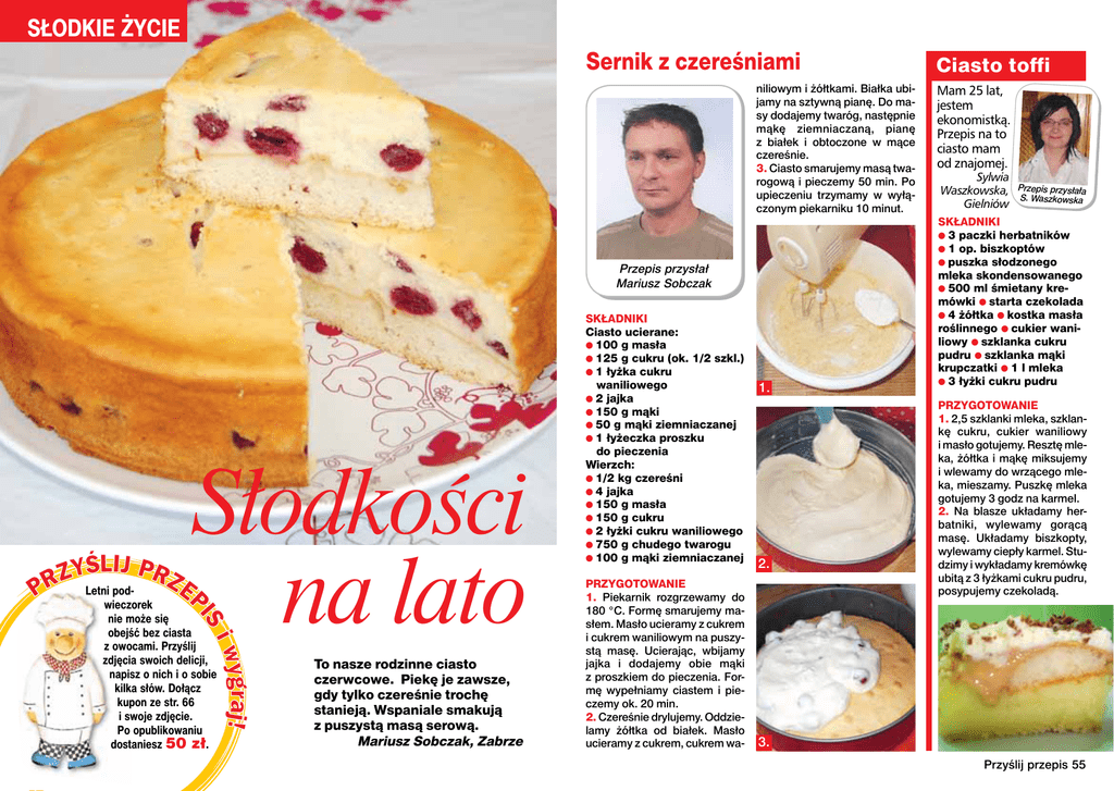 SŁODKIE ŻYCIE Sernik z czereśniami niliowym i żółtkami. Białka ubijamy na sztywną pianę. Do masy dodajemy twaróg, następnie mąkę ziemniaczaną, pianę z białek i obtoczone w mące czereśnie. 3. Ciasto smarujemy masą twarogową i pieczemy 50 min. Po upieczeniu trzymamy w wyłączonym piekarniku 10 minut. Przepis przysłał Mariusz Sobczak Słodkości na lato Letni podwieczorek nie może się obejść bez ciasta z owocami. Przyślij zdjęcia swoich delicji, napisz o nich i o sobie kilka słów. Dołącz kupon ze str. 66 i swoje zdjęcie. Po opublikowaniu dostaniesz 50 zł. To nasze rodzinne ciasto czerwcowe. Piekę je zawsze, gdy tylko czereśnie trochę stanieją. Wspaniale smakują z puszystą masą serową. Mariusz Sobczak, Zabrze SKŁADNIKI Ciasto ucierane: ● 100 g masła ● 125 g cukru (ok. 1/2 szkl.) ● 1 łyżka cukru waniliowego ● 2 jajka ● 150 g mąki ● 50 g mąki ziemniaczanej ● 1 łyżeczka proszku do pieczenia Wierzch: ● 1/2 kg czereśni ● 4 jajka ● 150 g masła ● 150 g cukru ● 2 łyżki cukru waniliowego ● 750 g chudego twarogu ● 100 g mąki ziemniaczanej PRZYGOTOWANIE 1. Piekarnik rozgrzewamy do 180 °C. Formę smarujemy masłem. Masło ucieramy z cukrem i cukrem waniliowym na puszystą masę. Ucierając, wbijamy jajka i dodajemy obie mąki z proszkiem do pieczenia. Formę wypełniamy ciastem i pieczemy ok. 20 min. 2. Czereśnie drylujemy. Oddzielamy żółtka od białek. Masło ucieramy z cukrem, cukrem wa- 1. 2. Ciasto toffi Mam 25 lat, jestem ekonomistką. Przepis na to ciasto mam od znajomej. Sylwia Waszkowska, Gielniów Przepis przysłała S. Waszkowska SKŁADNIKI ● 3 paczki herbatników ● 1 op. biszkoptów ● puszka słodzonego mleka skondensowanego ● 500 ml śmietany kremówki ● starta czekolada ● 4 żółtka ● kostka masła roślinnego ● cukier waniliowy ● szklanka cukru pudru ● szklanka mąki krupczatki ● 1 l mleka ● 3 łyżki cukru pudru PRZYGOTOWANIE 1. 2,5 szklanki mleka, szklankę cukru, cukier waniliowy i masło gotujemy. Resztę mleka, żółtka i mąkę miksujemy i wlewamy do wrzącego mleka, mieszamy. Puszkę mleka gotujemy 3 godz na karmel. 2. Na blasze układamy herbatniki, wylewamy gorącą masę. Układamy biszkopty, wylewamy ciepły karmel. Studzimy i wykładamy kremówkę ubitą z 3 łyżkami cukru pudru, posypujemy czekoladą. 3. Przyślij przepis 55