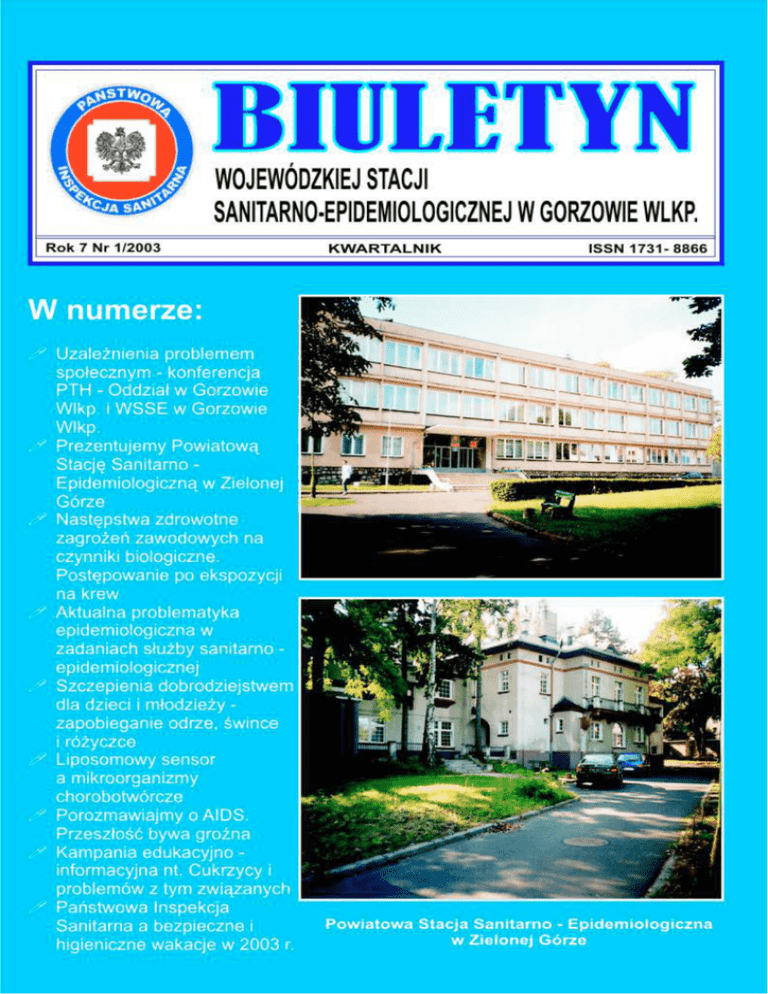 BIULETYN - Wojewódzkiej Stacji Sanitarno-Epidemiologicznej w Gorzowie Wlkp. Rok 7 Nr 1/2003 1 BIULETYN - Wojewódzkiej Stacji Sanitarno-Epidemiologicznej w Gorzowie Wlkp. 2 Rok 7 Nr 1/2003 BIULETYN - Wojewódzkiej Stacji Sanitarno-Epidemiologicznej w Gorzowie Wlkp. Œwiêta Bo¿ego Narodzenia i zbli¿aj¹cy siê Nowy Rok 2004 to czas refleksji, serdecznych wzruszeñ i radoœci w blasku choinkowych œwiec. Z tej okazji ¿yczê wszystkim pracownikom Pañstwowej Inspekcji Sanitarnej, by przynios³y odpoczynek od codziennych obowi¹zków, wiele radoœci, szczêœcia, spe³nienia oczekiwañ oraz wszelkiej pomyœlnoœci. Pañstwowy Wojewódzki Inspektor Sanitarny w Gorzowie Wlkp. Bo¿e Narodzenie 2003 Rok 7 Nr 1/2003 3 BIULETYN - Wojewódzkiej Stacji Sanitarno-Epidemiologicznej w Gorzowie Wlkp. Stacja Sanitarno-Epidemiologiczna w Zielonej Górze PAŃSTWOWY POWIATOWY INSPEKTOR SANITARNY W ZIELONEJ GÓRZE lek.med. Jerzy Politowicz Urodziłem się w 1942r. w Poznaniu, gdzie po ukończeniu Liceum Ogólnokształcącego i Akademii Medycznej w 1966r. uzyskałem tytuł lekarza medycyny. Od początku swojego życia zawodowego związany jestem z Ziemią Lubuską. Początkowo pracowałem w Szpitalu Powiatowym w Sulechowie, a następnie w latach 1968 – 1972 kierowałem Powiatowa Stacją Sanitarno – Epidemiologiczną w Sulechowie będąc jej Dyrektorem i Powiatowym Inspektorem Sanitarnym. W 1972r. przeszedłem do pracy do Wojewódzkiej Stacji Sanitarno – Epidemiologicznej w Zielonej Górze. Pracowałem tu na stanowisku Kierownika Sekcji Szczepień i Zwalczania Chorób a następnie Zastępcy Dyrektora i Kierownika Działu Epidemiologii. W międzyczasie uzyskałem I stopień specjalizacji z higieny i epidemiologii, II stopień specjalizacji z epidemiologii oraz I stopień specjalizacji z medycyny społecznej. Udzielałem się społecznie, szczególnie w zakresie szerzenia oświaty zdrowotnej, byłem wieloletnim wykładowcą w Liceum Medycznym w Zielonej Górze oraz radnym Rady Miejskiej w Zielonej Górze pierwszej kadencji. Od lutego 1999r. do końca roku 2002 zatrudniony byłem na stanowisku Dyrektora PSSE i Państwowego Powiatowego Inspektora Sanitarnego w Zielonej Górze. W latach 1999 do 2002r. pracowałem również na 1/2 etatu na stanowisku Państwowego Powiatowego Inspektora Sanitarnego i Dyrektora PSSE w Nowej Soli. 01.01.2003r. po przeprowadzonym postępowaniu kwalifikacyjnym ponownie zostałem powołany na stanowisko Państwowego Powiatowego Inspektora Sanitarnego w Zielonej Górze. lek.med. Jerzy POLITOWICZ Państwowy Powiatowy Inspektor Sanitarny w Zielonej Górze Historia Państwowej Inspekcji Sanitarnej W ZIELONEJ GÓRZE Początek funkcjonowania służby sanitarno-epidemiologicznej w Zielonej Górze to rok 1947, gdy przy Przychodni Obwodowej dla Miasta i Powiatu utworzono Powiatową Kolumnę Sanitarną. Jej kierownikiem był, jak wspomina pan Ryszard Kulszo – w latach 1960-1962 p.o. kierownika PSSE, przedwojenny oficer Kazimierz Ponarad. Nadzór sanitarny w pierwszych latach powojennych polegał przede wszystkim na: l akcjach sanitarno-porządkowych przeprowadzanych wiosną i jesienią, które polegały m.in. na likwidacji starych wysypisk i uzdatnianiu wody, l rozprowadzaniu trutki na szczury i kontrolowaniu jej wyłożenia, l zwalczaniu i zapobieganiu chorobom zakaźnym, l prowadzeniu szczepień ochronnych, l likwidacji wszawicy, bardzo wówczas rozpowszechnionej, wśród migrującej ludności. W latach 60-tych Powiatowa Kolumna Sanitarna zastąpiona została Miejską i Powiatową Stacją Sanitarno-Epidemiologiczną. W latach kolejnych nastąpiło ich połączenie i powstała Stacja Sanitarna dla Miasta i Powiatu. Jej siedziba początkowo mieściła się przy ul. Lisowskiego. Już wtedy w Stacji zatrudnionych było 20 osób: „gdy urządzano imieniny zawsze szukano 20-stu krzeseł”- wspomina długoletni pracownik Inspekcji Sanitarnej mgr Wanda Pazur. W połowie lat 60-tych przeniesiono Stację do budynku przy ul. Niepodległości. Do dyspozycji Stacji oddano dwa pokoiki dla pracowników merytorycznych, „kącik” dla Dyrektora, jak wspomina inż. Jan Grzegorczyk – ówczesny kierownik Pionu Nadzoru i pokój, w którym urządzono sekretariat. Jeden z pokoi przydzielono pracownikom nadzoru, który obejmował higienę żywności, higienę komunalną, higienę pracy i higienę szkolną. Tak duże zagęszczenie na małej powierzchni pracowników merytorycznych powodowało naturalny przepływ informacji. Przez osłuchanie się wszyscy znali swoje zakresy obowiązków i aktualne problemy związane z wykonywanym nadzorem. W strukturze Stacji funkcjonowały wtedy dwa piony, oprócz Pionu Nadzoru wydzielony był Pion Epidemiologiczny, którego pracę nadzorował osobiście Dyrektor Stacji – lek. med. Jerzy Stefko. W latach 70-tych do struktury Stacji wprowadzono Sekcje: - Epidemiologiczną - Nadzoru Zapobiegawczego - Higieny Komunalnej - Higieny Żywności i Żywienia - Higieny Pracy, oraz samodzielne stanowiska d/s Higieny szkolnej, oświaty zdrowotnej i Statystyki. Po wprowadzeniu, w 1975r. reformy administracyjnej Powiatowa Stacja Sanitarno-Epidemiologiczna zmieniła nazwę na Terenową Stację Sanitarno-Epidemiologiczną. W roku 1989 zmarł długoletni Dyrektor Stacji Jerzy Stefko. Po jego śmierci Stacją kierowali w latach: 1989-1994 lek. med. Waldemar Szymański 1994-1996 mgr inż. Halina Rzepecka 1996-1999 lek. med. Bazyli Szaucha (ciąg dalszy na str. 5) 4 Rok 7 Nr 1/2003 BIULETYN - Wojewódzkiej Stacji Sanitarno-Epidemiologicznej w Gorzowie Wlkp. (ciąg dalszy ze str. 4) W 1992r. Terenowa Stacja Sanitarno-Epidemiologiczna została przeniesiona z budynku przy ul. Niepodległości do siedziby WSSE przy ul. Jasnej 10. Wygospodarowane dla TSSE pomieszczenia ulokowane były w różnych miejscach dwóch budynków WSSE. Sprawiało to interesantom niejednokrotnie trudności z odnalezieniem właściwych Sekcji, a pracownikom wymianę bieżących informacji. Trudno się wtedy pracował