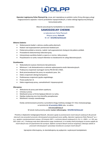 Operator Logistyczny Paliw Płynnych Sp. z o.o. jest największą na polskim rynku firmą oferującą usługi magazynowania zapasów i rezerw produktów ropopochodnych, a także obsługi logistycznej bieżącej konsumpcji paliw. Obecnie poszukujemy kandydatów na stanowisko: SAMODZIELNY CHEMIK w Laboratorium Paliw Płynnych Miejsce pracy: Koluszki Nr ref: SCH/09/16/Koluszki Główne Zadania: Wykonywanie badań z zakresu analizy paliw płynnych. Nadzór nad wyposażeniem pomiarowo-badawczym. Pobieranie próbek w terenie, nadzór nad wyposażeniem służącym do poboru próbek. Prowadzenie dokumentacji laboratoryjnej. Interpretacja wyników badań w oparciu o normy i akty prawne. Pozyskiwanie na rynku nowych klientów na świadczenie im usług laboratoryjnych. Oczekiwania: Wykształcenie wyższe chemiczne lub pokrewne. Minimum 1 rok doświadczenia w zakresie wykonywania analiz laboratoryjnych. Praktyczna znajomość wymagań normy PN-EN ISO 17025. Brak przeciwwskazań do pracy na wysokości pow. 3m. Dobra znajomość obsługi komputera. Podstawowa znajomość języka angielskiego. Prawo jazdy kat. B. Dobra organizacja pracy, samodzielność i dyspozycyjność. Oferujemy: Wdrożenie do pracy pod okiem opiekuna. Umowę o pracę. Możliwość pracy w firmie będącej liderem na rynku. Opiekę medyczną oraz inne benefity pozapłacowe. Możliwość rozwoju zawodowego. Osoby zainteresowane prosimy o przesłanie drogą mailową swojego CV i listu motywacyjnego, w terminie do 14 września 2016 roku na adres: [email protected] W tytule maila prosimy podać numer referencyjny: SCH/09/16/Koluszki Prosimy o dopisanie następującej klauzuli „Wyrażam zgodę na przetwarzanie moich danych osobowych dla potrzeb obecnych oraz przyszłych procesów rekrutacyjnych prowadzonych przez spółkę „Operator Logistyczny Paliw Płynnych” sp. z o.o., zgodnie z postanowieniami ustawy z 29 sierpnia 1997 r. o ochronie danych osobowych (t.j. Dz. U. z 2002 r., nr. 101, poz. 926 z późń. zm.). Przekazuję moje dane dobrowolnie mając świadomość, że w każdej chwili przysługuje mi prawo wglądu do moich danych oraz ich poprawiania lub usunięcia. Żądanie usunięcia danych oznacza rezygnację z dalszego udziału w procesach rekrutacyjnych i spowoduje niezwłoczne usunięcie moich danych”. Uprzejmie informujemy, że skontaktujemy się wyłącznie z wybranymi kandydatami.