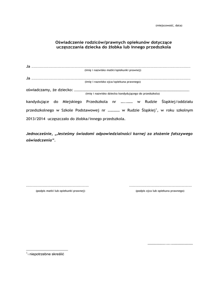 (miejscowość, data) Oświadczenie rodziców/prawnych opiekunów dotyczące uczęszczania dziecka do żłobka lub innego przedszkola Ja ................................................................................................................................................... (imię i nazwisko matki/opiekunki prawnej) Ja ................................................................................................................................................... (imię i nazwisko ojca/opiekuna prawnego) oświadczamy, że dziecko: ……………………………………………………………………………………………………………………………………………. (imię i nazwisko dziecka kandydującego do przedszkola) kandydujące do Miejskiego Przedszkola nr …..…… w Rudzie Śląskiej/oddziału przedszkolnego w Szkole Podstawowej nr ………… w Rudzie Śląskiej 1, w roku szkolnym 2013/2014 uczęszczało do żłobka/innego przedszkola. Jednocześnie, „Jesteśmy świadomi odpowiedzialności karnej za złożenie fałszywego oświadczenia”. .......................................................... (podpis matki lub opiekunki prawnej) .......................................................... (podpis ojca lub opiekuna prawnego) ……………………..…..………………………… 1 1 niepotrzebne skreślić