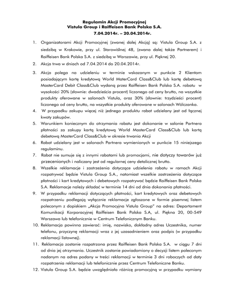 Regulamin Akcji Promocyjnej Vistula Group i Raiffeisen Bank Polska S.A. 7.04.2014r. – 20.04.2014r. 1. Organizatorami Akcji Promocyjnej (zwanej dalej Akcją) są: Vistula Group S.A. z siedzibą w Krakowie, przy ul. Starowiślnej 48, (zwana dalej także Partnerem) i Raiffeisen Bank Polska S.A. z siedzibą w Warszawie, przy ul. Pięknej 20. 2. Akcja trwa w dniach od 7.04.2014 do 20.04.2014r. 3. Akcja polega na udzieleniu w terminie wskazanym w punkcie 2 Klientom posiadającym kartę kredytową World MaterCard Class&Club lub kartę debetową MasterCard Debit Class&Club wydaną przez Raiffeisen Bank Polska S.A. rabatu w wysokości 20% (słownie: dwadzieścia procent) liczonego od ceny brutto, na wszystkie produkty oferowane w salonach Vistula, oraz 30% (słownie: trzydzieści procent) liczonego od ceny brutto, na wszystkie produkty oferowane w salonach Wólczanka. 4. W przypadku zakupu więcej niż jednego produktu rabat udzielany jest od łącznej kwoty zakupów. 5. Warunkiem koniecznym do otrzymania rabatu jest dokonanie w salonie Partnera płatności za zakupy kartą kredytową World MasterCard Class&Club lub kartą debetową MasterCard Class&Club w okresie trwania Akcji 6. Rabat udzielany jest w salonach Partnera wymienionych w punkcie 15 niniejszego regulaminu. 7. Rabat nie sumuje się z innymi rabatami lub promocjami, nie dotyczy towarów już przecenionych i naliczany jest od regularnej ceny detalicznej brutto. 8. Wszelkie reklamacje i zastrzeżenia dotyczące udzielenia rabatu w ramach Akcji rozpatrywać będzie Vistula Group S.A., natomiast wszelkie zastrzeżenia dotyczące płatności i kart kredytowych i debetowych rozpatrywać będzie Raiffeisen Bank Polska S.A. Reklamacje należy składać w terminie 14 dni od dnia dokonania płatności. 9. W przypadku reklamacji dotyczących płatności, kart kredytowych oraz debetowych rozpatrzeniu podlegają wyłącznie reklamacje zgłoszone w formie pisemnej listem poleconym z dopiskiem „Akcja Promocyjna Vistula Group” na adres: Departament Komunikacji Korporacyjnej Raiffeisen Bank Polska S.A, ul. Piękna 20, 00-549 Warszawa lub telefonicznie w Centrum Telefonicznym Banku. 10. Reklamacja powinna zawierać: imię, nazwisko, dokładny adres Uczestnika, numer telefonu, przyczynę reklamacji wraz z jej uzasadnieniem oraz podpis (w przypadku reklamacji listownej). 11. Reklamacja zostanie rozpatrzona przez Raiffeisen Bank Polska S.A. w ciągu 7 dni od dnia jej otrzymania. Uczestnik zostanie powiadomiony o decyzji listem poleconym nadanym na adres podany w treści reklamacji w terminie 3 dni roboczych od daty rozpatrzenia reklamacji lub telefonicznie przez Centrum Telefoniczne Banku. 12. Vistula Group S.A. będzie uwzględniała różnicę promocyjną w przypadku wymiany towaru zakupionego w ramach niniejszej Akcji na podstawie przepisów o sprzedaży konsumenckiej. 13. Promocja nie łączy się ze stałą zniżką obowiązującą przy płatności kartą Class&Club oraz innymi promocjami/rabatami w salonach Partnera. Rabaty nie sumują się. 14. Postanowienia niniejszego regulaminu nie naruszają prawa do reklamacji związanej z niezgodnością towaru z umową lub rękojmią. 15. Adresy salonów Partnera objętych Akcją: Centrum Handlowe Marka Miasto Adres Vistula Warszawa Galeria Mokotów ul. Wołoska 12 Vistula Warszawa CH Reduta Al. Jerozolimskie 148 Vistula Warszawa CH Promenada ul. Ostrobramska 75 Vistula Kraków ul. Szpitalna 3 Vistula Kraków ul. Piwna 24 Vistula Kraków Vistula Katowice Vistula Warszawa CH Arkadia Al. Jana Pawła II 82 Vistula Warszawa CH Blue City Al. Jerozolimskie 179 Vistula Łódź Galeria Łódzka ul. Piłsudskiego 15/23 Vistula Rzeszów Vistula Kraków CH Zakopianka ul. Zakopiańska 62 Vistula Kraków CH M1 Al. Pokoju 67 Vistula Wrocław CH Korona ul. B. Krzywoustego 126 Vistula Warszawa CH Sadyba Best Mall ul. Powsińska 31 Vistula Poznań CH King Cross Marcelin ul. Bukowska 156 V&W Gdynia CH Klif Gdynia Al. Zwycięstwa 256 Vistula Gdańsk CH Alfa ul. Kołobrzeska 41c Galeria Kazimierz ul. Podgórska 34 Al. Korfantego 1 ul. Rejtana 49/5 Vistula Kraków CH Plaza Kraków Al. Pokoju 44 Vistula Szczecin CH Galaxy Al. Wyzwolenia 18 Vistula Kielce Galeria Echo ul. Świętokrzyska 20 Vistula Bydgoszcz Galeria Pomorska ul. Fordońska 141 Vistula Warszawa CH Klif Warszawa ul. Okopowa 58/72 Vistula Warszawa CH Wola Park ul. Górczewska 124 Vistula Marki CH M1 Al. Piłsudskiego 1 Vistula Janki CH Janki ul. Mszczonowska 3 Vistula Poznań CH Plaza Poznań ul. Drużbickiego 2 Vistula Rzeszów CH Graffica ul. Lisa Kuli 19 Vistula Bielsko-Biała CH Auchan ul. Boh.Monte Casino 421 Vistula Płock CH Auchan ul. Wyszogrodzka 140 Vistula Kalisz CH Carrefour ul. Poznańska 109-131 Vistula Toruń CH Copernicus ul. Żółkiewskiego 15 Vistula Katowice CH Silesia ul. Chorzowska 107 Vistula Poznań CH Stary Browar ul. Półwiejska 32 Vistula Białystok CH Auchan ul. Produkcyjna 84 Vistula Łódź CH Manufaktura ul. Karskiego 5 Vistula Lublin Galeria Orkana ul. Orkana 6 Vistula Kraków Galeria Krakowska ul. Pawia 5 Vistula Koszalin CH Emka ul. Jana Pawła II 20 lok. 05/5 Vistula Legnica Galeria Piastów ul. Najświętszej Marii Panny 9 Vistula Warszawa CH Złote Tarasy ul. Złota 59 lok.105 Vistula Olsztyn CH Alfa Al. Marszałka Piłsudskiego 16 Vistula Wrocław CH Pasaż Grunwaldzki Pl. Grunwaldzki 22 Vistula Wrocław CH Arkady Wrocławskie ul. Powstańców Śląskich 2-4 Vistula Gorzów Wlkp. Galeria Askana ul. Konstytucji 3 Maja 102 Vistula Gdańsk Galeria Bałtycka Al. Grunwaldzka 141 Vistula Płock Galeria Wisła ul. Wyszogrodzka 144 Vistula Wrocław CH Magnolia Park ul. Legnicka 58 V&W Czeladź CH M1 ul. Będzińska 80 Vistula Białystok CH Alfa ul. Świętojańska 15 Vistula Zielona Góra CH Focus Mall ul. Wrocławska 17 Vistula Opole CH Solaris Pl. Kopernika 16 Vistula Bydgoszcz CH Focus Mall ul. Jagiellońska 39 - 47 Vistula Wrocław CH Renoma ul. Świdnicka 40 Vistula Częstochowa Galeria Jurajska Al. Wojska Polskiego 207 Vistu