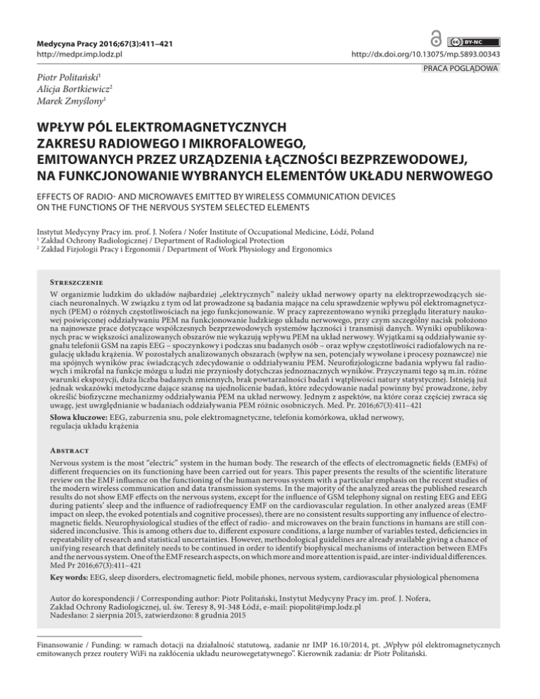 Medycyna Pracy 2016;67(3):411–421 http://medpr.imp.lodz.pl http://dx.doi.org/10.13075/mp.5893.00343 Piotr Politański1 Alicja Bortkiewicz2 Marek Zmyślony1 PRACA POGLĄDOWA WPŁYW PÓL ELEKTROMAGNETYCZNYCH ZAKRESU RADIOWEGO I MIKROFALOWEGO, EMITOWANYCH PRZEZ URZĄDZENIA ŁĄCZNOŚCI BEZPRZEWODOWEJ, NA FUNKCJONOWANIE WYBRANYCH ELEMENTÓW UKŁADU NERWOWEGO EFFECTS OF RADIO- AND MICROWAVES EMITTED BY WIRELESS COMMUNICATION DEVICES ON THE FUNCTIONS OF THE NERVOUS SYSTEM SELECTED ELEMENTS Instytut Medycyny Pracy im. prof. J. Nofera / Nofer Institute of Occupational Medicine, Łódź, Poland 1 Zakład Ochrony Radiologicznej / Department of Radiological Protection 2 Zakład Fizjologii Pracy i Ergonomii / Department of Work Physiology and Ergonomics Streszczenie W organizmie ludzkim do układów najbardziej „elektrycznych” należy układ nerwowy oparty na elektroprzewodzących sieciach neuronalnych. W związku z tym od lat prowadzone są badania mające na celu sprawdzenie wpływu pól elektromagnetycznych (PEM) o różnych częstotliwościach na jego funkcjonowanie. W pracy zaprezentowano wyniki przeglądu literatury naukowej poświęconej oddziaływaniu PEM na funkcjonowanie ludzkiego układu nerwowego, przy czym szczególny nacisk położono na najnowsze prace dotyczące współczesnych bezprzewodowych systemów łączności i transmisji danych. Wyniki opublikowanych prac w większości analizowanych obszarów nie wykazują wpływu PEM na układ nerwowy. Wyjątkami są oddziaływanie sygnału telefonii GSM na zapis EEG – spoczynkowy i podczas snu badanych osób – oraz wpływ częstotliwości radiofalowych na regulację układu krążenia. W pozostałych analizowanych obszarach (wpływ na sen, potencjały wywołane i procesy poznawcze) nie ma spójnych wyników prac świadczących zdecydowanie o oddziaływaniu PEM. Neurofizjologiczne badania wpływu fal radiowych i mikrofal na funkcje mózgu u ludzi nie przyniosły dotychczas jednoznacznych wyników. Przyczynami tego są m.in. różne warunki ekspozycji, duża liczba badanych zmiennych, brak powtarzalności badań i wątpliwości natury statystycznej. Istnieją już jednak wskazówki metodyczne dające szansę na ujednolicenie badań, które zdecydowanie nadal powinny być prowadzone, żeby określić biofizyczne mechanizmy oddziaływania PEM na układ nerwowy. Jednym z aspektów, na które coraz częściej zwraca się uwagę, jest uwzględnianie w badaniach oddziaływania PEM różnic osobniczych. Med. Pr. 2016;67(3):411–421 Słowa kluczowe: EEG, zaburzenia snu, pole elektromagnetyczne, telefonia komórkowa, układ nerwowy, regulacja układu krążenia Abstract Nervous system is the most “electric” system in the human body. The research of the effects of electromagnetic fields (EMFs) of different frequencies on its functioning have been carried out for years. This paper presents the results of the scientific literature review on the EMF influence on the functioning of the human nervous system with a particular emphasis on the recent studies of the modern wireless communication and data transmission systems. In the majority of the analyzed areas the published research results do not show EMF effects on the nervous system, except for the influence of GSM telephony signal on resting EEG and EEG during patients’ sleep and the influence of radiofrequency EMF on the cardiovascular regulation. In other analyzed areas (EMF impact on sleep, the evoked potentials and cognitive processes), there are no consistent results supporting any influence of electromagnetic fields. Neurophysiological studies of the effect of radio- and microwaves on the brain functions in humans are still considered inconclusive. This is among others due to, different exposure conditions, a large number of variables tested, deficiencies in repeatability of research and statistical uncertainties. However, methodological guidelines are already available giving a chance of unifying research that definitely needs to be continued in order to identify biophysical mechanisms of interaction between EMFs and the nervous system. One of the EMF research aspects, on which more and more attention is paid, are inter-individual differences. Med Pr 2016;67(3):411–421 Key words: EEG, sleep disorders, electromagnetic field, mobile phones, nervous system, cardiovascular physiological phenomena Autor do korespondencji / Corresponding author: Piotr Politański, Instytut Medycyny Pracy im. prof. J. Nofera, Zakład Ochrony Radiologicznej, ul. św. Teresy 8, 91-348 Łódź, e-mail: [email protected] Nadesłano: 2 sierpnia 2015, zatwierdzono: 8 grudnia 2015 Finansowanie / Funding: w ramach dotacji na działalność statutową, zadanie nr IMP 16.10/2014, pt. „Wpływ pól elektromagnetycznych emitowanych przez routery WiFi na zakłócenia układu neurowegetatywnego”. Kierownik zadania: dr Piotr Politański. 412 P. Politański i wsp. WSTĘP Pola elektromagnetyczne (PEM) są integralną częścią środowiska naturalnego człowieka. Naturalne PEM są wynikiem jonizacji zewnętrznej warstwy atmosfery, magnetycznych właściwości Ziemi, istnienia radiogwiazd i wielu innych czynników. W ostatnich dziesięcioleciach znacząco wzrosło nasycenie środowiska życia ludzi sztucznymi źródłami PEM. Wraz z rozwojem technik wykorzystujących PEM wielkiej częstotliwości – zwłaszcza do łączności (telefonia komórkowa) i celów radio- i telenadawczych – oprócz wszechobecnej ekspozycji na PEM sieciowe (50/60 Hz) pochodzące od urządzeń zasilanych prądem elektrycznym i linii energetycznych pojawia się coraz większy poziom ekspozycji na radio- i mikrofale. Obecnie wszystkie tereny zamieszkałe są pokryte sieciami łączności bezprzewodowej kilku operatorów, a w niemal każdym gospodarstwie domowym znajduje się przynajmniej jeden telefon komórkowy. Jeżeli dodatkowo uwzględnimy to, że łączność z siecią Internet jest najczęściej realizowana z użyciem routerów bezprze