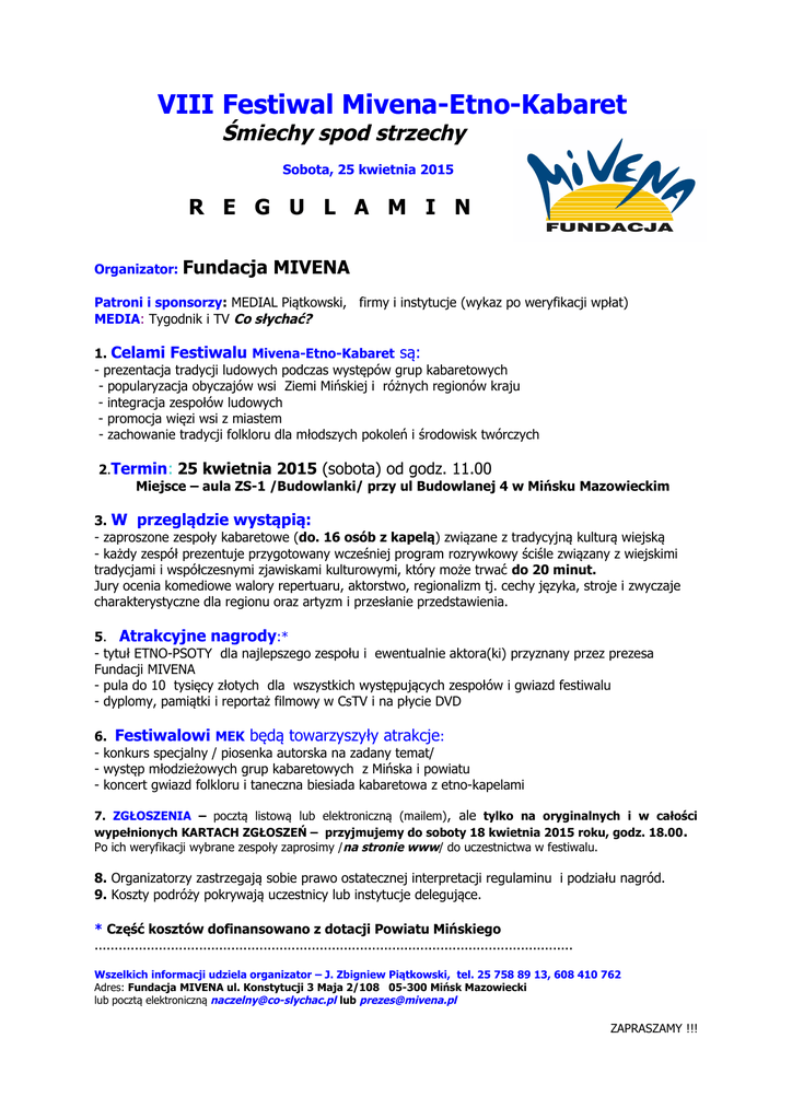 VIII Festiwal Mivena-Etno-Kabaret Śmiechy spod strzechy Sobota, 25 kwietnia 2015 R E G U L A M I N Organizator: Fundacja MIVENA Patroni i sponsorzy: MEDIAL Piątkowski, firmy i instytucje (wykaz po weryfikacji wpłat) MEDIA: Tygodnik i TV Co słychać? 1. Celami Festiwalu Mivena-Etno-Kabaret są: - prezentacja tradycji ludowych podczas występów grup kabaretowych - popularyzacja obyczajów wsi Ziemi Mińskiej i różnych regionów kraju - integracja zespołów ludowych - promocja więzi wsi z miastem - zachowanie tradycji folkloru dla młodszych pokoleń i środowisk twórczych 2.Termin: 25 kwietnia 2015 (sobota) od godz. 11.00 Miejsce – aula ZS-1 /Budowlanki/ przy ul Budowlanej 4 w Mińsku Mazowieckim 3. W przeglądzie wystąpią: - zaproszone zespoły kabaretowe (do. 16 osób z kapelą) związane z tradycyjną kulturą wiejską - każdy zespół prezentuje przygotowany wcześniej program rozrywkowy ściśle związany z wiejskimi tradycjami i współczesnymi zjawiskami kulturowymi, który może trwać do 20 minut. Jury ocenia komediowe walory repertuaru, aktorstwo, regionalizm tj. cechy języka, stroje i zwyczaje charakterystyczne dla regionu oraz artyzm i przesłanie przedstawienia. 5. Atrakcyjne nagrody:* - tytuł ETNO-PSOTY dla najlepszego zespołu i ewentualnie aktora(ki) przyznany przez prezesa Fundacji MIVENA - pula do 10 tysięcy złotych dla wszystkich występujących zespołów i gwiazd festiwalu - dyplomy, pamiątki i reportaż filmowy w CsTV i na płycie DVD 6. Festiwalowi MEK będą towarzyszyły atrakcje: - konkurs specjalny / piosenka autorska na zadany temat/ - występ młodzieżowych grup kabaretowych z Mińska i powiatu - koncert gwiazd folkloru i taneczna biesiada kabaretowa z etno-kapelami 7. ZGŁOSZENIA – pocztą listową lub elektroniczną (mailem) , ale tylko na oryginalnych i w całości wypełnionych KARTACH ZGŁOSZEŃ – przyjmujemy do soboty 18 kwietnia 2015 roku, godz. 18.00 . Po ich weryfikacji wybrane zespoły zaprosimy /na stronie www/ do uczestnictwa w festiwalu. 8. Organizatorzy zastrzegają sobie prawo ostatecznej interpretacji regulaminu i podziału nagród. 9. Koszty podróży pokrywają uczestnicy lub instytucje delegujące. * Część kosztów dofinansowano z dotacji Powiatu Mińskiego ....................................................................................................................... Wszelkich informacji udziela organizator – J. Zbigniew Piątkowski, tel. 25 758 89 13, 608 410 762 Adres: Fundacja MIVENA ul. Konstytucji 3 Maja 2/108 05-300 Mińsk Mazowiecki lub pocztą elektroniczną [email protected] lub [email protected] ZAPRASZAMY !!!
