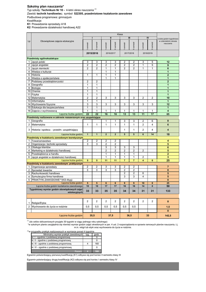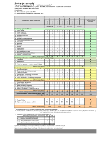 Szkolny plan nauczania* /1/ Typ szkoły: Technikum Nr 10 - 4-letni okres nauczania Zawód: technik handlowiec; symbol 522305, przedmiotowe kształcenie zawodowe Podbudowa programowa: gimnazjum Kwalifikacje: K1 Prowadzenie sprzedaży A18 K2 Prowadzenie działalności handlowej A22 Klasa I semestr I semestr II semestr IV II semestr III II semestr I semestr Obowiązkowe zajęcia edukacyjne I semestr Lp II II semestr I Liczba godzin tygodniowo w czteroletnim okresie nauczania 2015/2016 2016/2017 2017/2018 2018/2019 3 2 2 3 2 2 2 2 2 3 1 1 5 5 1 1 3 2 1 1 1 1 2 2 2 1 3 2 1 1 1 1 2 1 1 1 1 2 1 3 1 1 22 2 1 1 1 1 2 1 3 1 1 22 3 3 3 3 2 2 3 3 3 3 3 3 1 16 1 16 1 13 1 13 1 11 1 17 12 9 6 1 2 1 2 1 1 1 1 10 1 12 1 4 65 3 1 3 1 2 2 6 4 6 1 1 2 4 4 5 5 6 14 18 Przedmioty ogólnokształcące 1 2 3 4 5 6 7 8 9 10 11 12 13 14 15 16 Język polski Język angielski Język niemiecki Wiedza o kulturze Historia Wiedza o społeczeństwie Podstawy przedsiębiorczości Geografia Biologia Chemia Fizyka Matematyka Informatyka Wychowanie fizyczne Edukacja dla bezpieczeństwa Zajęcia z wychowawcą Łączna liczba godzin Przedmioty realizowane w zakresie rozszerzonym oraz uzupełniające 1 Geografia 2 Matematyka 1 1 1 1 1 1 1 1 2 2 2 3 2 3 2 2 3 2 1 1 2 2 3 2 1 1 3 2 1 1 3 2 1 1 3 Historia i społecz. - przedm. uzupełniający Łączna liczba godzin Przedmioty w kształceniu zawodowym teoretycznym 1 2 3 4 5 6 Towaroznawstwo Organizacja i techniki sprzedaży Obsługa klientów Marketing w działalności handlowej Przedsiębiorca w handlu Język angielski w działalności handlowej Łączna liczba godzin Przedmioty w kształceniu zawodowym praktycznym 1 2 3 4 5 Organizacja sprzedaży Sprzedaż towarów Rachunkowość handlowa Symulacyjna firma handlowa PRAKTYKI ZAWODOWE**(Kl3-4tyg) Łączna liczba godzin Łączna liczba godzin kształcenia zawodowego Tygodniowy wymiar godzin obowiązkowych zajęć edukacyjnych 1 Religia/Etyka 2 Wychowanie do życia w rodzinie 4 5 6 5 2 3 2 2 5 5 11 11 7 7 2 3 2 3 3 3 3 3 2 2 2 3 2 2 2 3 6 4 8 4 0 25 7 8 5 5 0 5 10 5 10 6 17 6 17 9 16 9 16 10 14 0 0 50 25 33 33 35 35 34 34 31 31 133 2 2 2 2 2 2 2 2 8 0,5 0,5 0,5 0,5 0,5 0,5 1,5 0 Łączna liczba godzin 35,5 37,5 /1/ 36,5 33 142,5 (do celów obliczeniowych przyjęto 30 tygodni w ciągu jednego roku szkolnego) *w szkolnym planie uwzględnia się również wymiar godzin zajęć określonych w par. 4 ust. 2 rozporządzenia w sprawie ramowych planów nauczania, t.j. m.in. religii lub etyki oraz wychowania do życia w rodzinie. **w przypadku praktyk realizowanych w wymiarze ponad 4 tygodnie Minimalny wymiar praktyk zawodowych tyg. godz. kl. I - zgodnie z podstawą programową 0 kl. II - zgodnie z podstawą programową 0 kl. III - zgodnie z podstawą programową 4 160 kl. IV - zgodnie z podstawą programową 0 Razem 4 160 Egzamin potwierdzający pierwszą kwalifikację (K1) odbywa się pod koniec II semestru klasy III Egzamin potwierdzający drugą kwalifikację (K2) odbywa się pod koniec I semestru klasy IV