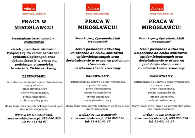 PRACA W MIROSŁAWCU! PRACA W MIROSŁAWCU! PRACA W MIROSŁAWCU! Poszukujemy Operatorów Linii Produkcyjnej! Poszukujemy Operatorów Linii Produkcyjnej! Poszukujemy Operatorów Linii Produkcyjnej! Jeżeli posiadasz aktualną książeczkę do celów sanitarno epidemiologicznych oraz doświadczenie w pracy na podobnym stanowisku to właśnie Ciebie szukamy: Jeżeli posiadasz aktualną książeczkę do celów sanitarno epidemiologicznych oraz doświadczenie w pracy na podobnym stanowisku to właśnie Ciebie szukamy: Jeżeli posiadasz aktualną książeczkę do celów sanitarno epidemiologicznych oraz doświadczenie w pracy na podobnym stanowisku to właśnie Ciebie szukamy: ZAPEWNIAMY: ZAPEWNIAMY: ZAPEWNIAMY: - zatrudnienie na umowę o pracę tymczasową, - pracę od zaraz, - pracę trzyzmianową - zatrudnienie na umowę o pracę tymczasową, - pracę od zaraz, - pracę trzyzmianową - zatrudnienie na umowę o pracę tymczasową, - pracę od zaraz, - pracę trzyzmianową - pewne wynagrodzenie, - pewne wynagrodzenie, - pewne wynagrodzenie, - premie uznaniowe, - miłą atmosferę pracy - premie uznaniowe, - miłą atmosferę pracy - premie uznaniowe, - miłą atmosferę pracy Mamy także wiele innych ciekawych ofert poleć Mamy także wiele innych ciekawych ofert poleć nas Mamy także wiele innych ciekawych ofert poleć innym znajomym. nas innym znajomym. nas innym znajomym. WYŚLIJ CV lub ZADZWOŃ: [email protected], 695 060 520 lub 91 431 42 67 WYŚLIJ CV lub ZADZWOŃ: [email protected], 695 060 520 lub 91 431 42 67 WYŚLIJ CV lub ZADZWOŃ: [email protected], 695 060 520 lub 91 431 42 67
