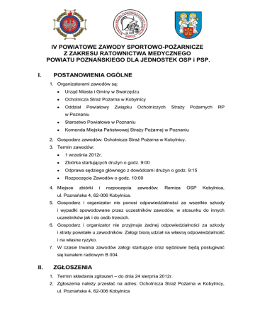 IV POWIATOWE ZAWODY SPORTOWO-POŻARNICZE Z ZAKRESU RATOWNICTWA MEDYCZNEGO POWIATU POZNAŃSKIEGO DLA JEDNOSTEK OSP i PSP. I. POSTANOWIENIA OGÓLNE 1. Organizatorami zawodów są: Urząd Miasta i Gminy w Swarzędzu Ochotnicza Straż Pożarna w Kobylnicy Oddział Powiatowy Związku Ochotniczych Straży Pożarnych RP w Poznaniu Starostwo Powiatowe w Poznaniu Komenda Miejska Państwowej Straży Pożarnej w Poznaniu 2. Gospodarz zawodów: Ochotnicza Straż Pożarna w Kobylnicy. 3. Termin zawodów: 1 września 2012r. Zbiórka startujących drużyn o godz. 9:00 Odprawa sędziego głównego z dowódcami drużyn o godz. 9:15 Rozpoczęcie Zawodów o godz. 10:00 4. Miejsce zbiórki i rozpoczęcia zawodów: Remiza OSP Kobylnica, ul. Poznańska 4, 62-006 Kobylnica. 5. Gospodarz i organizator nie ponosi odpowiedzialności za wszelkie szkody i wypadki spowodowane przez uczestników zawodów, w stosunku do innych uczestników jak i do osób trzecich. 6. Gospodarz i organizator nie przyjmuje żadnej odpowiedzialności za szkody i straty powstałe u zawodników. Załogi biorą udział na własną odpowiedzialność i na własne ryzyko. 7. W czasie trwania zawodów załogi startujące oraz sędziowie będą posługiwać się kanałem radiowym B 004. II. ZGŁOSZENIA 1. Termin składania zgłoszeń – do dnia 24 sierpnia 2012r. 2. Zgłoszenia należy przesłać na adres: Ochotnicza Straż Pożarna w Kobylnicy, ul. Poznańska 4, 62-006 Kobylnica 3. Osoba do kontaktu: Naczelnik OSP Kobylnica Druh Artur Siemaszko tel. 0 506-027-680, e-mail: [email protected] 4. Zgłoszenie powinno zawierać następujące dane: jednostka OSP lub PSP, gmina, osoba do kontaktu, skład osobowy (nazwiska i imiona), pełnione funkcje (dowódca, kierowca, przodownik, pomocnik). Wzór zgłoszenia stanowi załącznik nr 1. 5. Uczestnicy zawodów muszą być czynnymi członkami OSP/funkcjonariuszami PSP. 6. Do zawodów dopuszcza się tylko osoby posiadające aktualne badania lekarskie. 7. Dana jednostka OSP/PSP może być reprezentowana przez tylko jeden zespół. III. ZADANIA GOSPODARZA 1. Gospodarz dostarczy zastępom numery startowe, które należy umieścić w prawym dolnym rogu przedniej szyby pojazdu. 2. Gospodarz zobowiązany jest dostarczyć zastępom opisy trasy (tzw. ITINERER) i karty drogowe. IV. REGULAMIN 1. W zawodach startują pięcioosobowe lub sześcioosobowe zastępy OSP i PSP. 2. Obowiązuje jedna, ogólna klasyfikacja wszystkich zespołów. 3. Zastępy startują na własnych samochodach. 4. Przez podpisanie zgłoszenia do zawodów, zastępy zobowiązują się do całkowitego podporządkowania się przepisom regulaminu, instrukcjom i dodatkowym zarządzeniom organizatora oraz zobowiązują się nie dochodzić swoich ewentualnych roszczeń w stosunku do organizatora. 5. Zawody odbywają się na drogach publicznych na terenie gminy Swarzędz, nie jest to teren zamknięty, w związku z tym załogi obowiązuje przestrzeganie przepisów ruchu drogowego. 6. Wyposażenie z przyjętymi w sprzęt w ksrg i materiały medyczne standardami. Wyposażenie powinno zastępu być zgodne startującego w zawodach obejmuje: zestaw PSP R-1, ubranie bojowe, nosze/deska. Wyposażenie zestawu PSP R-1 będzie skontrolowane zgodnie z wytycznymi na jednej ze scenek. 7. Zawody składają się z części teoretycznej – pytania testowe oraz części praktycznej – ćwiczenia. 8. Część teoretyczną piszą 2 osoby z drużyny. Na zawodach obowiązywać będą dwa rodzaje testów: test wiedzy z zakresu ratownictwa medycznego oraz test z ogólnej wiedzy pożarniczej. 9. Całość trasy części praktycznej obejmuje 4 zróżnicowane scenki medyczne. Zakres i podstawowe informacje dotyczące rodzaju scenek zostaną przedstawione przed zawodami. 10. Przykładowa punktacja za poszczególne konkurencje praktyczne wraz ze wzorem karty oceny stanowią załącznik nr 2. 11. Popełnienie błędu krytycznego powoduje przerwanie konkurencji, wiąże się to również z nie przyznaniem punktów za daną konkurencję. Szczegóły dotyczące błędów krytycznych zostaną podane drużynom przed zawodami. 12. Na każdej ze scenek znajduje się odrębna komisja sędziowska składająca się z ratownika medycznego, strażaka OSP i strażaka PSP. 13. Na wykonanie każdego zadania wyznaczony będzie określony czas. Na 2 minuty przed końcem czasu wyznaczonego na wykonanie zadania sędzia poinformuje o tym załogę. Po upływie czasu przeznaczonego na wykonanie zadania (po znaku sędziego) zespół opuszcza miejsce zdarzenia niezależnie od zaawansowania wykonanych czynności ratowniczych. Czas jest mierzony od momentu przyjazdu zespołu na miejsce zdarzenia. 14. W trakcie dojazdu do miejsca ćwiczeń NIE WOLNO używać sygnałów świetlnodźwiękowych z wyjątkiem sytuacji gdy: W ITINERERZE (opisie trasy) znajduje się odpowiednia dyspozycja, Ich użycie jest konieczne do zabezpieczenia miejsca zdarzenia. 15. Kierowcy zespołów ratowniczych powinni zabrać ze sobą komplet dokumentów wymaganych do prowadzenia pojazdu ratowniczego. Pozostali członkowie drużyny muszą posiadać podczas zawodów legitymacje członkowskie OSP/legitymacje służbowe PSP. 16. Na trasie zawodów mogą znajdować się w podanych przez organizatora miejscach Punkty Kontroli Przejazdu. 17. Na trasie zawodów mogą znaleźć się patrole Policji mierzące prędkość oraz sprawdzające przestrzeganie przepisów kodeksu drogowego. 18. Uczestnik ponosi wszystkie konsekwencje wynikające z naruszenia zasad bezpieczeństwa ruchu drogowego, z wykluczeniem z udziału w zawodach włącznie. 19. Numery startowe zostaną wylosowane w dniu zawodów w czasie zbiórki. Losowania dokonają dowódcy drużyn. 20. Sędzia Główny zawodów decyduje o czasie startu kolejnej drużyny. Niestawienie się zespołu na starcie, po uprzednio ogłoszonej przez Sędziego decyzji startu, grozi dyskwalifikacją. 21. Podczas wykonania zadań, w czasie oceny poszkodowanego (pozorant, manekin) sędziowie udzielają inf