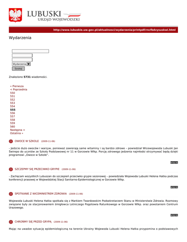 http://www.lubuskie.uw.gov.pl/aktualnosci/wydarzenia/printpdf/rncfbdvysuskwi.html Wydarzenia Wydarzenia ▼ Szukaj Znaleziono 5731 wiadomości. « Pierwsza < Poprzednia 550 551 552 553 554 555 556 557 558 559 560 Następna > Ostatnia » OWOCE W SZKOLE (2009-11-06) - Jedzcie dużo owoców i warzyw, ponieważ zawierają same witaminy i są bardzo zdrowe – powiedział Wicewojewoda Lubuski Jan Świrepo do uczniów ze Szkoły Podstawowej nr 11 w Gorzowie Wlkp. Porcję zdrowego jedzenia najmłodsi otrzymywać będą dzięki programowi „Owoce w Szkole”. więcej SZCZEPMY SIĘ PRZECIWKO GRYPIE (2009-11-06) - Zachęcam wszystkich Lubuszan do szczepień przeciwko grypie sezonowej – powiedziała Wojewoda Lubuski Helena Hatka podczas konferencji prasowej w Wojewódzkiej Stacji Sanitarno-Epidemiologicznej w Gorzowie Wlkp. więcej SPOTKANIE Z WICEMINISTREM ZDROWIA (2009-11-06) Wojewoda Lubuski Helena Hatka spotkała się z Markiem Twardowskim Podsekretarzem Stanu w Ministerstwie Zdrowia. Rozmowy związane były ze stacjonowaniem śmigłowca Lotniczego Pogotowia Ratunkowego w Gorzowie Wlkp. oraz powstaniem Centrum Urazowego. więcej CHROŃMY SIĘ PRZED GRYPĄ (2009-11-06) Mając na uwadze sytuację epidemiologiczną na terenie Ukrainy Wojewoda Lubuski Helena Hatka przypomina o podstawowych zasadach ochrony przed możliwością zarażenia wirusem grypy A/H1N1 i grypy sezonowej. więcej NARODOWY PROGRAM PRZEBUDOWY DRÓG LOKALNYCH (2009-11-06) Ruszyła kolejna edycja Narodowego Programu Przebudowy Dróg Lokalnych. Z tego tytułu Województwo Lubuskie ma do dyspozycji 46 mln złotych. Dzisiaj Wojewoda Lubuski Helena Hatka powiedziała, że w sumie wpłynęły 83 wnioski o dofinansowanie drogowych inwestycji. więcej PRZEKAZALIŚMY SWOJE DOŚWIADCZENIE (2009-11-06) Wicewojewoda Jan Świrepo wraz z delegacją z województwa lubuskiego odwiedził Republikę Mołdowy. Wizyta studyjna odbyła się w ramach projektu „Teraz Mołdowa! Lubuskie doświadczenia – europejskie szanse. II edycja”. więcej ROZMAWIANO O A-2 I S-3 (2009-11-06) - Autostrada A-2 i droga ekspresowa S-3 to obecnie najważniejsze inwestycje drogowe w Województwie Lubuskim – powiedziała Wojewoda Helena Hatka podczas konferencji prasowej poświęconej ich budowie. więcej SPOTKANIE WOJEWODÓW (2009-11-06) W Warszawie odbył się Konwent Wojewodów. W spotkaniu, które otworzył Jerzy Miller Minister Spraw Wewnętrznych i Administracji udział wzięła Wojewoda Lubuski Helena Hatka. więcej SZPITAL W SULECHOWIE BĘDZIE WIĘKSZY (2009-11-06) Wicewojewoda Jan Świrepo wziął udział w uroczystości wmurowania aktu erekcyjnego rozbudowy szpitala w Sulechowie. Inwestycja polega na dobudowaniu do istniejącego obiektu nowej części. więcej SZPITAL W SULECHOWIE BĘDZIE WIĘKSZY (2009-10-28) Wicewojewoda Jan Świrepo wziął udział w uroczystości wmurowania aktu erekcyjnego rozbudowy szpitala w Sulechowie. Inwestycja polega na dobudowaniu do istniejącego obiektu nowej części. więcej « Pierwsza < Poprzednia 550 551 552 553 554 555 556 557 558 559 560 Następna > Ostatnia »