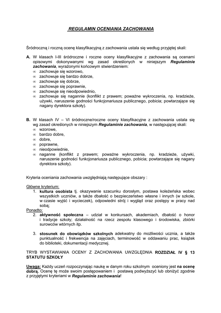 REGULAMIN OCENIANIA ZACHOWANIA Śródroczną i roczną ocenę klasyfikacyjną z zachowania ustala się według przyjętej skali: A. W klasach I-III śródroczne i roczne oceny klasyfikacyjne z zachowania są ocenami opisowymi dokonywanymi wg zasad określonych w niniejszym Regulaminie zachowania, wyrażonymi końcowym stwierdzeniem: • zachowuje się wzorowo, • zachowuje się bardzo dobrze, • zachowuje się dobrze, • zachowuje się poprawnie, • zachowuje się nieodpowiednio, • zachowuje się nagannie (konflikt z prawem; poważne wykroczenia, np. kradzieże, używki, naruszenie godności funkcjonariusza publicznego, pobicia; powtarzające się nagany dyrektora szkoły). B. W klasach IV – VI śródroczne/roczne oceny klasyfikacyjne z zachowania ustala się wg zasad określonych w niniejszym Regulaminie zachowania, w następującej skali: • wzorowe, • bardzo dobre, • dobre, • poprawne, • nieodpowiednie, • naganne (konflikt z prawem; poważne wykroczenia, np. kradzieże, używki, naruszenie godności funkcjonariusza publicznego, pobicia; powtarzające się nagany dyrektora szkoły). Kryteria oceniania zachowania uwzględniają następujące obszary : Główne kryterium: 1. kultura osobista tj. okazywanie szacunku dorosłym, postawa koleżeńska wobec wszystkich uczniów, a także dbałość o bezpieczeństwo własne i innych (w szkole, w czasie wyjść i wycieczek), odpowiedni strój i wygląd oraz postępy w pracy nad sobą; Ponadto: 2. aktywność społeczna – udział w konkursach, akademiach, dbałość o honor i tradycje szkoły; działalność na rzecz zespołu klasowego i środowiska, zbiórki surowców wtórnych itp. 3. stosunek do obowiązków szkolnych adekwatny do możliwości ucznia, a także punktualność i frekwencja na zajęciach, terminowość w oddawaniu prac, książek do biblioteki, dokumentacji medycznej. TRYB WYSTAWIANIA OCENY Z ZACHOWANIA UWZGLĘDNIA ROZDZIAŁ IV § 13 STATUTU SZKOŁY Uwaga: Każdy uczeń rozpoczynając naukę w danym roku szkolnym oceniony jest na ocenę dobrą. Ocenę tę może swoim postępowaniem i postawą podwyższyć lub obniżyć zgodnie z przyjętymi kryteriami w Regulaminie zachowania! I. Ocena wzorowa: • Kultura osobista - uczeń zawsze i wobec każdego (nauczycieli, innych osób dorosłych, a także koleżanek i kolegów) zachowuje się wzorowo, rozmawia spokojnie, grzecznie, kulturalnie; jest życzliwy, zawsze wykonuje polecenia osoby dorosłej; nigdy nie prowokuje sytuacji konfliktowych, a zauważając takie zdarzenia, niezwłocznie zgłasza ten fakt najbliższej osobie dorosłej; jest prawdomówny, nie używa wulgaryzmów; wzorowo zachowuje się w miejscach publicznych (nie śmieci, nie je w teatrze, nie niszczy …); zawsze przestrzega zasad bezpieczeństwa, prawidłowo reaguje na występujące zagrożenia - ma świadomość odpowiedzialności za bezpieczeństwo i zdrowie swoje i innych (np. w czasie przerw, wyjść poza teren szkoły, na wycieczkach); nigdy nie był widziany w okolicznościach świadczących o próbach stosowania/używania jakichkolwiek używek (alkohol, papierosy, pozostałe środki odurzające); zawsze przychodzi do szkoły w odpowiednim, schludnym stroju, zgodnym z wewnętrznymi ustaleniami placówki: regularnie nosi obuwie zmienne nie farbuje włosów nie stosuje makijażu nie maluje paznokci nosi jedynie dyskretną biżuterię przestrzega ustaleń dotyczących biżuterii na lekcjach w-f na uroczystości szkolne przychodzi zawsze w stroju galowym • Aktywność społeczna uczeń osiąga znaczące sukcesy w olimpiadach, konkursach przedmiotowych, artystycznych, współzawodnictwie sportowym; godnie reprezentuje klasę i szkołę na zewnątrz; chętnie angażuje się w życie szkoły i klas (przygotowania lub udział w uroczystościach , imprezach kulturalnych); angażuje się w zbiórkę surowców wtórnych, w akcje charytatywne, wykonywanie gazetek, pomocy dydaktycznych; wzorowo wywiązuje się z obowiązków dyżurnego; wykazuje inwencję własną w dbałości o estetykę i wystrój oraz porządek w sali lekcyjnej, na korytarzach i wokół szkoły; udziela pomocy koleżeńskiej: przekazuje rzetelne informacje choremu (chorej) pożycza zeszyty, notatki, • Stosunek do obowiązków - uczeń nie ma spóźnień ani żadnych nieusprawiedliwionych nieobecności; terminowo przynosi wychowawcy usprawiedliwienia; jest zawsze przygotowany do lekcji (przynosi wymagane przybory, materiały, odrabia zadania, jest przygotowany), sumiennie wypełnia obowiązki wynikające z funkcji pełnionej w klasie lub/i funkcji pełnionej w samorządzie szkolnym, zawsze wywiązuje się z ustalonych terminów (zwrot książek do biblioteki, ewentualnej dokumentacji medycznej, podpisy rodzica pod informacjami, sprawdzianami, zgodami itp.) II. Ocena bardzo dobra: • Kultura osobista - uczeń spełnia wszystkie wymagania jak na ocenę wzorową, • Aktywność społeczna - systematycznie i aktywnie uczestniczy w zajęciach pozalekcyjnych rozwijając swoje zdolności, zainteresowania i pasje, godnie reprezentuje szkołę, promuje ją w środowisku, uczeń angażuje się w przygotowania lub udział w uroczystościach klasowych, szkolnych lub innych imprezach kulturalnych, włącza się w organizowane akcje charytatywne, zbiórki surowców wtórnych, wykonuje prace społeczne na rzecz szkoły poza zajęciami lekcyjnymi, dba o estetykę i wystrój oraz porządek w sali lekcyjnej, na korytarzach i w obejściu szkoły, udziela pomocy koleżeńskiej uczeń przestrzega zasad bezpieczeństwa, reaguje na występujące zagrożenia (zgłasza osobie dorosłej) ma świadomość odpowiedzialności za bezpieczeństwo i zdrowie swoje i innych min. w czasie przerw, oraz wszelkiego rodzaju wyjść poza teren szkoły ( lekcje w-f, wyjścia na basen, do kina, wycieczki przedmiotowe i inne), uczeń nie był widziany w okolicznościach świadczących o próbach stosowania (używania) jakichkolwiek używek (alkohol, papierosy, pozostałe 