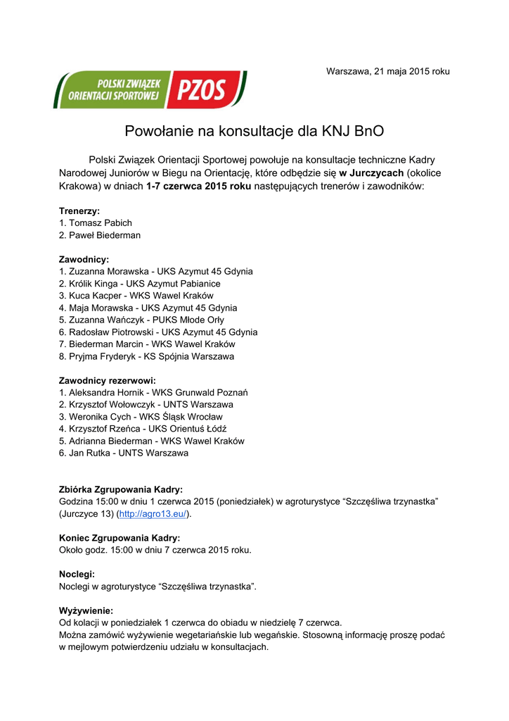 Warszawa, 21 maja 2015 roku Powołanie na konsultacje dla KNJ BnO Polski Związek Orientacji Sportowej powołuje na konsultacje techniczne Kadry Narodowej Juniorów w Biegu na Orientację, które odbędzie się w Jurczycach (okolice Krakowa) w dniach 1-7 czerwca 2015 roku następujących trenerów i zawodników: Trenerzy: 1. Tomasz Pabich 2. Paweł Biederman Zawodnicy: 1. Zuzanna Morawska - UKS Azymut 45 Gdynia 2. Królik Kinga - UKS Azymut Pabianice 3. Kuca Kacper - WKS Wawel Kraków 4. Maja Morawska - UKS Azymut 45 Gdynia 5. Zuzanna Wańczyk - PUKS Młode Orły 6. Radosław Piotrowski - UKS Azymut 45 Gdynia 7. Biederman Marcin - WKS Wawel Kraków 8. Pryjma Fryderyk - KS Spójnia Warszawa Zawodnicy rezerwowi: 1. Aleksandra Hornik - WKS Grunwald Poznań 2. Krzysztof Wołowczyk - UNTS Warszawa 3. Weronika Cych - WKS Śląsk Wrocław 4. Krzysztof Rzeńca - UKS Orientuś Łódź 5. Adrianna Biederman - WKS Wawel Kraków 6. Jan Rutka - UNTS Warszawa Zbiórka Zgrupowania Kadry: Godzina 15:00 w dniu 1 czerwca 2015 (poniedziałek) w agroturystyce “Szczęśliwa trzynastka” (Jurczyce 13) (http://agro13.eu/). Koniec Zgrupowania Kadry: Około godz. 15:00 w dniu 7 czerwca 2015 roku. Noclegi: Noclegi w agroturystyce “Szczęśliwa trzynastka”. WyŜywienie: Od kolacji w poniedziałek 1 czerwca do obiadu w niedzielę 7 czerwca. MoŜna zamówić wyŜywienie wegetariańskie lub wegańskie. Stosowną informację proszę podać w mejlowym potwierdzeniu udziału w konsultacjach. Dojazd na konsultacje i powrót: Koszty dojazdu i powrotu będą zwracane na podstawie przedstawionych biletów podróŜnych lub rozliczana na podstawie “kilometrówki”. Maksymalna kwota zwracana jednemu zawodnikowi to 100 PLN. Pozostała część kosztów transportu jest pokrywana ze środków własnych zawodnika lub jego klubu. Na wyjazd zawodnicy zobowiązani są zabrać: 1. Aktualne badania sportowo – lekarskie. 2. Sprzęt sportowy do treningów w lesie. 3. Zeszyt, długopis. 4. Kartę SI Program: 1 czerwca - poniedziałek 15:00-16:00 - przyjazd, zakwaterowanie 16:00-19:00 - trening z mapą (niepełna mapa, niska intensywność, regeneracja po zawodach) 19:00-20:00 - kolacja 20:30-22:00 - analiza map z KMP 2 czerwca - wtorek 8:00-9:00 - śniadanie 9:00-10:00 - spotkanie z zawodnikami: powitanie, omówienie planu zgrupowania 10:00-13:00 - mapą (niepełna mapa / krótkie przebiegi, średnia intensywność) 13:00-14:00 - obiad 14:00-16:00 - odpoczynek, czas wolny 16:00-19:00 - bieg z mapą (szybkie odcinki) 19:00-20:00 - kolacja 20:30-21:30 - analiza tras 3 czerwca - środa 8:00-9:00 - śniadanie 9:00-10:00 - wykład teoretyczny 10:00-13:00 - bieg z mapą (pełna mapa / dystans klasyczny / wysoka intensywność) 13:00-14:00 - obiad 14:00-16:00 - odpoczynek, czas wolny 16:00-19:00 - bieg z mapą (korytarz / niska intensywność) 19:00-20:00 - kolacja 20:00-21:00 - analiza tras 21:00-22:00 - gra pamięciowa 4 czerwca - czwartek 8:00-9:00 - śniadanie 9:00-10:00 - wykład teoretyczny 9:30-13:00 - bieg z mapą (pierwsze zmiany / wysoka intensywność) 13:00-14:00 - obiad 14:30-18:00 - wyjazd do Krakowa 18:00-19:00 - krótki trening bez mapy lub odpoczynek 19:00-20:00 - kolacja 20:00-21:00 - analiza tras 5 czerwca - piątek 8:00-9:00 - śniadanie 9:00-10:00 - czas wolny 10:00-13:00 - bieg z mapą (średni dystans / intensywność średnia lub wysoka) 13:00-14:00 - obiad 14:00-16:00 - odpoczynek, czas wolny 16:00-19:00 - bieg z mapą (praca z kompasem / niska intensywność) 19:00-20:00 - kolacja 20:00-21:30 - analiza tras, teoria biegów sprinterskich 21:00-22:00 - gra pamięciowa 6 czerwca - sobota 8:00-9:00 - śniadanie 9:00-10:00 - czas wolny lub wykład 10:00-13:00 - bieg z mapą (sprint miejski / wysoka intensywność) 13:00-14:00 - obiad 14:00-16:00 - odpoczynek, czas wolny 16:00-19:00 - bieg z mapą (praca z kompasem / niska intensywność) 19:00-20:00 - kolacja 20:00-21:00 - analiza tras 21:00-22:00 - gra pamięciowa 7 czerwca - niedziela 8:00-9:00 - śniadanie 9:00-10:00 - czas wolny 10:00-13:00 - bieg z mapą (sprint miejski / wysoka intensywność) 13:00-14:00 - obiad 14:00-14:30 - zakończenie Koszty ponoszone przez powołanych zawodników (środki klubów i własne): Zawodnicy powołani na wyjazd dopłacają do wyjazdu po 275 PLN. Opłaty za wyjazd naleŜy uiścić do dnia 26.05.2015 na konto PZOS (PEKAO SA o/Warszawa 09 1240 6218 1111 0000 4619 0314). Opłata pokrywa koszty zakwaterowania, wyŜywienia (od kolacji 1 czerwca do obiadu 7 czerwca), organizację treningów, cenę map, oraz koszty dojazdu i powrotu ze zgrupowania (do 100 PLN). Udział w zgrupowaniu naleŜy potwierdzić do dnia 27.05.2015 mejlowo u trenera kadry: [email protected] W razie pytań lub wątpliwości moŜna kontaktować się z trenerem telefonicznie pod numerem: 732-004-796. Udział w konsultacjach osób dodatkowych i trenerów zawodników: Zawodnicy z KNJ niepowołani na wyjazd, zawodnicy spoza kadry planujący kwalifikować się na EYOC i JWOC oraz trenerzy mogą zgłosić swój udział w konsultacjach pod warunkiem opłacenia wszystkich kosztów ze środków własnych lub klubowych. Nocleg i wyŜywienie będą kosztować około 80-100 PLN za osobo-dobę. Transport we własnym zakresie. Dodatkowo 5-10 PLN za mapy treningowe. Zgłoszenia proszę wysyłać mejlowo do trenera kadry (dane kontaktowe na końcu dokumentu). Podając ilość osób, kategorię wiekową oraz w jakim terminie osoby będą chciały brać udział w treningach i biegach. Tylko wcześniejsze zgłoszenie mejlowe (z wyprzedzeniem kilkudniowym) gwarantuje dostępność map na treningu. UWAGA: zawodnicy niepowołani na wyjazd muszą zapewnić sobie transport, który będzie potrzebny by dojechać na treningi. Dla zawodników powołanych na wyjazd transport zapewni trener kadry. Ilość miejsc noclegowych w agroturystyce “Szczęśliwa trzynastka” jest ograniczona (max 20 osób), decyduje kolejność zgłoszeń. MoŜna równieŜ zakwaterować się w innym miejscu, na 