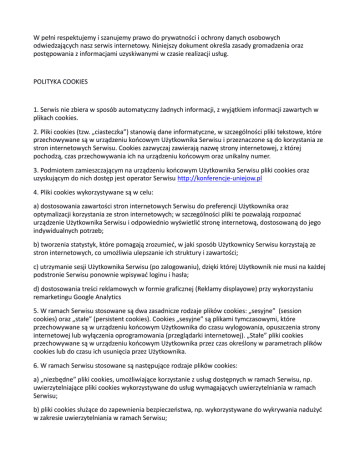 W pełni respektujemy i szanujemy prawo do prywatności i ochrony danych osobowych odwiedzających nasz serwis internetowy. Niniejszy dokument określa zasady gromadzenia oraz postępowania z informacjami uzyskiwanymi w czasie realizacji usług. POLITYKA COOKIES 1. Serwis nie zbiera w sposób automatyczny żadnych informacji, z wyjątkiem informacji zawartych w plikach cookies. 2. Pliki cookies (tzw. „ciasteczka”) stanowią dane informatyczne, w szczególności pliki tekstowe, które przechowywane są w urządzeniu końcowym Użytkownika Serwisu i przeznaczone są do korzystania ze stron internetowych Serwisu. Cookies zazwyczaj zawierają nazwę strony internetowej, z której pochodzą, czas przechowywania ich na urządzeniu końcowym oraz unikalny numer. 3. Podmiotem zamieszczającym na urządzeniu końcowym Użytkownika Serwisu pliki cookies oraz uzyskującym do nich dostęp jest operator Serwisu http://konferencje-uniejow.pl 4. Pliki cookies wykorzystywane są w celu: a) dostosowania zawartości stron internetowych Serwisu do preferencji Użytkownika oraz optymalizacji korzystania ze stron internetowych; w szczególności pliki te pozwalają rozpoznać urządzenie Użytkownika Serwisu i odpowiednio wyświetlić stronę internetową, dostosowaną do jego indywidualnych potrzeb; b) tworzenia statystyk, które pomagają zrozumieć, w jaki sposób Użytkownicy Serwisu korzystają ze stron internetowych, co umożliwia ulepszanie ich struktury i zawartości; c) utrzymanie sesji Użytkownika Serwisu (po zalogowaniu), dzięki której Użytkownik nie musi na każdej podstronie Serwisu ponownie wpisywać loginu i hasła; d) dostosowania treści reklamowych w formie graficznej (Reklamy displayowe) przy wykorzystaniu remarketingu Google Analytics 5. W ramach Serwisu stosowane są dwa zasadnicze rodzaje plików cookies: „sesyjne” (session cookies) oraz „stałe” (persistent cookies). Cookies „sesyjne” są plikami tymczasowymi, które przechowywane są w urządzeniu końcowym Użytkownika do czasu wylogowania, opuszczenia strony internetowej lub wyłączenia oprogramowania (przeglądarki internetowej). „Stałe” pliki cookies przechowywane są w urządzeniu końcowym Użytkownika przez czas określony w parametrach plików cookies lub do czasu ich usunięcia przez Użytkownika. 6. W ramach Serwisu stosowane są następujące rodzaje plików cookies: a) „niezbędne” pliki cookies, umożliwiające korzystanie z usług dostępnych w ramach Serwisu, np. uwierzytelniające pliki cookies wykorzystywane do usług wymagających uwierzytelniania w ramach Serwisu; b) pliki cookies służące do zapewnienia bezpieczeństwa, np. wykorzystywane do wykrywania nadużyć w zakresie uwierzytelniania w ramach Serwisu; c) „wydajnościowe” pliki cookies, umożliwiające zbieranie informacji o sposobie korzystania ze stron internetowych Serwisu; d) „funkcjonalne” pliki cookies, umożliwiające „zapamiętanie” wybranych przez Użytkownika ustawień i personalizację interfejsu Użytkownika, np. w zakresie wybranego języka lub regionu, z którego pochodzi Użytkownik, rozmiaru czcionki, wyglądu strony internetowej itp.; e) „reklamowe” pliki cookies, umożliwiające dostarczanie Użytkownikom treści reklamowych bardziej dostosowanych do ich zainteresowań. 7. W wielu przypadkach oprogramowanie służące do przeglądania stron internetowych (przeglądarka internetowa) domyślnie dopuszcza przechowywanie plików cookies w urządzeniu końcowym Użytkownika. Użytkownicy Serwisu mogą dokonać w każdym czasie zmiany ustawień dotyczących plików cookies. Ustawienia te mogą zostać zmienione w szczególności w taki sposób, aby blokować automatyczną obsługę plików cookies w ustawieniach przeglądarki internetowej bądź informować o ich każdorazowym zamieszczeniu w urządzeniu Użytkownika Serwisu. Szczegółowe informacje o możliwości i sposobach obsługi plików cookies dostępne są w ustawieniach oprogramowania (przeglądarki internetowej). Użytkownicy mogą zablokować usługę Analytics dla reklam displayowych oraz dostosowywać reklamy w sieci reklamowej Google w Menedżerze preferencji reklam. Można również pobrać program blokujący Google Analytics ze strony https://tools.google.com/dlpage/gaoptout/ 8. Operator Serwisu informuje, że ograniczenia stosowania plików cookies mogą wpłynąć na niektóre funkcjonalności dostępne na stronach internetowych Serwisu. 9. Pliki cookies zamieszczane w urządzeniu końcowym Użytkownika Serwisu i wykorzystywane mogą być również przez współpracujących z operatorem Serwisu reklamodawców oraz partnerów. 10. Więcej informacji na temat plików cookies dostępnych jest pod adresem http://wszystkoociasteczkach.pl lub w sekcji „Pomoc” w menu przeglądarki internetowej.