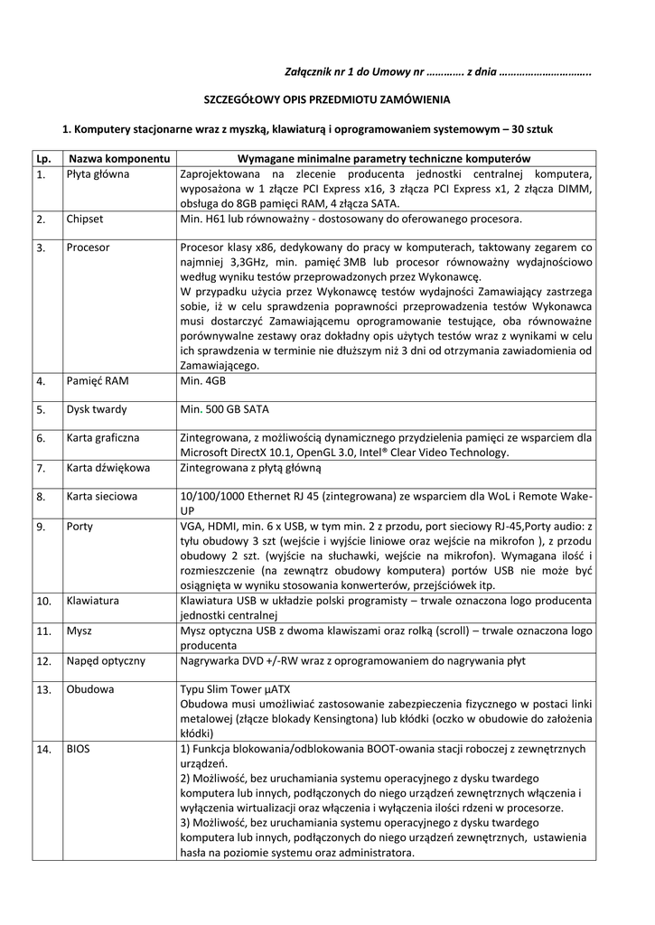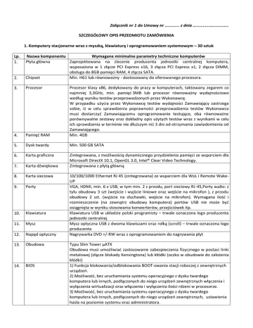 Załącznik nr 1 do Umowy nr …………. z dnia ………………………….. SZCZEGÓŁOWY OPIS PRZEDMIOTU ZAMÓWIENIA 1. Komputery stacjonarne wraz z myszką, klawiaturą i oprogramowaniem systemowym – 30 sztuk Lp. 1. 2. Nazwa komponentu Wymagane minimalne parametry techniczne komputerów Płyta główna Zaprojektowana na zlecenie producenta jednostki centralnej komputera, wyposażona w 1 złącze PCI Express x16, 3 złącza PCI Express x1, 2 złącza DIMM, obsługa do 8GB pamięci RAM, 4 złącza SATA. Chipset Min. H61 lub równoważny - dostosowany do oferowanego procesora. 3. Procesor 4. Pamięć RAM Procesor klasy x86, dedykowany do pracy w komputerach, taktowany zegarem co najmniej 3,3GHz, min. pamięć 3MB lub procesor równoważny wydajnościowo według wyniku testów przeprowadzonych przez Wykonawcę. W przypadku użycia przez Wykonawcę testów wydajności Zamawiający zastrzega sobie, iż w celu sprawdzenia poprawności przeprowadzenia testów Wykonawca musi dostarczyć Zamawiającemu oprogramowanie testujące, oba równoważne porównywalne zestawy oraz dokładny opis użytych testów wraz z wynikami w celu ich sprawdzenia w terminie nie dłuższym niż 3 dni od otrzymania zawiadomienia od Zamawiającego. Min. 4GB 5. Dysk twardy Min. 500 GB SATA 6. Karta graficzna 7. Karta dźwiękowa Zintegrowana, z możliwością dynamicznego przydzielenia pamięci ze wsparciem dla Microsoft DirectX 10.1, OpenGL 3.0, Intel® Clear Video Technology. Zintegrowana z płytą główną 8. Karta sieciowa 9. Porty 10. Klawiatura 11. Mysz 12. Napęd optyczny 13. Obudowa 14. BIOS 10/100/1000 Ethernet RJ 45 (zintegrowana) ze wsparciem dla WoL i Remote WakeUP VGA, HDMI, min. 6 x USB, w tym min. 2 z przodu, port sieciowy RJ-45,Porty audio: z tyłu obudowy 3 szt (wejście i wyjście liniowe oraz wejście na mikrofon ), z przodu obudowy 2 szt. (wyjście na słuchawki, wejście na mikrofon). Wymagana ilość i rozmieszczenie (na zewnątrz obudowy komputera) portów USB nie może być osiągnięta w wyniku stosowania konwerterów, przejściówek itp. Klawiatura USB w układzie polski programisty – trwale oznaczona logo producenta jednostki centralnej Mysz optyczna USB z dwoma klawiszami oraz rolką (scroll) – trwale oznaczona logo producenta Nagrywarka DVD +/-RW wraz z oprogramowaniem do nagrywania płyt Typu Slim Tower µATX Obudowa musi umożliwiać zastosowanie zabezpieczenia fizycznego w postaci linki metalowej (złącze blokady Kensingtona) lub kłódki (oczko w obudowie do założenia kłódki) 1) Funkcja blokowania/odblokowania BOOT-owania stacji roboczej z zewnętrznych urządzeń. 2) Możliwość, bez uruchamiania systemu operacyjnego z dysku twardego komputera lub innych, podłączonych do niego urządzeń zewnętrznych włączenia i wyłączenia wirtualizacji oraz włączenia i wyłączenia ilości rdzeni w procesorze. 3) Możliwość, bez uruchamiania systemu operacyjnego z dysku twardego komputera lub innych, podłączonych do niego urządzeń zewnętrznych, ustawienia hasła na poziomie systemu oraz administratora. 4) Możliwość bez uruchamiania systemu operacyjnego z dysku twardego komputera lub innych, podłączonych do niego urządzeń zewnętrznych włączenia i wyłączenia Wake on Lan z poziomu BIOS. 5) Możliwość włączenia/wyłączenia zintegrowanej karty dźwiękowej, karty sieciowej oraz kontrolera USB z poziomu BIOS, bez uruchamiania systemu operacyjnego z dysku twardego komputera lub innych, podłączonych do niego, urządzeń zewnętrznych. 6) Możliwość wyłączenia trybu bootowania dla urządzeń podłączanych do USB, czyli podczas startu komputer nie wykrywa urządzeń bootujących typu USB, natomiast po uruchomieniu systemu operacyjnego porty USB są aktywne. 15. 16. 17. 18. System operacyjny Microsoft Windows 7 Professional PL z SP1 64-bit, zainstalowany system operacyjny nie wymagający aktywacji za pomocą telefonu lub Internetu w firmie Microsoft. Dołączony nośnik z oprogramowaniem. Certyfikaty Certyfikat ISO 9001 dla producenta sprzętu. i standardy Oferowane modele komputerów muszą posiadać certyfikat Microsoft, potwierdzający poprawną współpracę oferowanych modeli komputerów z ww. systemem operacyjnym Windows 7. Deklaracja zgodności CE. Gwarancja 24 miesiące na miejscu u Zamawiającego. Czas reakcji serwisu - do końca następnego dnia roboczego. W przypadku awarii dysków twardych dysk pozostaje u Zamawiającego. Wsparcie techniczne Możliwość telefonicznego sprawdzenia konfiguracji sprzętowej komputera oraz warunków gwarancji po podaniu numeru seryjnego bezpośrednio u producenta lub producenta jego przedstawiciela. Dostęp do najnowszych sterowników i uaktualnień na stronie producenta zestawu realizowany poprzez podanie na dedykowanej stronie internetowej producenta numeru seryjnego lub modelu komputera – wraz z dostawą przedmiotu zamówienia Wykonawca zobowiązany jest dostarczyć Zamawiającemu link strony. 2. Monitory LCD – 30 sztuk. Lp. Nazwa komponentu Typ ekranu 1. 2. Rozmiar plamki 3. Jasność 4. Kontrast 5. Kąty widzenia (pion/poziom) 6. Czas reakcji matrycy 7. Rozdzielczość maksymalna 8. Powłoka powierzchni ekranu 9. Podświetlenie matrycy 10. Zużycie energii 11. Bezpieczeństwo Wymagane minimalne parametry techniczne monitora Ekran ciekłokrystaliczny z aktywną matrycą TFT 21,5” e-IPS. Max. 0,247 mm. Min. 250 cd/m2. 1000:1, dynamiczny 2 000 000:1 Min. 170/170 stopni. Max. 8ms. 1920 x 1080 przy 60Hz (16:9) Antyodblaskowa LED Max. 70W, typowo 30W, czuwania mniej niż 0,5W Monitor musi być wyposażony w tzw. Kensington Slot 12. Złącze 13. Gwarancja 14. Certyfikaty 15. Inne 15-stykowe złącze D-Sub, złącze DVI z HDCP. 24 miesiące na miejscu u Zamawiającego Czas reakcji serwisu - do końca następnego dnia roboczego Gwarancja zero martwych pikseli TCO 5.2, ISO 13406-2 lub ISO 9241, EPEAT Gold, Energy Star 5.1 Monitor musi posiadać trwałe oznaczenie logo producenta jednostki centralnej Podłączone
