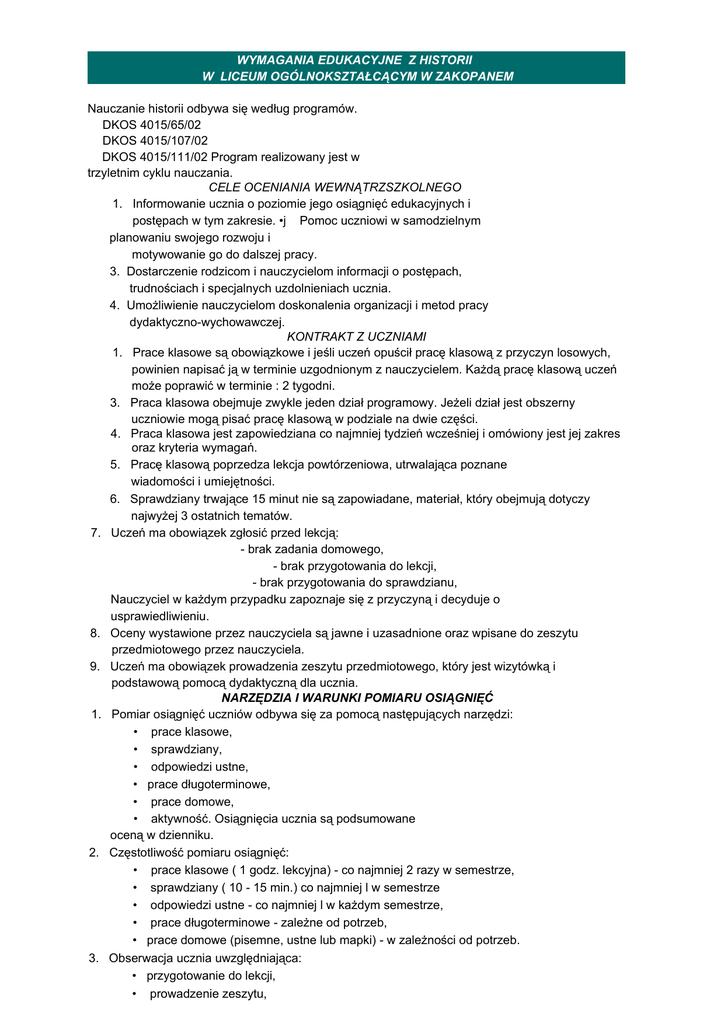 WYMAGANIA EDUKACYJNE Z HISTORII W LICEUM OGÓLNOKSZTAŁCĄCYM W ZAKOPANEM Nauczanie historii odbywa się według programów. DKOS 4015/65/02 DKOS 4015/107/02 DKOS 4015/111/02 Program realizowany jest w trzyletnim cyklu nauczania. CELE OCENIANIA WEWNĄTRZSZKOLNEGO 1. Informowanie ucznia o poziomie jego osiągnięć edukacyjnych i postępach w tym zakresie. •j Pomoc uczniowi w samodzielnym planowaniu swojego rozwoju i motywowanie go do dalszej pracy. 3. Dostarczenie rodzicom i nauczycielom informacji o postępach, trudnościach i specjalnych uzdolnieniach ucznia. 4. Umożliwienie nauczycielom doskonalenia organizacji i metod pracy dydaktyczno-wychowawczej. KONTRAKT Z UCZNIAMI 1. Prace klasowe są obowiązkowe i jeśli uczeń opuścił pracę klasową z przyczyn losowych, powinien napisać ją w terminie uzgodnionym z nauczycielem. Każdą pracę klasową uczeń może poprawić w terminie : 2 tygodni. 3. Praca klasowa obejmuje zwykle jeden dział programowy. Jeżeli dział jest obszerny uczniowie mogą pisać pracę klasową w podziale na dwie części. 4. Praca klasowa jest zapowiedziana co najmniej tydzień wcześniej i omówiony jest jej zakres oraz kryteria wymagań. 5. Pracę klasową poprzedza lekcja powtórzeniowa, utrwalająca poznane wiadomości i umiejętności. 6. Sprawdziany trwające 15 minut nie są zapowiadane, materiał, który obejmują dotyczy najwyżej 3 ostatnich tematów. 7. Uczeń ma obowiązek zgłosić przed lekcją: - brak zadania domowego, - brak przygotowania do lekcji, - brak przygotowania do sprawdzianu, Nauczyciel w każdym przypadku zapoznaje się z przyczyną i decyduje o usprawiedliwieniu. 8. Oceny wystawione przez nauczyciela są jawne i uzasadnione oraz wpisane do zeszytu przedmiotowego przez nauczyciela. 9. Uczeń ma obowiązek prowadzenia zeszytu przedmiotowego, który jest wizytówką i podstawową pomocą dydaktyczną dla ucznia. NARZĘDZIA I WARUNKI POMIARU OSIĄGNIĘĆ 1. Pomiar osiągnięć uczniów odbywa się za pomocą następujących narzędzi: • prace klasowe, • sprawdziany, • odpowiedzi ustne, • prace długoterminowe, • prace domowe, • aktywność. Osiągnięcia ucznia są podsumowane oceną w dzienniku. 2. Częstotliwość pomiaru osiągnięć: • prace klasowe ( 1 godz. lekcyjna) - co najmniej 2 razy w semestrze, • sprawdziany ( 10 - 15 min.) co najmniej l w semestrze • odpowiedzi ustne - co najmniej l w każdym semestrze, • prace długoterminowe - zależne od potrzeb, • prace domowe (pisemne, ustne lub mapki) - w zależności od potrzeb. 3. Obserwacja ucznia uwzględniająca: • przygotowanie do lekcji, • prowadzenie zeszytu, • wypowiedzi na lekcji, • praca w grupie, • posługiwanie się pomocami naukowymi ( mapy, tablice graficzne, atlasy, słowniki itp.) Oceny są wystawiane na bieżąco i wpisywane do dziennika. 4. Inne formy aktywności: • wykonywanie albumów, plakatów, makiet, pomocy naukowych, • udział w konkursach, • udział w widowiskach, przedstawieniach historycznych i wieczornicach. Oceny za powyższe prace są wpisywane osobno i traktowane jako wykonywanie wymagań edukacyjnych w poziomie ponadpodstawowym. OCENA BIEŻĄCA IJEJ KRYTERIA 1. Do ustalenia oceny stosuje się skalę: 6 - celujący 5 - bardzo dobry 4 - dobry 3 - dostateczny 2 - dopuszczający l - niedostateczny Oceny mogą być różnicowane dodatkowo poprzez stosowanie znaków „+" i „-". Dopuszcza się stosowanie znaku O w razie nieobecności ucznia. 2. Kryteria ocen: WYPOWIEDZI USTNE. Oceniana jest zawartość rzeczowa, umiejętność formułowania myśli, stosowanie terminologii historycznej, zgodność z poziomem wymagań, umiejętność ilustrowania wypowiedzi poprzez wykorzystanie pomocy naukowych (mapy, tablice graficzne) itp. • celujący - odpowiedź wskazuje na szczególne zainteresowanie przedmiotem, spełniając kryteria oceny bardzo dobrej, wykracza poza obowiązujący program nauczania, zawiera treści pozaprogramowe - własne przemyślenia i oceny, • bardzo dobry - odpowiedź wyczerpująca, zgodna z programem, swobodne operowanie faktami i dostrzeganie związków między nimi, • dobry - odpowiedź zasadniczo samodzielna, zawiera większość wymaganych treści, poprawna pod względem języka, nieliczne błędy, nie wyczerpuje jednak zagadnienia, • dostateczny - uczeń zna najważniejsze fakty, umie je zinterpretować, odpowiedź odbywa się przy niewielkiej pomocy nauczyciela, występują nieliczne błędy rzeczowe, • dopuszczający - niezbyt precyzyjne odpowiedzi na pytania nauczyciela, braki w wiadomościach i umiejętnościach, podanie nazwy zjawiska lub procesu przy pomocy nauczyciela, • niedostateczny - nie potrafi rozwiązać zadań teoretycznych lub praktycznych o elementarnym stopniu trudności nawet z pomocą nauczyciela, nie udziela odpowiedzi na większość pytań zadanych przez nauczyciela, ma braki w wiadomościach koniecznych PRACE PISEMNE. • sprawdziany składają się z kilku krótkich pytań, pytania są punktowane, • prace klasowe zawierają kilka lub kilkanaście pytań bądź też są w formie testu, testy zawierają zadania otwarte lub zamknięte, którym jest przyporządkowana określona liczba punktów, Prace klasowe i sprawdziany są oceniane zgodnie z wymaganą ilością punktów na daną ocenę. Sposób wystawiania oceny: 80 - 100% - bardzo dobry 60 - 79% - dobry 40- 59% - dostateczny 30 - 39% - dopuszczający 0 - 29% - niedostateczny I prace długoterminowe Przy ustaleniu oceny brane są pod uwagę: sposób zaplanowania, samodzielność, wartość merytoryczna, umiejętność prezentacji wyników, oryginalność pomysłowość, estetyka wykonania, kompletność, możliwości ucznia. II prace domowe Ocenie podlegają: pomysłowość rozwiązania, poprawność rzeczowa, umiejętność prezentacji (w przypadku prac ustnych), zgodność z poziomem wymagań. III praca w grupie Bierze się pod uwagę: precyzyjność, stopień zaangażowania, efektywność, czas jej wykonani