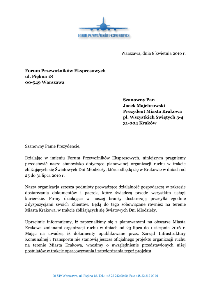 Warszawa, dnia 8 kwietnia 2016 r. Forum Przewoźników Ekspresowych ul. Piękna 18 00-549 Warszawa Szanowny Pan Jacek Majchrowski Prezydent Miasta Krakowa pl. Wszystkich Świętych 3-4 31-004 Kraków Szanowny Panie Prezydencie, Działając w imieniu Forum Przewoźników Ekspresowych, niniejszym pragniemy przedstawić nasze stanowisko dotyczące planowanej organizacji ruchu w trakcie zbliżających się Światowych Dni Młodzieży, które odbędą się w Krakowie w dniach od 25 do 31 lipca 2016 r. Nasza organizacja zrzesza podmioty prowadzące działalność gospodarczą w zakresie dostarczania dokumentów i paczek, które świadczą przede wszystkim usługi kurierskie. Firmy działające w naszej branży dostarczają przesyłki zgodnie z dyspozycjami swoich Klientów. Będą do tego zobowiązane również na terenie Miasta Krakowa, w trakcie zbliżających się Światowych Dni Młodzieży. Uprzejmie informujemy, iż zapoznaliśmy się z planowanymi na obszarze Miasta Krakowa zmianami organizacji ruchu w dniach od 23 lipca do 1 sierpnia 2016 r. Mając na uwadze, iż dokumenty opublikowane przez Zarząd Infrastruktury Komunalnej i Transportu nie stanowią jeszcze oficjalnego projektu organizacji ruchu na terenie Miasta Krakowa, wnosimy o uwzględnienie przedstawionych niżej postulatów w trakcie opracowywania i zatwierdzania tegoż projektu. 00-549 Warszawa, ul. Piękna 18, Tel.: +48 22 212 00 00; Fax: +48 22 212 00 01 W ocenie Forum Przewoźników Ekspresowych, najbardziej zasadnym rozwiązaniem jest uwzględnienie pojazdów obsługiwanych przez firmy kurierskie w treści projektu organizacji ruchu jako pojazdów upoważnionych do wjazdu na teren obszarów zamkniętych (Błonie, Łagiewniki) oraz obszarów ograniczenia ruchu (Strefa I, II, III). Za powyższym stanowiskiem przemawia fakt, iż firmy kurierskie dostarczają również przesyłki specjalnego przeznaczenia obejmujące dokumentację należącą do administracji rządowej, samorządowej czy pocztę dyplomatyczną, również na obszarze stref ograniczenia ruchu, niejednokrotnie działając w charakterze operatorów pocztowych (na podstawie wpisu do Rejestru Operatorów Pocztowych prowadzonego przez Prezesa Urzędu Komunikacji Elektronicznej). Podkreślenia wymaga fakt, iż przesyłki dostarczane przez firmy kurierskie obejmują także artykuły ulegające szybkiemu zepsuciu. Nade wszystko należy mieć na uwadze, iż firmy kurierskie zaopatrują również szpitale i zakłady opieki zdrowotnej. Przykładowo, jeden z członków naszego Związku – firma OCS Overseas Courier Service - świadczy usługi logistyki badań klinicznych. W ramach usługi Time-Critical-Express 24/7/365 firma odbiera, a następnie dostarcza często niepowtarzalne próbki biologiczne, leki oraz szczepionki, które ratują życie pacjentom. W naszym przekonaniu organ zarządzający organizacją ruchu drogowego, powinien wziąć pod uwagę wskazane wyżej okoliczności ustalając strefy ograniczenia ruchu na czas Światowych Dni Młodzieży. W ocenie Forum Przewoźników Ekspresowych ewentualną alternatywę dla włączenia pojazdów firm kurierskich do projektu organizacji, mogą stanowić zezwolenia na wjazd. W toku konsultacji w ramach naszego Związku, niżej wskazane podmioty przedstawiły dotychczas zapotrzebowanie na wydanie łącznie 426 tychże zezwoleń, w przypadku wyboru tej opcji postępowania: UPS – 50 zezwoleń, DHL – 80 zezwoleń, GLS – 50 zezwoleń, TNT – 60 zezwoleń, Fedex – 50 zezwoleń, OCS – 5 zezwoleń, AGAP – 7 zezwoleń, DPD – 120 zezwoleń, Xpress Couriers – 4 zezwolenia. Prosimy o udzielenie informacji co do przewidywanej liczby zezwoleń dla firm kurierskich oraz w zakresie procedury wydawania takich zezwoleń, w przypadku wyboru tej opcji postępowania. Jako Forum Przewoźników Ekspresowych proponujemy również powołanie w strukturach Zarządu Infrastruktury Komunalnej i Transportu w Krakowie koordynatora ds. kontaktu z firmami kurierskimi. Jednocześnie postulujemy o włączenie – w charakterze konsultanta – przedstawiciela firm kurierskich do udziału w pracach nad projektem organizacji ruchu. Proponujemy zorganizowanie spotkania 00-549 Warszawa, ul. Piękna 18, Tel.: +48 22 212 00 00; Fax: +48 22 212 00 01 w siedzibie Zarządu Infrastruktury Komunalnej i Transportu w Krakowie, na którym omówione zostałyby ww. propozycje oraz inne wątpliwości związane z włączeniem pojazdów firm kurierskich do stref ograniczonego ruchu w Krakowie. Równocześnie wdrożenie procedury wymiany danych, w ramach której firmy kurierskie mogłyby otrzymywać oficjalne i potwierdzone informacje dotyczące organizacji ruchu, na podstawie których możliwe byłoby budowanie planów operacyjnych przez firmy. Mamy świadomość wielości i złożoności problemów organizacyjnych, przed którymi staje Miasto Kraków w perspektywie organizacji Światowych Dni Młodzieży. Ufamy jednak, iż uda nam się wspólnie podjąć działania, których realizacja będzie satysfakcjonująca dla obu stron. Z poważaniem, Wojciech Arszewski Prezes Zarządu Forum Przewoźników Ekspresowych Do wiadomości: Szanowny Pan Tadeusz Trzmiel I Zastępca Prezydenta Miasta Krakowa ds. Inwestycji i Infrastruktury 00-549 Warszawa, ul. Piękna 18, Tel.: +48 22 212 00 00; Fax: +48 22 212 00 01
