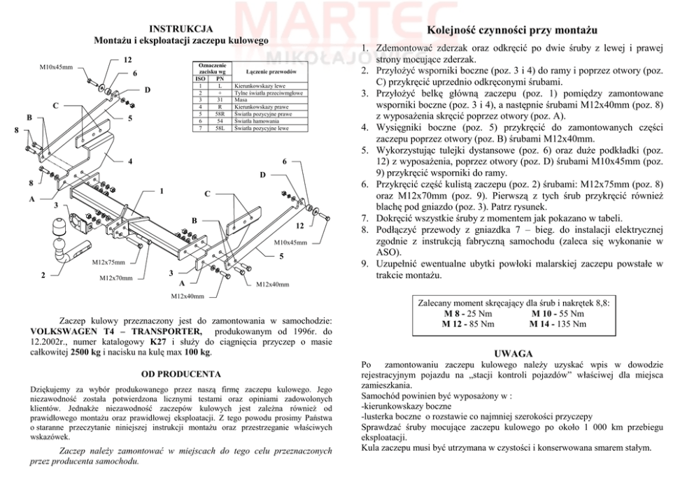 INSTRUKCJA MontaŜu i eksploatacji zaczepu kulowego 12 M10x45mm Oznaczenie zacisku wg ISO PN 1 L 2 + 3 31 4 R 5 58R 6 54 7 58L 6 D C B 5 8 Kolejność czynności przy montaŜu Łączenie przewodów Kierunkowskazy lewe Tylne światła przeciwmgłowe Masa Kierunkowskazy prawe Światła pozycyjne prawe Światła hamowania Światła pozycyjne lewe 4 6 D 8 1 A C 3 B 12 M10x45mm 5 M12x75mm 2 M12x70mm 3 A 1. Zdemontować zderzak oraz odkręcić po dwie śruby z lewej i prawej strony mocujące zderzak. 2. PrzyłoŜyć wsporniki boczne (poz. 3 i 4) do ramy i poprzez otwory (poz. C) przykręcić uprzednio odkręconymi śrubami. 3. PrzyłoŜyć belkę główną zaczepu (poz. 1) pomiędzy zamontowane wsporniki boczne (poz. 3 i 4), a następnie śrubami M12x40mm (poz. 8) z wyposaŜenia skręcić poprzez otwory (poz. A). 4. Wysięgniki boczne (poz. 5) przykręcić do zamontowanych części zaczepu poprzez otwory (poz. B) śrubami M12x40mm. 5. Wykorzystując tulejki dystansowe (poz. 6) oraz duŜe podkładki (poz. 12) z wyposaŜenia, poprzez otwory (poz. D) śrubami M10x45mm (poz. 9) przykręcić wsporniki do ramy. 6. Przykręcić część kulistą zaczepu (poz. 2) śrubami: M12x75mm (poz. 8) oraz M12x70mm (poz. 9). Pierwszą z tych śrub przykręcić równieŜ blachę pod gniazdo (poz. 3). Patrz rysunek. 7. Dokręcić wszystkie śruby z momentem jak pokazano w tabeli. 8. Podłączyć przewody z gniazdka 7 – bieg. do instalacji elektrycznej zgodnie z instrukcją fabryczną samochodu (zaleca się wykonanie w ASO). 9. Uzupełnić ewentualne ubytki powłoki malarskiej zaczepu powstałe w trakcie montaŜu. M12x40mm M12x40mm Zaczep kulowy przeznaczony jest do zamontowania w samochodzie: VOLKSWAGEN T4 – TRANSPORTER, produkowanym od 1996r. do 12.2002r., numer katalogowy K27 i słuŜy do ciągnięcia przyczep o masie całkowitej 2500 kg i nacisku na kulę max 100 kg. OD PRODUCENTA Dziękujemy za wybór produkowanego przez naszą firmę zaczepu kulowego. Jego niezawodność została potwierdzona licznymi testami oraz opiniami zadowolonych klientów. JednakŜe niezawodność zaczepów kulowych jest zaleŜna równieŜ od prawidłowego montaŜu oraz prawidłowej eksploatacji. Z tego powodu prosimy Państwa o staranne przeczytanie niniejszej instrukcji montaŜu oraz przestrzeganie właściwych wskazówek. Zaczep naleŜy zamontować w miejscach do tego celu przeznaczonych przez producenta samochodu. Zalecany moment skręcający dla śrub i nakrętek 8,8: M 8 - 25 Nm M 10 - 55 Nm M 12 - 85 Nm M 14 - 135 Nm UWAGA Po zamontowaniu zaczepu kulowego naleŜy uzyskać wpis w dowodzie rejestracyjnym pojazdu na „stacji kontroli pojazdów” właściwej dla miejsca zamieszkania. Samochód powinien być wyposaŜony w : -kierunkowskazy boczne -lusterka boczne o rozstawie co najmniej szerokości przyczepy Sprawdzać śruby mocujące zaczepu kulowego po około 1 000 km przebiegu eksploatacji. Kula zaczepu musi być utrzymana w czystości i konserwowana smarem stałym. PPUH AUTO-HAK S.J. WyposaŜenie zaczepu: Produkcja Haków Holowniczych Henryk & Zbigniew Nejman 76-200 SŁUPSK ul. Słoneczna 16K tel/fax (059) 8-414-414; 8-414-413 E-mail: [email protected] www. autohak.com.pl Zaczep kulowy bez wyposaŜenia elektrycznego Klasa: A50-X Nr kat. K27 Przeznaczony do zamontowania w samochodzie: Producent: VOLKSWAGEN Model: T4-TRANSPORTER produkowanym od 1996r. do 12.2002r. Dane techniczne: wartość siły D: 12,3 kN maksymalna masa przyczepy: 2500 kg maksymalny nacisk na kulę: 100 kg Numer homologacji zgodnie z wytycznymi regulaminu EKG/ONZ 55.01: E20-55R-01 0769 KARTA GWARANCYJNA Producent udziela gwarancji niniejszą kartą gwarancyjną na okres 24 miesięcy licząc od dnia zakupu zaczepu kulowego do samochodu: VOLKSWAGEN T4 – TRANSPORTER produkowanego od 1996 r. do 12.2002 r. Data produkcji .............................. Data zakupu............................................. Zakres gwarancji obejmuje wyłącznie wady jakościowe wynikające z winy producenta. Gwarancja nie obejmuje natomiast uszkodzeń zawinionych przez nabywcę, wynikających z niewłaściwego montaŜu, uŜytkowania lub konserwacji, uszkodzeń mechanicznych, normalnego zuŜycia podczas eksploatacji itp. Gwarancja udzielona na zakupiony towar nie wyłącza, nie ogranicza ani nie zawiesza uprawnień kupującego wynikających z niezgodności towaru z umową. Reklamacje naleŜy zgłaszać w punkcie sprzedaŜy, składając jednocześnie kartę gwarancyjną. Usunięcie "wady" następuje po stwierdzeniu przez punkt sprzedaŜy wspólnie z producentem słuszności złoŜonej reklamacji. Reklamacja powinna być załatwiona w ciągu 14 dni od dnia uznania reklamacji. Karta gwarancyjna jest niewaŜna jeŜeli nie jest wypełniona i podpisana. Data zgłoszenia reklamacji: ................................................................... INFORMACJA WSTĘPNA Zaczep kulowy jest skonstruowany zgodnie z zasadami bezpieczeństwa ruchu drogowego. Zaczep kulowy jest elementem wpływającym na bezpieczeństwo jazdy i moŜe zostać zainstalowany wyłącznie przez personel wyspecjalizowany. Niedopuszczalne jest dokonywanie jakichkolwiek zmian w konstrukcji zaczepu. Powoduje to wygaśniecie dopuszczenia do stosowania. W przypadku obecności masy izolacyjnej lub osłony podwozia w miejscu przylegania zaczepu, naleŜy ją usunąć. Nieosłonięte miejsca karoserii oraz wywiercone otwory naleŜy pomalować farbą antykorozyjną. Informacjami wiąŜącymi odnośnie wartości obciąŜeń są dane podawane przez producenta samochodu, względnie wartości maksymalnej masy przyczepy oraz maksymalnego nacisku na kulę, przy czym wartości parametrów zaczepu kulowego nie mogą być przekroczone. Wzór do obliczania wartości siły D: Maks. masa przyczepy [kg] x Maks. masa samochodu [kg] Maks. masa przyczepy [kg] + Maks. masa samochodu [kg] X 9,81 = 1000 D [kN]
