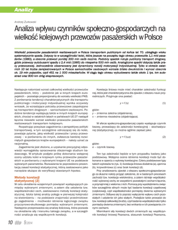 Analizy Andrzej Żurkowski Analiza wpływu czynników społeczno-gospodarczych na wielkość kolejowych przewozów pasażerskich w Polsce Wielk ość pr w pasaż ym od kkońca ońca lat 70. ubiegłego wiek u er ealiz owan olsce tr ans por ielkość przzewozó ozów pasażer publicznym wieku ersskich rrealiz ealizo anyych w P w Polsce trans anspor porttem publiczn sy a jeszcz e na początk u ttego ego okr esu pr pada. Do o w szcz ególnoś ci kkolei, olei, kt ór sysstemat jeszcze początku okresu przzewoziła 1 ematyycznie sspada. Dottyczy tto w szczególnoś ególności któr óra 1,,1 mld pasaej 300 mln osób rrocznie. ocznie. P odobn padek no tu je publiczn żer ów (1 980), a obecnie pr ans por ogo wy Podobn odobnyy sspadek notu tuje publicznyy tr eró (1980), przzewozi poniż poniże trans anspor portt dr drogo ogowy wy,, padły z 2,4 mld (1 985) do nies pełna 500 mln osób. Analogiczne sspadki padki do akż e pr agdzie pr obusami sspadły (1985) niespełna dottyczą ttakż akże praprzzewozy aut autobusami wowan ozw cy pr owej. Jednocz eśnie obser ój mo yzac j. TTylk ylk o w okr esie os anyy jes jestt dynamiczn dynamicznyy rrozw ozwój przzewoz ozo Jednocześnie obserw mottor oryzac yzacjiji indywidualne indywidualnej. ylko w okresie osttat0 lat liczba zar ejes tr owan nich 1 olsce samochodó w osobo wy ch wzr osła blis ko dwukr otnie i wynosi obecnie zare jestr tro anyych w P 10 w Polsce samochodów osobowy wych wzrosła blisk dwukro 9m ln po jazdó w, czyli 45 1 na 1 000 mieszk ańcó w. W ciągu ttego ego okr esu wybudo wano ttakż akż e ok oło 1 ttyys. km aut ook. 1 19 mln pojazdó jazdów 451 mieszkańcó ańców okresu wybudow akże około autostr ad or az 800 km dr óg eks pr eso wy ch. trad oraz dróg ekspr preso esowy wych. Następuje natomiast wzrost całkowitej wielkości przewozów pasażerskich, który – podobnie jak w innych krajach europejskich – pozostaje proporcjonalny do wzrostu wielkości PKB. Z porównania tendencji charakterystycznych dla transportu publicznego i motoryzacji indywidualnej wynika oczywisty wniosek, że wzrastające potrzeby przewozowe zaspokajane są transportem drogowym – samochodami osobowymi. Podobne tendencje występują także w innych krajach europejskich, chociaż w ostatnich latach w państwach UE-27 nastąpił łącznie niewielki wzrost wielkości przewozów pasażerskich realizowanych transportem kolejowym. Rozpatrując powyższe zagadnienia z perspektywy polityki transportowej, w tym szczególnie odnoszącej się do kolei, powstaje pytanie, jaką wielkość przewozów i pracy przewozowej – w porównaniu do innych, zwłaszcza bardziej rozwiniętych gospodarczo krajów europejskich – należy uznać za racjonalną. Zagadnienie jest złożone, a uzyskanie precyzyjnej odpowiedzi wymagałoby opracowania obszernego studium badawczego. W artykule podjęto próbę dokonania wstępnej oceny udziału kolei w krajowym rynku przewozów pasażerskich w porównaniu z wybranymi krajami UE na podstawie wybranych parametrów. Rozważania te poprzedzono prezentacją zasad korelacji statystycznej, którą zastosowano jako narzędzie służące do weryfikacji stawianych hipotez. Metody korelacji statystycznej [2] W celu określenia wzajemnych powiązań występujących pomiędzy wybranymi zmiennymi, a zatem dla ustalenia tzw. współzależności cech, zastosowano metody korelacji statystycznej. Istota takiej analizy polega w pierwszej kolejności na stwierdzeniu – na podstawie znajomości przedmiotowego zagadnienia – możliwości istnienia logicznego związku przyczynowo-skutkowego pomiędzy wybranymi zmiennymi. Następnie przeprowadza się analizę ilościową, która pozwala na określenie siły i kierunku takiego związku, a w szczególności analizuje się współczynnik korelacji. 10 9/2014 Korelacja liniowa może mieć charakter zależności funkcyjnej, która jest charakterystyczna dla zjawisk z obszaru nauk przyrodniczych. Przyjmuje ona postać: y = f (x) (1) gdzie: y – zmienna zależna (objaśniana), x – zmienna niezależna (objaśniająca). W sferze społeczno-gospodarczej często występuje czynnik losowy, prowadzący do zależności korelacyjnej – stochastycznej (statystycznej), co można ogólnie zapisać jako: y = f (x,e) (2) gdzie: e – czynnik losowy. Ten typ zależności będzie w tym przypadku badany jako podstawowy. Wstępna ocena istnienia korelacji może być dokonana w oparciu o wykresy korelacyjne. Cztery podstawowe typy takich wykresów to (rys. 1): korelacja liniowa dodatnia (a), ujemna (b), krzywoliniowa (c) oraz brak korelacji (d). Przy analizowaniu zjawisk z obszaru społeczno-gospodarczego za słuszne należy przyjąć założenie, że w badanych procesach zachodzi tzw. korelacja wielokrotna, a zatem istnieje współzależność wybranej cechy ze wszystkimi pozostałymi cechami łącznie, a przynajmniej z wieloma z nich. Pomocą przy wyodrębnieniu związków szczególnie silnych może być badanie korelacji cząstkowej (częściowej), czyli współzależności pomiędzy dwiema wybranymi zmiennymi. Odbywa się to poprzez wyłączenie wpływu cech pozostałych i ustalenie ich jako stałych. Podejście takie prowadzi do tzw. korelacji całkowitej (brutto), czyli badania współzależności tylko pomiędzy dwiema zmiennymi, bez wnikania w ich powiązania z innymi cechami. Miernikami siły korelacji dwóch zmiennych są: współczynnik korelacji liniowej Pearsona, stosunek korelacji Pearsona, Analizy Rys. 1. Przykłady wykresów korelacyjnych Źródło: [2]. współczynnik zbieżności Czuprowa oraz współczynnik korelacji rang Spearmana. Wybór mierników zależy od rodzaju cech, pomiędzy którymi badana jest zależność, liczby obserwacji oraz kształtu zależności (liniowy lub nieliniowy). W praktyce najczęściej stosuje się współczynnik korelacji liniowej Pearsona jako miernik siły związku liniowego pomiędzy dwiema cechami mierzalnymi. W przypadku badania powiązań pomiędzy elementami st