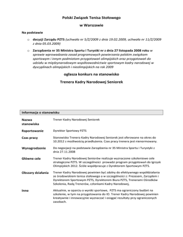Polski Związek Tenisa Stołowego w Warszawie Na podstawie o decyzji Zarządu PZTS (uchwała nr 5/Z/2009 z dnia 19.02.2009, uchwała nr 11/Z/2009 z dnia 05.03.2009) o Zarządzenia nr 35 Ministra Sportu i Turystki nr z dnia 27 listopada 2008 roku w sprawie wprowadzania zasad programowych powierzania polskim związkom sportowym i innym podmiotom przygotowań olimpijskich oraz przygotowań do udziału w międzynarodowym współzawodnictwie sportowym kadry narodowej w dyscyplinach olimpijskich i nieolimpijskich na rok 2009 ogłasza konkurs na stanowisko Trenera Kadry Narodowej Seniorek Informacja o stanowisku Nazwa stanowiska Trener Kadry Narodowej Seniorek Raportowanie Dyrektor Sportowy PZTS Czas pracy Stanowisko Trenera Kadry Narodowej Seniorek jest oferowane na okres do 10.2012 z możliwością przedłużenia. Czas pracy trenera jest nienormowany. Wynagrodzenie Do negocjacji na podstawie Zarządzenia nr 35 Ministra Sportu i Turystyki z dnia 27.11.2008 Główne cele Trener Kadry Narodowej Seniorów realizuje wyznaczone szkoleniowe cele strategiczne PZTS. W szczególności prowadzi program przygotowań do Igrzysk Olimpijskich 2012. Ściśle współpracuje z Dyrektorem Sportowym PZTS. Obszary działania Trener Kadry Narodowej powinien być zdolny do efektywnego współdziałania ze środowiskiem tenisa stołowego a w szczególności z: Prezesem, Zarządem i Dyrektorem Sportowym PZTS, Dyrektorem Biura PZTS, Trenerami Ośrodków Szkolenia, Radą Trenerów, członkami Kadry Narodowej, Inne Aktualnie, w oparciu o wyniki sportowe, PZTS ma ograniczony budżet na szkolenie, w tym na przygotowania do IO. Trener Kadry Narodowej powinien kreatywnie i innowacyjnie wyznaczać i osiągać rezultaty przy ograniczonych zasobach. Wymagania I. Doświadczenie i kwalifikacje Posiadanie: o o o II. Wyższego wykształcenia Wiedza i umiejętności o o o o III. Doświadczenia trenerskiego co najmniej 5-cio letni staż pracy szkoleniowej w tenisie stołowym. Preferowane doświadczenie na poziomie Kadr Narodowych Uprawnień trenerskich tenisa stołowego co najmniej tytuł trenera drugiej klasy Znajomość języka obcego (preferowany język angielski) Znajomość funkcjonowania PZTS i Ministerstwa Sportu i Turystyki Znajomość obsługi komputera (pakiet aplikacji biurowych i internetowych) Prawo jazdy (dodatkowy atut) Inne o Sporządzoną na piśmie koncepcję organizacyjno-szkoleniową działania trenera Kadry Narodowej Seniorek. o o o o o Pasja i silna motywacja do osiągania sukcesów w oparciu o limitowane zasoby Kreatywność Umiejętność rozwiązywania konfliktów Dyspozycyjność Umiejętność kierowania zespołem ludzkim Zawartość oferty konkursowej 1. List motywacyjny. 2. Curriculum vitae wraz ze zdjęciem. 3. Dokumenty potwierdzające posiadane wykształcenie (kopia dyplomu ukończenia studiów, studiów trenerskich) 4. Kopie innych dokumentów świadczących kwalifikacjach (np. studia podyplomowe, kursy, szkolenia, odbyte staże itp.). 5. Aktualne świadectwo zdrowia potwierdzającego zdolność do pracy na stanowisku trenera. 6. Sporządzoną na piśmie koncepcję organizacyjno-szkoleniową działania trenera Reprezentacji Polski Seniorek. Koncepcja powinna zawierać propozycję wieloletniego programu szkolenia, w tym projekt przygotowań i założenia do startu w IO w Londynie 2012. 7. Zobowiązanie do ustawicznego podnoszenia kwalifikacji zawodowych 8. Inne dokumenty według uznania kandydata 9. Numer telefonu i adres e-mail. Postępowanie konkursowe 1. Postępowanie konkursowe przeprowadzane jest przez Komisję Konkursową składającą się z 5 osób i powołaną przez Zarząd PZTS. 2. Komisja Konkursowa rozpoczyna postępowanie konkursowe od sprawdzenia czy oferty 3. 4. 5. 6. 7. 8. 9. 10. IV. zostały złożone w terminie i czy zawierają wszystkie dokumenty wskazane w ogłoszeniu o konkursie oraz, czy z dokumentów tych wynika, że kandydat spełnia wymagania wskazane w ogłoszeniu. Oferty złożone przed ogłoszeniem konkursu jak również oferty złożone po terminie określonym w ogłoszeniu, a także oferty kandydatów, którzy nie spełniają wymagań podlegają odrzuceniu. Kandydaci, których oferty zostaną odrzucone będą powiadomieni w formie pisemnej o przyczynie nieprzyjęcia ich kandydatur. Komisja Konkursowa dokonuje wstępnej oceny kandydatów na podstawie przyjętych ofert. Wstępna ocena kandydatów polega na analizie złożonych dokumentów, której celem jest porównanie danych zawartych w złożonych dokumentach z wymaganiami określonymi w ogłoszeniu o konkursie. Kolejnym etapem procedury konkursowej będzie rozmowa kwalifikacyjna przeprowadzona z kandydatami wyłonionymi w trakcie wstępnej oceny. Kandydaci zostaną powiadomieni o terminie i miejscu rozmowy kwalifikacyjnej nie później niż 3 dni przed wyznaczonym terminem. Zawiadomienie o terminie rozmowy kwalifikacyjnej powinno być dostarczone nie później niż 3 dni przed wyznaczonym terminem. Niestawienie się w wyznaczonym terminie i miejscu na rozmowę kwalifikacyjną jest równoznaczne z rezygnacją kandydata z udziału w konkursie. Ostateczny wybór kandydata dokonywany jest przez Zarząd PZTS Dokumenty złożone przez kandydata, który zostanie wyłoniony w postępowaniu konkursowym zostaną dołączone do jego akt osobowych, natomiast dokumenty pozostałych kandydatów, przechowywane będą łącznie z całą dokumentacją konkursową. Zarząd PZTS może unieważnić konkurs nie podając przyczyny tej decyzji. Sposób składania ofert 1. Oferty konkursowe zawierające wymagane dokumenty powinny być doręczone osobiście lub listownie do dnia 20 maja 2009 roku do siedziby związku: Polski Związek Tenisa Stołowego ul. Łazienkowska 6a, 00-449 Warszawa Z dopiskiem: Konkurs: Trener Reprezentacji Polski Seniorów 2. Zgłoszenia wysyłane drogą elektroniczną i faksem nie będą rozpatrywane. 3. Odrzuconych ofert konkursowych PZTS nie zwraca , chyba że na wyraźne życzenie zainteresowanego.