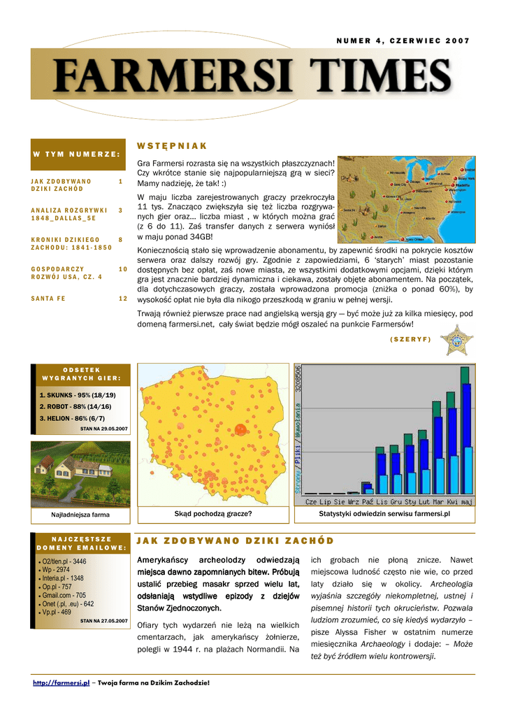 NUMER 4, CZERWIEC 2007 WSTĘPNIAK W TYM NUMERZE: JAK ZDOBYWANO DZIKI ZACHÓD 1 ANALIZA ROZGRYWKI 1848_DALLAS_5E 3 KRONIKI DZIKIEGO ZACHODU: 1841-1850 8 GOSPODARCZY ROZWÓJ USA, CZ. 4 10 SANTA FE 12 Gra Farmersi rozrasta się na wszystkich płaszczyznach! Czy wkrótce stanie się najpopularniejszą grą w sieci? Mamy nadzieję, że tak! :) W maju liczba zarejestrowanych graczy przekroczyła 11 tys. Znacząco zwiększyła się też liczba rozgrywanych gier oraz... liczba miast , w których można grać (z 6 do 11). Zaś transfer danych z serwera wyniósł w maju ponad 34GB! Koniecznością stało się wprowadzenie abonamentu, by zapewnić środki na pokrycie kosztów serwera oraz dalszy rozwój gry. Zgodnie z zapowiedziami, 6 ‘starych’ miast pozostanie dostępnych bez opłat, zaś nowe miasta, ze wszystkimi dodatkowymi opcjami, dzięki którym gra jest znacznie bardziej dynamiczna i ciekawa, zostały objęte abonamentem. Na początek, dla dotychczasowych graczy, została wprowadzona promocja (zniżka o ponad 60%), by wysokość opłat nie była dla nikogo przeszkodą w graniu w pełnej wersji. Trwają również pierwsze prace nad angielską wersją gry — być może już za kilka miesięcy, pod domeną farmersi.net, cały świat będzie mógł oszaleć na punkcie Farmersów! (SZERYF) ODSETEK WYGRANYCH GIER: 1. SKUNKS - 95% (18/19) 2. ROBOT - 88% (14/16) 3. HELION - 86% (6/7) STAN NA 29.05.2007 Najładniejsza farma Skąd pochodzą gracze? Statystyki odwiedzin serwisu farmersi.pl NAJCZĘSTSZE DOMENY EMAILOWE: JAK ZDOBYWANO DZIKI ZACHÓD O2/tlen.pl - 3446 Wp - 2974 • Interia.pl - 1348 • Op.pl - 757 • Gmail.com - 705 • Onet (.pl, .eu) - 642 • Vp.pl - 469 Amerykańscy archeolodzy odwiedzają miejsca dawno zapomnianych bitew. Próbują ustalić przebieg masakr sprzed wielu lat, odsłaniają wstydliwe epizody z dziejów Stanów Zjednoczonych. • • STAN NA 27.05.2007 Ofiary tych wydarzeń nie leżą na wielkich cmentarzach, jak amerykańscy żołnierze, polegli w 1944 r. na plażach Normandii. Na http://farmersi.pl – Twoja farma na Dzikim Zachodzie! ich grobach nie płoną znicze. Nawet miejscowa ludność często nie wie, co przed laty działo się w okolicy. Archeologia wyjaśnia szczegóły niekompletnej, ustnej i pisemnej historii tych okrucieństw. Pozwala ludziom zrozumieć, co się kiedyś wydarzyło – pisze Alyssa Fisher w ostatnim numerze miesięcznika Archaeology i dodaje: – Może też być źródłem wielu kontrowersji. FARMERSI TIMES # 4 - CZERWIEC 2007 KTO ZABIŁ OSADNIKÓW? W 1857 r. z Caravan Springs w północno-zachodnim Arkansas wyjechało 40 wozów. 140 emigrantów, mężczyzn z kobietami i dziećmi, pod przewodnictwem Alexandra Fanchera i Johna Bakera, ruszyło na zachód. 7 września, gdy znajdowali się w połowie drogi do Kalifornii, postanowili rozbić obóz na noc w okolicy Mountain Meadows, w stanie Utah. Tam zostali zaatakowani i wszyscy, z wyjątkiem 17 dzieci, ponieśli śmierć. Na temat tego, co wydarzyło się tej nocy i kto zabił osadników, amerykańscy badacze toczą spór do dziś. Lokalni historycy utrzymują, że mogła to być paramilitarna bojówka mormonów, wspomagana wojownikami Indian Pajutów. Mormoński biskup John Lee, stracony w 1877 r., był jedyną osobą oskarżoną i skazaną za tę zbrodnię. O masakrze wspominał także Mark Twain: „Duży oddział mormonów, wymalowanych i udających Indian, zaatakował wozy emigrantów około 300 mil na południe od Salt Lake City – notował. – Ale osadnicy ufortyfikowali się przy wozach i z sukcesami przez pięć dni odpierali ataki! (…) Po tym czasie mormoni uciekli się do wojskowego podstępu. Zmyli z twarzy barwy wojenne i – uzbrojeni po zęby, z białą flagą – przyjechali do oblężonych osadników! Gdy emigranci zobaczyli nadjeżdżających białych mężczyzn, opuścili broń i serdecznie ich powitali”. Tę wersję wydarzeń potwierdził dwa lata po masakrze major James Carleton, który przyjechał na miejsce, aby sporządzić dla Kongresu raport dotyczący tych wydarzeń. Napisał w nim, że na obóz osadników napadła grupa Indian Pajutów oraz mormoni, przebrani za Indian. Z raportu wynikało, że po nieudanym ataku mormoni zmyli z siebie barwy wojenne i przyszli do obozu, oferując pomoc. A potem razem z Indianami wymordowali osadników. SZCZĄTKI POD MONUMENTEM Mjr Carleton pogrzebał szczątki ofiar, usypał na grobie stos z kamieni, a na górze zatknął krzyż. W 1990 r. stanął tam granitowy monument z napisem informującym o masakrze. Podczas ostatniej renowacji pomnika, cztery lata temu, odkryto kości 28 osób. Badanie gruntu radarem przyniosło kolejne rewelacje – trzy groby ze szczątkami ofiar masakry. Zgodnie z prawem stanowym Utah należało poddać je analizie. Zajęła się tym antropolog Shannon Novak z uniwersytetu w Utah. Jej zespół poddał analizie ponad 2,6 tys. fragmentów szczątków. Okazało się, że Indianie prawdopodobnie mieli z tym mordem niewiele wspólnego. Antropolodzy nie dopatrzyli się na kościach śladów po skalpowaniu ostrymi http://farmersi.pl – Twoja farma na Dzikim Zachodzie! Str. 2 narzędziami. Novak stwierdziła też, że zaatakowanym nie podcinano gardeł, co było częstym sposobem zabijania ofiar przez Indian. W kościach znaleziono za to wiele przestrzelin. Obrażenia dowodziły, że osadnicy ginęli od strzałów z bliskiej odległości. Antropolodzy zaczęli podejrzewać, że masakry dokonali wyłącznie biali ludzie. – Prawdopodobieństwo, że Indianie używali broni mormonów, jest małe – argumentowała Novak. SAND CREEK Niedługo po tych tragicznych wydarzeniach, 29 listopada 1864 r., doszło do innej masakry – nad rzeką Sand Creek. Tym razem 700 amerykańskich kawalerzystów – w większości ochotników – pod dowództwem płk. Johna Chivingtona napadło na wioskę Indian Czejenów i Arapaho w południowo-wschodniej części stanu Kolorado. Chivington prowadził swoich ludzi aż 40 mi