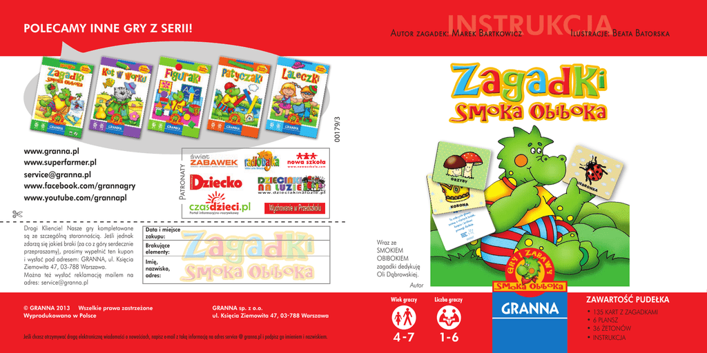 INSTRUKCJA POLECAMY INNE GRY Z SERII! Autor zagadek: Marek Bartkowicz Ilustracje: Beata Batorska Zagadki 00179/3 Smoka Obiboka Patronaty www.granna.pl www.superfarmer.pl [email protected] www.facebook.com/grannagry www.youtube.com/grannapl GRZY BY BIE DR ON KA KORON A 40ie głowy, ✄ Brakujące elementy: Imię, nazwisko, adres: Zagadki Smoka Obiboka I DK GA A ZA OK SM OKA IB OB Autor Wiek graczy © GRANNA 2013 Wszelkie prawa zastrzeżone Wyprodukowano w Polsce 4 -7 I ZAB Smoka Obiboka Liczba graczy GRANNA sp. z o.o. ul. Księcia Ziemowita 47, 03-788 Warszawa Jeśli chcesz otrzymywać drogą elektroniczną wiadomości o nowościach, napisz e-mail z taką informacją na adres service @ granna.pl i podpisz go imieniem i nazwiskiem. ® A NN GRA Wraz ze SMOKIEM OBIBOKIEM zagadki dedykuję Oli Dąbrowskiej. GRY Data i miejsce zakupu: , WY A Drogi Kliencie! Nasze gry kompletowane są ze szczególną starannością. Jeśli jednak zdarzą się jakieś braki (za co z góry serdecznie przepraszamy), prosimy wypełnić ten kupon i wysłać pod adresem: GRANNA, ul. Księcia Ziemowita 47, 03-788 Warszawa. Można też wysłać reklamację mailem na adres: [email protected] jek c h ba akry To n różnyc lowi ez kró znan sięciu i odaje. k d i ag pow 1-6 ZAWARTOŚĆ PUDEŁKA • 135 KART Z ZAGADKAMI • 6 PLANSZ • 36 ŻETONÓW • INSTRUKCJA Zwą mnie Obibok i jestem smokiem, lecz nie zabijam nikogo wzrokiem, nie zieję ogniem i nie przerażam, jak to się innym smokom przydarza. Nikt patrząc na mnie, nie krzyczy: „rety!”, bo we mnie drzemie dusza poety, bo ze mnie smoka przypadek rzadki, co wierszowane pisze zagadki. PRZYGOTOWANIE GRY Karty leżą w stosiku ilustracjami do dołu. Każdy gracz otrzymuje po jednej planszy ze smokiem. Najstarszy z graczy ustala za pomocą wyliczanki, które dziecko będzie odpowiadało pierwsze. Na przykład: ENE, DUE, RAZ, DWA, TRZY, PYTA SMOK, ZGADNIJ TY! PRZEBIEG GRY Prowadząca grę osoba dorosła lub najstarsze dziecko, które umie czytać, odczytuje zagadkę z pierwszej karty ze stosiku. Jeśli odpowiadające dziecko zgadnie, dostaje kolorowy żeton i kładzie go na swojej planszy na kółeczku w kolorze żetonu. Jeśli nie zgadnie, prowadzący podaje rozwiązanie. Następny gracz odpowiada na zagadkę z kolejnej karty. ZAKOŃCZENIE GRY Wygrywa ten z graczy, który pierwszy zapełni swoją planszę sześcioma żetonami. Jeśli gracze chcą grać dalej, mogą zaraz potem rozpocząć kolejną turę. A może teraz Ty spróbujesz przygotować swoje zagadki i zadać je najbliższym? Powodzenia! Do gry dołączony jest arkusik, na który możesz nakleić nalepki zgodnie ze swoim pomysłem. W innych grach SMOKA OBIBOKA znajdziesz kolejne kartoniki z nalepkami.