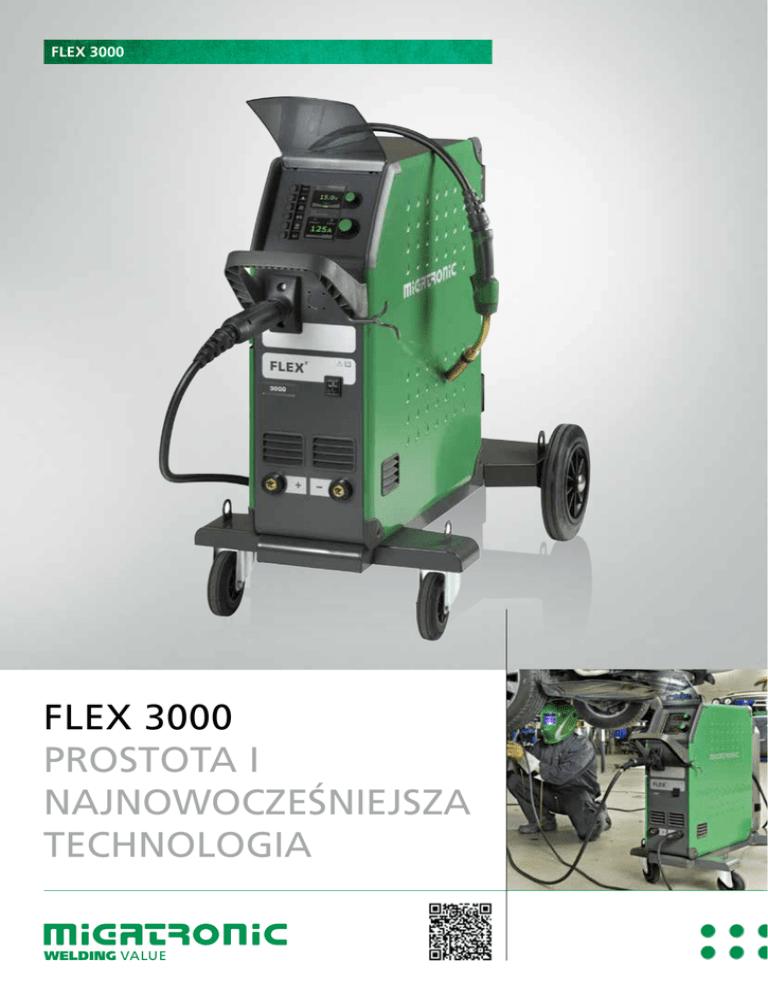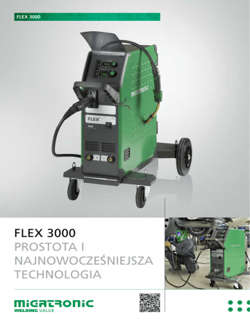 FLEX 3000 FLEX 3000 PROSTOTA I NAJNOWOCZEŚNIEJSZA TECHNOLOGIA FLEX 3000 FLEX 3000 – INTELIGENTNE I PRZYJAZNE UŻYTKOWNIKOWI SPAWARKI MIG/MAG DO SPAWANIA BLACH ORAZ LUTOSPAWANIA METODĄ MIG Przemysł motoryzacyjny jest jednym z najbardziej nowatorskich sektorów, gdy mowa o materiałach i metodach łączenia. Od chwili wyprodukowania swojej pierwszej spawarki w 1970 roku, Migatronic jest czołowym dostawcą urządzeń dla tej gałęzi przemysłu, a jego pozycję umacniają nowe funkcje i zwiększona łatwość obsługi spawarki Flex 3000. Flex 3000 jest wynikiem kolejnych wielkich skoków, które dokonały się w technologii spawalniczej, w połączeniu z ponad czterdziestoletnim doświadczeniem Migatronic. Opracowana we współpracy z producentami samochodów, dostawcami stali i gazu oraz użytkownikami na całym świecie, spawarka Flex 3000 – z układem chłodzenia wodą lub bez – sama optymalizuje swoje funkcjonowanie i pozwala spawaczowi na skupienie się na wysokiej jakości jego pracy: Włącz – wciśnij – spawaj. CYFROWA INTELIGENCJA Cyfrowa inteligencja spawarki Flex 3000 sprawia, że odnalezienie programu odpowiedniego dla danej marki samochodu jest łatwe bez względu na to, czy jest to lutospawanie MIG w stali o dużej wytrzymałości na rozciąganie, czy spawanie w ferrytycznej stali nierdzewnej. Pakiety z programami zaprojektowane zostały dla wiodących marek samochodów, od Audi, przez GM do samochodów wyścigowych Ferrari z hartowanego aluminium. ZDALNE STEROWANIE PRZY UŻYCIU UCHWYTU SPAWALNICZEGO MIG-A TWIST® W zestawie Flex 3000, charakteryzującym się nagradzanym wzornictwem, znajduje się uchwyt MIG-A Twist, a spawarka występuje w wersji chłodzonej powietrzem lub chłodzonej wodą. Wyjątkowa obracana szyjka uchwytu MIG-A Twist umożliwia dojście do trudnodostępnych miejsc. Istnieje możliwość nałożenia na uchwyt różnych modułów służących do regulacji najważniejszych parametrów spawania. ULEPSZONY PROCES I MNIEJ OBRÓBKI PO SPAWANIU Lutospawanie metodą MIG w stali o dużej wytrzymałości na rozciąganie jest jedną z dziedzin, w których specjalizuje się Migatronic. Łączenie cienkich płyt ze stopów specjalnych wymaga zastosowania delikatnego procesu. Proces ten, oraz znacznie więcej dodatkowych danych, wbudowane są w pamięć Flex 3000. Wynik mówi sam za siebie; korozja i właściwości wytrzymałościowe materiału są zachowane, z koniecznością jedynie niewielkiej obróbki po spawaniu dzięki minimalnej ilości odprysków i ciepła doprowadzonego. Poza tym nie występują prawie żadne odkształcenia płyt karoserii samochodowych. Ergonomiczne uchwyty ułatwiające dostęp 2 Lutospawanie MIG zachowuje wytrzymałość stali i chroni przeciwkorozyjną powłokę cynkową FLEX 3000 - NAJWYŻSZEJ KLASY SPAWARKA MIG/MAG DO SPAWANIA BLACH I LUTOSPAWANIA W BRANŻY SAMOCHODOWEJ KREATOR PROGRAM WIZARD™ Kreator programów Migatronic Program Wizard™ pozwala spawaczowi na odnalezienie właściwego programu spawania dla danego zadania, bez konieczności przeszukiwania wszystkich programów, eliminując ryzyko dokonania błędnego wyboru. Kreator programów to wbudowany poradnik w panelu sterowania, który odnajduje właściwy program wśród pakietów z programami, zadając trzy lub cztery proste pytania, np. dotyczące rodzaju drutu i gazu. PAMIĘĆ CYFROWA Z MIGATRONIC MJC™ Nowo opracowana funkcja MJC™ Miga Job Control (Kontrola Zadań) pozwala na zapamiętanie do 200 oddzielnych zadań spawalniczych, oraz na łatwe przywołanie ulubionych ustawień. NIŻSZE ZUŻYCIE MOCY – MNIEJSZY WPŁYW NA ŚRODOWISKO Spawarka Flex 3000 jest na wskroś zielona dzięki nowej technologii spawalniczej oraz korzystaniu z podzespołów o niskim zużyciu energii – co jest ważnym czynnikiem dziś, gdy tyle się mówi o emisji CO2 i rosnącym zużyciu mocy. SZEROKIE OSZCZĘDNOŚCI W ZUŻYCIU GAZU Inteligentna Kontrola Gazu IGC® to opcjonalna funkcja w Flex 3000; dynamiczna kontrola gazu monitorująca zużycie i optymalizująca osłonę gazową. IGC® daje do 50% oszczęd-ności w zużyciu gazu i oznacza proporcjonalnie mniejszą częstotliwość wymiany butli z gazem, z korzyścią dla gospodarki firmy, środowiska i wydajności pracy; szczególnie w przemyśle motory- MJC™ pozwala na zapamiętanie do 200 oddzielnych zadań spawalniczych zacyjnym, który charakteryzuje się koniecznością wykonywania wielu małych spoin spawanych i sczepnych. Oblicz oszczędności w końcowym rachunku na stronie www.intelligentgascontrol.com. IGC ® e s Control Insid Intelligent Ga IGC® jest funkcją opcjonalną w Flex 3000 FLEX 3000 FLEX 3000 – PROSTOTA I NAJNOWOCZEŚNIEJSZA TECHNOLOGIA FUNKCJE SPECJALNE •Przenoszenie oprogramowania spawarki i najnowszych funkcji za pomocą karty SD – darmowe pobieranie Panel sterowania Flex 3000 Spawanie MIG lub lutospawanie MIG •Kopiowanie przechowywanych ustawień za pomocą karty SD ze spawarki do PC i odwrotnie •Zaprojektowana, aby spełniać wymagania przyszłości w zakresie materiałów i mieszanek gazowych •Funkcja opcjonalna: IGC® Inteligentna Kontrola Gazu •Dedykowane pakiety z programami Zastrzegamy sobie prawo do wprowadzania zmian. POWER SOURCE FLEX 3000 Napięcie sieciowe +/÷ 15%,V 3x400 (3 x 230-500 V *) Bezpiecznik, A 16 Skuteczny prąd sieciowy, A 16.5 (380V)/15.7 (400V) Prąd sieciowy, maks., A 19.0 (380V)/18.1 (400V) Współczynnik sprawności 0.90 Wskaźnik sprawności 0.85 Zakres prądu, A 15-300 Cykl pracy 100% / 20°C, A/V 300 Cykl pracy 100% / 40°C, A/V 270/30.8 Cykl pracy maks. 40°C, A/V 300/80/32.0 Cykl pracy maks. 20°C, A/V 300/100 Napięcie jałowe, V 69-76 Klasa ochronności Wymiary, chłodz. pow.: (wys. x szer. x dł., mm) Wymiary, chłodz. wodą: (wys. x szer. x dł., mm) IP 23 EN/IEC60974-1, EN/IEC60974-2, EN/IEC60974-5, EN/IEC60974-10 906x524x925 1051x524x925 Waga chłodz. pow./wodą, kg 58 /69 Norma SZEROKI ASORTYMENT AKCESORIÓW •Ergonomiczne nastawne uchwyty spawal