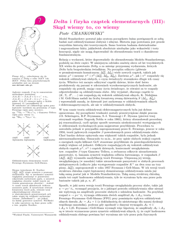 Delta i f izyka cząstek elementarnych (III): Skąd wiemy to, co wiemy Piotr CHANKOWSKI * Model Standardowy powstał jako synteza początkowo luźno powiązanych ze sobą badań nad oddziaływaniami słabymi i silnymi. Historia jego powstania jest przede wszystkim historią idei teoretycznych. Same bowiem badania doświadczalne i nagromadzone fakty, jakkolwiek absolutnie niezbędne jako wskazówki i testy koncepcji, nigdy nie mogą doprowadzić do sformułowania teorii o charakterze fundamentalnym. Pisząc ∆n XY , odwołujemy się do numeru n Delty z roku 19XY lub 20XY . Pełna lista przywoływanych artykułów jest na stronie www.deltami.edu.pl. Jądrowe rozpady β są to samorzutnie zachodzące przemiany J(A, Z) → J(A, Z + 1) + e− + ν̄e , J(A, Z) → J(A, Z − 1) + e+ + νe , gdzie J(A, Z) oznacza jądro o liczbie masowej A i porządkowej Z. W zależności od całkowitego spinu pary leptonów wyróżnia się przemiany β typu Fermiego (spin pary zerowy), np. 14 O8 → 14 N7 e+ νe i Gamowa–Tellera (spin pary równy 1), np. 6 He2 → 6 Li3 e− ν̄e . Oddziaływania elementarne teorii Fermiego–Feynmana–Gell-Manna. Słynne twierdzenie E. Noether 12 (∆12 88 , ∆95 ) wiąże symetrie z prawami zachowania. Np. w mechanice symetrii względem przesunięć w przestrzeni odpowiada zachowanie pędu, a symetrii względem obrotów wokół trzech osi (trzem generatorom obrotów) – stałość w czasie trzech składowych wektora momentu pędu. Z symetriami równań kwantowej teorii pola, również tymi odpowiadającymi obrotom w abstrakcyjnych przestrzeniach pól, także wiążą się wielkości zachowane (zwane „ładunkami”) – po jednej na każdy generator symetrii. Wielkości te jako operatory są dane przez całki z tzw. prądów Noether. *Wydział Fizyki, Uniwersytet Warszawski Relację z wydarzeń, które doprowadziły do sformułowania Modelu Standardowego, podzielę na dwie części. W niniejszym odcinku omówię okres od lat trzydziestych XX wieku do powstania Delty, a za miesiąc przypomnę wydarzenia, których Delta była bezpośrednim świadkiem. Na początku odkryto (głównie 4 w promieniowaniu kosmicznym; ∆10 91 , ∆03 ) wiele nowych cząstek, takich jak 4 5 ± ± miony µ± i mezony π ± i π 0 (∆12 , ∆ , 76 80 ∆00 ). Zarówno µ , jak i π rozpadały się wskutek oddziaływań słabych, o czym świadczyły stosunkowo długie ich czasy życia. Wkrótce też zaczęto odkrywać cząstki dziwne, które dość łatwo produkowały się parami w zderzeniach wysokoenergetycznych hadronów, ale rozpadały się powoli, mając czasy życia świadczące, że również za te rozpady odpowiedzialne są oddziaływania słabe. Aby wyjaśnić, dlaczego cząstki te (K, Σ, Λ0 , . . .) nie rozpadają się wskutek oddziaływań silnych, K. Nishijima i M. Gell-Mann nadali im liczbę kwantową zwaną dziwnością S (∆174 , ∆790 ) i wprowadzili zasadę, że dziwność jest zachowana w oddziaływaniach silnych i elektromagnetycznych, ale nie w oddziaływaniach słabych. W tym czasie teoria oddziaływań elektromagnetycznych była już dobrze opracowana. Jej początkowe trudności zostały przezwyciężone dzięki pracom J.S. Schwingera, R.P. Feynmana, S.-I. Tomonagi i F. Dysona (pierwsi trzej otrzymali wspólnie Nagrodę Nobla w roku 1965), którzy sformułowali procedurę jej renormalizacji, czyli spójny sposób usuwania nieskończoności występujących w obliczeniach wychodzących poza najprostsze przybliżenie. Procedura ta zawodziła jednak w przypadku zaproponowanej przez E. Fermiego, jeszcze w roku 1934, teorii jądrowych rozpadów β powodowanych przez oddziaływania słabe. Choć bardzo dobrze opisywała ona większość takich rozpadów, była jednak nierenormalizowalna. Oznaczało to m.in., że przy opisie słabych reakcji cząstek o energiach rzędu kilkuset GeV stosowane przybliżenie da prawdopodobieństwa reakcji większe od jedności. Odkrycie rozpadających się wskutek oddziaływań słabych cząstek µ± , π ± i cząstek dziwnych, konieczność uwzględnienia tzw. rozpadów β typu Gamowa–Tellera, a zwłaszcza odkrycie niezachowania parzystości, tj. łamania symetrii względem odbicia lustrzanego, w rozpadach β 12 (∆10 87 , ∆95 ) wymusiło modyfikację teorii Fermiego. Ulepszoną jej wersję, uwzględniającą (w zasadzie) także niezachowanie parzystości w słabych procesach nieleptonowych (odkryte jako występowanie rozpadów K + na dwa oraz na trzy piony, ∆12 95 ), zaproponowali w roku 1957 Feynman i Gell-Mann. W ich wersji teorii struktura chiralna części leptonowej elementarnego oddziaływania miała już taką samą postać jak w Modelu Standardowym. Taką samą strukturę chiralną miała też część hadronowa oddziaływania, tyle że wyrażona była ona przez pola barionów takich jak p, n, Λ0 . Sposób, w jaki nowa wersja teorii Fermiego uwzględniała procesy słabe, takie jak n → p e− ν̄e , wymagał przyjęcia, że z jakiegoś powodu oddziaływania silne niemal nie wpływają na amplitudy procesów słabych z udziałem hadronów. Na przykład, rozpad n → p e− ν̄e wymaga obliczenia dwóch amplitud AV i AA ; teoria Fermiego–Feynmana–Gell-Manna (FFG) przy pominięciu wpływu oddziaływań silnych dawała AV = AA = 1 (z dokładnością do nieistotnego dla naszej dyskusji wspólnego mnożnika), podczas gdy zgodność z danymi wymagała AV ≈ 1 i AA ≈ 1,25. Feynman i Gell-Mann wysunęli więc hipotezę, że amplitudy AV i AA są w istocie wyznaczone przez symetrie oddziaływań silnych, tj. że część hadronowa oddziaływania słabego powinna być wyrażona nie tyle przez pola fizycznych 6 Oprócz bycia przyczyną grupowania się hadronów w multiplety cząstek o niemal takich samych masach, symetria izospinowa SU(2)V narzuca także pewne związki na amplitudy prawdopodobieństwa √ różnych procesów, np. A(p p → π + d) = 2 A(p n → π 0 d), gdzie d oznacza deuteron. Dzięki teorii grup, aby otrzy