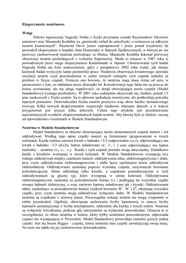 Eksperymenty neutrinowe Wstęp Połowa tegorocznej Nagrody Nobla z fizyki przyznana została Raymondowi Davisowi juniorowi oraz Masatoshi Koshibie za „pionierski wkład do astrofizyki, a zwłaszcza za odkrycie neutrin kosmicznych”. Raymond Davis junior zaproponował i przez ponad trzydzieści lat prowadził eksperyment w kopalni złota Homestake w Stanach Zjednoczonych, w którym po raz pierwszy zaobserwował neutrina pochodzące ze Słońca. Masatoshi Koshiba dokonał pierwszej obserwacji neutrin pochodzących z wybuchu Supernowej. Miało to miejsce w 1987 roku w prowadzonym przez niego eksperymencie Kamiokande w Japonii. Uhonorowanie tych badań Nagrodą Nobla nie było zaskoczeniem, gdyż z perspektywy 2002 roku widać, jak istotny kierunek badań wytyczyły tamte pionierskie prace. Niedawna obserwacja kwantowego zjawiska oscylacji neutrin czyli przechodzenia w siebie różnych rodzajów tych cząstek uchodzi za przełom w fizyce cząstek. Oznacza ona bowiem, że neutrina mają masę różną od zera, w sprzeczności z tym, co zakładano przez dziesiątki lat. Konsekwencje tego faktu nie są jeszcze do końca zrozumiane, ale nie ulega wątpliwości, że dotąd obowiązująca teoria cząstek (Model Standardowy) wymaga przebudowy. W 2001 roku codziennie ukazywało się, średnio, ponad 3.5 prac naukowych z fizyki neutrin. Są to głównie spekulacje teoretyczne, ale podkreślają potrzebę lepszych pomiarów. Doświadczalna fizyka neutrin przeżywa więc okres bardzo dynamicznego rozwoju. Kilka nowych eksperymentów rozpoczęło niedawno zbieranie danych, a w trakcie przygotowań jest jeszcze kilka dalszych. Celem tego artykułu jest przedstawienie najważniejszych wyników eksperymentalnych badań neutrin. Aby łatwiej było je śledzić, zacznę od opowiedzenia o neutrinach w Modelu Standardowym Neutrina w Modelu Standardowym Model Standardowy to obecnie obowiązująca teoria elementarnych cząstek materii i ich oddziaływań. Według tego opisu cząstki materii są fermionami zgrupowanymi w trzech rodzinach. Każda rodzina zawiera kwark o ładunku +2/3 (odpowiednio u,c,t), odpowiadający mu kwark o ładunku –1/3 (d,s,b), lepton naładowany (e-, µ−, τ -) oraz odpowiadający mu lepton neutralny – neutrino (νe, νµ , ντ). Każda z tych cząstek posiada swoją antycząstkę. Dodatkowo każdy z kwarków wystepuje w trzech kolorach. W Modelu Standardowym występują trzy rodzaje oddziaływań między cząstkami materii: oddziaływania silne, elektromagnetyczne i słabe, przy czym oddziaływania elektromagnetyczne i słabe łączy ogólniejsza teoria oddziaływań elektrosłabych. Oddziaływania zachodzą poprzez wymianę cząstek, nazywanych bozonami pośredniczącymi. Silnie oddziałują tylko kwarki, a cząstkami pośredniczącymi w tych oddziaływaniach są gluony (g), które występują w ośmiu kolorach. Oddziaływania elektromagnetyczne zachodzą za pośrednictwem fotonu (γ) i podlegają im wszystkie cząstki niosące ładunek elektryczny, a więc zarówno leptony naładowane jak i kwarki. Oddziaływania słabe, zachodzące za pośrednictwem bardzo ciężkich bozonów W+, W- i Z0, obejmują wszystkie cząstki, przy czym neutrina mogą oddziaływać wyłącznie słabo. W Modelu Standardowym neutrina są cząstkami o zerowej masie. Poszczególne rodzaje neutrin nie mogą wzajemnie w siebie przechodzić. Ogólniej, obowiązuje zachowanie liczby leptonowej, to znaczy liczby leptonów pomniejszonej o liczbę antyleptonów, oddzielnie dla każdej z trzech rodzin. Neutrina są wyłącznie lewoskrętne, podczas gdy antyneutrina są wyłącznie prawoskrętne. Oznacza to w szczególności, że obraz neutrina w lustrze, który byłby neutrinem prawoskrętnym, odpowiada cząstce nie występującej w Przyrodzie. Model Standardowy przewiduje istnienie jeszcze jednej cząstki. Jest nią bozon Higgsa – cząstka, której istnieniu inne cząstki zawdzięczają swoją masę. Na razie nie udało się jej zaobserwować doświadczalnie. Neutrino – hipotetyczna cząstka Pauliego Historia neutrina sięga odkrycia radioaktywnych rozpadów β− jąder atomowych czyli takich, w których emitowany jest elektron. Kiedy w 1914 roku James Chadwick zmierzył widmo energetyczne elektronów pochodzących z takiego rozpadu, ze zdumieniem stwierdził, że nie odpowiada ono jednej, określonej wartości energii (jak w przypadku promieniotwórczych rozpadów α i γ) lecz jest ciągłe. Zakładając, że w wyniku rozpadu powstaje tylko nowe jądro atomowe i elektron, oznaczałoby to złamanie zasady zachowania energii, za czym opowiedział się nawet wielki Niels Bohr. Rozwiązanie tej trudności zaproponował Wolfgang Pauli w swoim słynnym liście z grudnia 1930 roku, adresowanym do ”Drogich Radioaktywnych Pań i Panów” zebranych na spotkaniu w Tybindze. Pisał w nim „Wpadłem na desperacki pomysł uratowania twierdzenia o statystykach oraz prawa zachowania energii, a mianowicie istnienia w jądrach cząstek elektrycznie obojętnych, które proponuję nazwać neutronami i które mają spin ½”. Nowe cząstki miały być nie cięższe od elektronu i nie oddziaływać silniej niż fotony. Nie wchodząc w sprawę ratowania „twierdzenia o statystykach”, postulowana cząstka rozwiązywała problem zachowania energii w rozpadzie β−. Była ona emitowana z jądra razem z elektronem, wobec czego widmo energetyczne elektronów musiało być ciągłe. W 1932 roku Chadwick odkrył prawdziwy neutron o masie bliskiej masy protonu i będący brakującą cegiełką do wyjaśnienia budowy jąder. Wkrótce po tym Enrico Fermi zaproponował przezwanie hipotetycznej cząstki Pauliego na neutrino (po włosku mały neutron) i zasugerował, że fundamentalnym procesem odpowiedzialnym za rozpad β− jest rozpad neutronu na proton, elektron i neutrino. Stworzona przez Fermiego pierwsza teoria słabych oddziaływań pozwoliła na policzenie przekroju czynnego na tak zwany odwrotny proces β czyli rozprasza