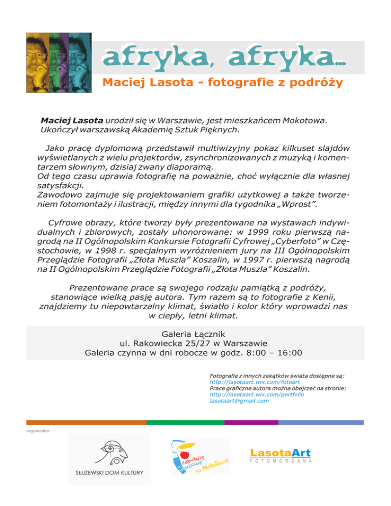 afryka, afryka... Maciej Lasota - fotografie z podróży Maciej Lasota urodził się w Warszawie, jest mieszkańcem Mokotowa. Ukończył warszawską Akademię Sztuk Pięknych. Jako pracę dyplomową przedstawił multiwizyjny pokaz kilkuset slajdów wyświetlanych z wielu projektorów, zsynchronizowanych z muzyką i komentarzem słownym, dzisiaj zwany diaporamą. Od tego czasu uprawia fotografię na poważnie, choć wyłącznie dla własnej satysfakcji. Zawodowo zajmuje się projektowaniem grafiki użytkowej a także tworzeniem fotomontaży i ilustracji, między innymi dla tygodnika „Wprost”. Cyfrowe obrazy, które tworzy były prezentowane na wystawach indywidualnych i zbiorowych, zostały uhonorowane: w 1999 roku pierwszą nagrodą na II Ogólnopolskim Konkursie Fotografii Cyfrowej „Cyberfoto” w Częstochowie, w 1998 r. specjalnym wyróżnieniem jury na III Ogólnopolskim Przeglądzie Fotografii „Złota Muszla” Koszalin, w 1997 r. pierwszą nagrodą na II Ogólnopolskim Przeglądzie Fotografii „Złota Muszla” Koszalin. Prezentowane prace są swojego rodzaju pamiątką z podróży, stanowiące wielką pasję autora. Tym razem są to fotografie z Kenii, znajdziemy tu niepowtarzalny klimat, światło i kolor który wprowadzi nas w ciepły, letni klimat. Galeria Łącznik ul. Rakowiecka 25/27 w Warszawie Galeria czynna w dni robocze w godz. 8:00 – 16:00 Fotografie z innych zakątków świata dostępne są: http://lasotaart.wix.com/fotoart Prace graficzne autora można obejrzeć na stronie: http://lasotaart.wix.com/portfolio [email protected] organizator