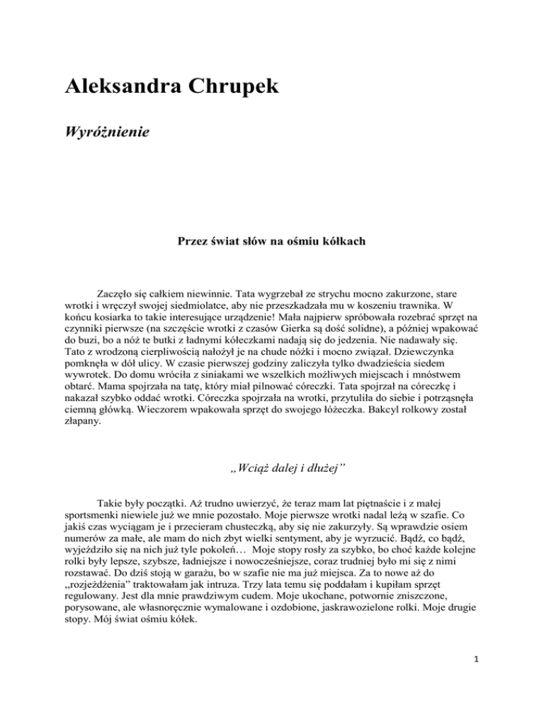 Aleksandra Chrupek Wyróżnienie Przez świat słów na ośmiu kółkach Zaczęło się całkiem niewinnie. Tata wygrzebał ze strychu mocno zakurzone, stare wrotki i wręczył swojej siedmiolatce, aby nie przeszkadzała mu w koszeniu trawnika. W końcu kosiarka to takie interesujące urządzenie! Mała najpierw spróbowała rozebrać sprzęt na czynniki pierwsze (na szczęście wrotki z czasów Gierka są dość solidne), a później wpakować do buzi, bo a nóż te butki z ładnymi kółeczkami nadają się do jedzenia. Nie nadawały się. Tato z wrodzoną cierpliwością nałożył je na chude nóżki i mocno związał. Dziewczynka pomknęła w dół ulicy. W czasie pierwszej godziny zaliczyła tylko dwadzieścia siedem wywrotek. Do domu wróciła z siniakami we wszelkich możliwych miejscach i mnóstwem obtarć. Mama spojrzała na tatę, który miał pilnować córeczki. Tata spojrzał na córeczkę i nakazał szybko oddać wrotki. Córeczka spojrzała na wrotki, przytuliła do siebie i potrząsnęła ciemną główką. Wieczorem wpakowała sprzęt do swojego łóżeczka. Bakcyl rolkowy został złapany. „Wciąż dalej i dłużej” Takie były początki. Aż trudno uwierzyć, że teraz mam lat piętnaście i z małej sportsmenki niewiele już we mnie pozostało. Moje pierwsze wrotki nadal leżą w szafie. Co jakiś czas wyciągam je i przecieram chusteczką, aby się nie zakurzyły. Są wprawdzie osiem numerów za małe, ale mam do nich zbyt wielki sentyment, aby je wyrzucić. Bądź, co bądź, wyjeździło się na nich już tyle pokoleń… Moje stopy rosły za szybko, bo choć każde kolejne rolki były lepsze, szybsze, ładniejsze i nowocześniejsze, coraz trudniej było mi się z nimi rozstawać. Do dziś stoją w garażu, bo w szafie nie ma już miejsca. Za to nowe aż do ,,rozjeżdżenia” traktowałam jak intruza. Trzy lata temu się poddałam i kupiłam sprzęt regulowany. Jest dla mnie prawdziwym cudem. Moje ukochane, potwornie zniszczone, porysowane, ale własnoręcznie wymalowane i ozdobione, jaskrawozielone rolki. Moje drugie stopy. Mój świat ośmiu kółek. 1 Jeżdżę codziennie. Jak mogłabym się z nimi rozstać nawet na chwilę? Gdy pada deszcz, w wiatrówce, nieprzemakalnych spodniach i dwóch parach skarpetek. Gdy pada śnieg, wyłuskuję ostatnie oszczędności, by wejść na specjalną halę. Gdy upał wręcz smaży człowieka, wskakuję w strój kąpielowy. I jeżdżę. Wciąż dalej i dłużej. Zapytacie: po co? Nie będę wam opisywać, dlaczego warto uprawiać sport. To wie każdy, poza tym jest zbyt nudne. Powiem, dlaczego rolki. Bo dają nieograniczone możliwości działania, możesz je spakować do plecaka i jeździć wszędzie, dokąd tylko dusza zapragnie. Choć może lepiej brzmiałoby: dokąd tylko wylali asfalt. Bo spotykasz niesamowitych ludzi, którzy rozumieją, dlaczego wyszłaś sobie pojeździć, chociaż właśnie leje jak z cebra. Rolki to wolność. Jeśli tylko tego zapragniesz, to jesteś ty, one i droga. I nie ma oprócz was nikogo i niczego. Olśnienie Z biegiem drogi i czasu odkryłam w sobie jeszcze jedną pasją: literaturę. Zagrzebanie się w fotelu razem z zeszytem i długopisem było równie pasjonujące jak jazda, niestety trochę trudne do pogodzenia. Za każdym razem biłam się z myślami: jeździć czy pisać, jeździć czy pisać, jeździć czy pisać. Olśnienie przyszło nagle i niespodziewanie. Podczas wydarzenia niezwykłego i tak samo niespodziewanego, które też zaczęło się całkiem zwyczajnie… Początek lipca, dwa lata temu. W pośpiechu kończyłam jabłko, usiłując jednocześnie dopiąć rolki i dokończyć ostatnie dwa wersy nowego wiersza. Ani w ząb nie mogłam wpaść na żaden pomysł. Ze złości przygryzałam ołówek. Pogoda była chyba zgodna z moim nastrojem. Słońce ani myślało wyjrzeć zza chmur, zapewne za chwilę w T-shircie i spodenkach nie przejadę dziesięciu metrów. Nagle trzasnęły drzwi wejściowe i do środka wpadła moja kuzynka Wera. Spojrzałam na nią zaskoczona. Odkąd kilka miesięcy temu zdała maturę, rzadko bywała w domu, bo twierdziła, że woli poznawać świat, niż tkwić jak kołek w naszej wsi. Kiedy próbowała mnie przekonać do swoich racji, tylko wzruszałam ramionami ,,nasza wieś” jakoś mi nie przeszkadzała, w każdym razie lepszego asfaltu do jazdy na rolkach nie było nigdzie, temu nie mogła zaprzeczyć. Właśnie, rolki. Od czasów moich pierwszych wrotek, gdy tylko miałam ochotę na towarzystwo, szłam do Werki i szalałyśmy razem, dopóki rodzice postępem lub przekupstwem nie kazali nam wracać do domu. Bo najchętniej na ulicy spędzałybyśmy całe dnie. Później coś się zmieniło. Wera zaczęła chodzić do liceum i miała ,,swoje sprawy”, jak próbowała wytłumaczyć mi mama. Ale efekt wytłumaczenia czegokolwiek nadąsanej czwartoklasistce był raczej mizerny. A teraz nagle prawie studentka wpada do nas do domu jak gdyby nigdy nic. - Olka, nie uwierzysz, co się stało - wydyszała, chwytając się framugi. - Mam genialny plan! Chcesz ze mną zwiedzić świat? - Co tym razem? - zapytałam, nie przerywając konsumowania jabłka i wiązania rolek, bo niedokończony wiersz cisnęłam już na łóżko. - Praga? Paryż? A może Nowy Jork? - Nie wygłupiaj się! Częstochowa! Zapisałam się do KSM-u, żeby zdobyć punkty do rekrutacji na studia. I okazuje się, że z Warszawy organizowana jest pielgrzymka na Jasną Górę, na rolkach! To jest niepowtarzalna szansa, nie możemy jej zmarnować! - Pielgrzymka? - zakrztusiłam się kawałkiem owocu. - My i PIELGRZMKA? Bez urazy Wera, ale sądzisz, że nadajemy się na takie… no, religijne przedsięwzięcie? - Będziemy miały okazję sprawdzić, bo już nas zapisałam - uśmiechnęła się łobuzersko. - Załapałyśmy się na jedne z ostatnich wolnych miejsc. 2 - Co?! - zerwałam się z krzesła. - Zapisałaś mnie bez mojej wiedzy?- odruchowo sięgnęłam po jedną z moich puchowych 
