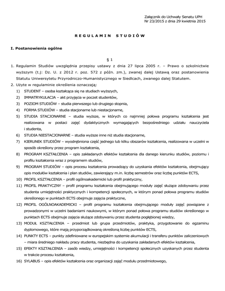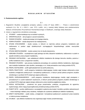 Załącznik do Uchwały Senatu UPH Nr 23/2015 z dnia 29 kwietnia 2015 REGULAMIN STUDIÓW I. Postanowienia ogólne §1 1. Regulamin Studiów uwzględnia przepisy ustawy z dnia 27 lipca 2005 r. – Prawo o szkolnictwie wyższym (t.j: Dz. U. z 2012 r. poz. 572 z późn. zm.), zwanej dalej Ustawą oraz postanowienia Statutu Uniwersytetu Przyrodniczo-Humanistycznego w Siedlcach, zwanego dalej Statutem. 2. Użyte w regulaminie określenia oznaczają: 1) STUDENT – osoba kształcąca się na studiach wyższych, 2) IMMATRYKULACJA – akt przyjęcia w poczet studentów, 3) POZIOM STUDIÓW – studia pierwszego lub drugiego stopnia, 4) FORMA STUDIÓW – studia stacjonarne lub niestacjonarne, 5) STUDIA STACJONARNE – studia wyższe, w których co najmniej połowa programu kształcenia jest realizowana w postaci zajęć dydaktycznych wymagających bezpośredniego udziału nauczyciela i studenta, 6) STUDIA NIESTACJONARNE – studia wyższe inne niż studia stacjonarne, 7) KIERUNEK STUDIÓW – wyodrębniona część jednego lub kilku obszarów kształcenia, realizowana w uczelni w sposób określony przez program kształcenia, 8) PROGRAM KSZTAŁCENIA – opis zakładanych efektów kształcenia dla danego kierunku studiów, poziomu i profilu kształcenia wraz z programem studiów, 9) PROGRAM STUDIÓW – opis procesu kształcenia prowadzący do uzyskania efektów kształcenia, obejmujący opis modułów kształcenia i plan studiów, zawierający m.in. liczbę semestrów oraz liczbę punktów ECTS, 10) PROFIL KSZTAŁCENIA – profil ogólnoakademicki lub profil praktyczny, 11) PROFIL PRAKTYCZNY – profil programu kształcenia obejmującego moduły zajęć służące zdobywaniu przez studenta umiejętności praktycznych i kompetencji społecznych, w którym ponad połowa programu studiów określonego w punktach ECTS obejmuje zajęcia praktyczne, 12) PROFIL OGÓLNOAKADEMICKI – profil programu kształcenia obejmującego moduły zajęć powiązane z prowadzonymi w uczelni badaniami naukowymi, w którym ponad połowa programu studiów określonego w punktach ECTS obejmuje zajęcia służące zdobywaniu przez studenta pogłębionej wiedzy, 13) MODUŁ KSZTAŁCENIA – przedmiot lub grupa przedmiotów, praktyka, przygotowanie do egzaminu dyplomowego, które mają przyporządkowaną określoną liczbę punktów ECTS, 14) PUNKTY ECTS – punkty zdefiniowane w europejskim systemie akumulacji i transferu punktów zaliczeniowych – miara średniego nakładu pracy studenta, niezbędna do uzyskania zakładanych efektów kształcenia, 15) EFEKTY KSZTAŁCENIA – zasób wiedzy, umiejętności i kompetencji społecznych uzyskanych przez studenta w trakcie procesu kształcenia, 16) SYLABUS – opis efektów kształcenia oraz organizacji zajęć modułu przedmiotowego, 17) System USOS – uniwersytecki system obsługi studenta, na który składa się system obsługiwany przez pracowników administracyjnych UPH oraz systemy z nim powiązane dostępne dla studentów oraz prowadzących przedmioty (koordynatorów), 18) EFEKTY UCZENIA SIĘ – zasób wiedzy, umiejętności i kompetencji społecznych uzyskiwanych w procesie uczenia się poza systemem studiów, 19) PROWADZĄCY PRZEDMIOT (KOORDYNATOR) – osoba odpowiedzialna za przedmiot/moduł, która dokonuje wpisów z przedmiotu w karcie okresowych osiągnięć studenta oraz w systemie USOS, w uzgodnieniu z pozostałymi prowadzącymi zajęcia z zakresu danego modułu. 20) KIEROWNIK PODSTAWOWEJ JEDNOSTKI ORGANIZACYJNEJ – dziekan wydziału lub kierownik innej niż wydział podstawowej jednostki organizacyjnej. §2 1. Przyjęcie w poczet studentów Uniwersytetu Przyrodniczo-Humanistycznego w Siedlcach, zwanego dalej Uniwersytetem lub Uczelnią, następuje z chwilą immatrykulacji i złożenia ślubowania. 2. Po złożeniu ślubowania student otrzymuje legitymację studencką – dokument poświadczający status studenta. 3. Studia prowadzone są jako studia pierwszego lub drugiego stopnia w formie studiów stacjonarnych lub niestacjonarnych. 4. Studia kończą się egzaminem dyplomowym. 5. Reprezentantem ogółu studentów uniwersytetu są odpowiednie organy samorządu studenckiego. §3 1. Studia niestacjonarne są odpłatne. 2. Uniwersytet może pobierać opłaty za świadczone usługi edukacyjne związane z powtarzaniem określonych zajęć z powodu niezadowalających wyników w nauce, a także za studia prowadzone w językach obcych oraz za zajęcia nieobjęte planem studiów. Opłaty wnoszą studenci wszystkich form studiów. 3. Wysokość opłat i terminy ich wnoszenia ustala Rektor w drodze zarządzenia. §4 1. Warunki pobierania opłat związanych z odbywaniem studiów oraz opłat za usługi edukacyjne, a także wysokość tych opłat określa umowa między Uniwersytetem a studentem, zawarta w formie pisemnej pod rygorem nieważności. 2. Jeżeli w terminie 4 tygodni od dnia rozpoczęcia zajęć na I roku studiów student nie podpisał umowy, o której mowa w ust. 1, uznaje się, że nie podjął on studiów. 3. Kierownik podstawowej jednostki organizacyjnej w drodze decyzji stwierdza niepodjęcie studiów oraz skreśla studenta z listy studentów. II. Organizacja roku akademickiego §5 1. Rok akademicki rozpoczyna się 1 października i trwa do 30 września kalendarzowego. 2. Rok akademicki dzieli się na dwa semestry: semestr zimowy i semestr letni. 3. Na studiach stacjonarnych rok akademicki obejmuje: 2 następnego roku 1) semestr zimowy składający się z okresu zajęć dydaktycznych trwających 15 tygodni oraz zimowej sesji egzaminacyjnej trwającej nie dłużej niż 3 tygodnie; 2) semestr letni składający się z okresu zajęć dydaktycznych trwających 15 tygodni oraz letniej sesji egzaminacyjnej trwającej nie krócej niż 3 tygodnie. 4. Organizację roku akademickiego na studiach stacjonarnych ustala Rektor po zasięgnięciu opinii uczelnianego organu samorządu studentów i podaje do wiadomości nie później niż do 15 czerwca roku poprzedzającego 