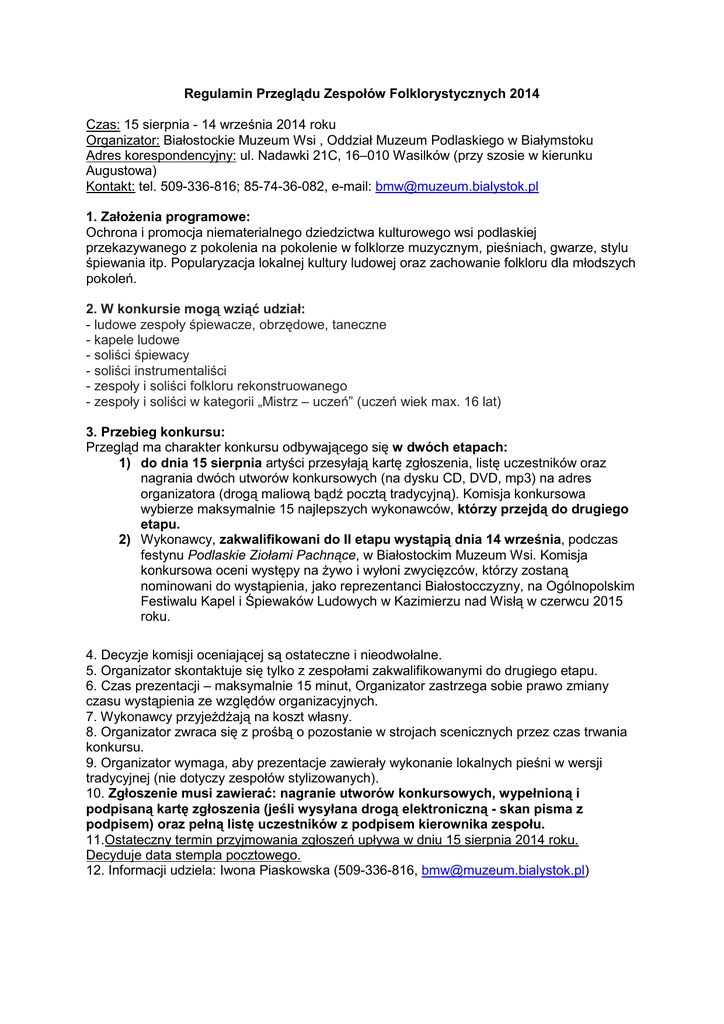 Regulamin Przeglądu Zespołów Folklorystycznych 2014 Czas: 15 sierpnia - 14 września 2014 roku Organizator: Białostockie Muzeum Wsi , Oddział Muzeum Podlaskiego w Białymstoku Adres korespondencyjny: ul. Nadawki 21C, 16–010 Wasilków (przy szosie w kierunku Augustowa) Kontakt: tel. 509-336-816; 85-74-36-082, e-mail: [email protected] 1. ZałoŜenia programowe: Ochrona i promocja niematerialnego dziedzictwa kulturowego wsi podlaskiej przekazywanego z pokolenia na pokolenie w folklorze muzycznym, pieśniach, gwarze, stylu śpiewania itp. Popularyzacja lokalnej kultury ludowej oraz zachowanie folkloru dla młodszych pokoleń. 2. W konkursie mogą wziąć udział: - ludowe zespoły śpiewacze, obrzędowe, taneczne - kapele ludowe - soliści śpiewacy - soliści instrumentaliści - zespoły i soliści folkloru rekonstruowanego - zespoły i soliści w kategorii „Mistrz – uczeń” (uczeń wiek max. 16 lat) 3. Przebieg konkursu: Przegląd ma charakter konkursu odbywającego się w dwóch etapach: 1) do dnia 15 sierpnia artyści przesyłają kartę zgłoszenia, listę uczestników oraz nagrania dwóch utworów konkursowych (na dysku CD, DVD, mp3) na adres organizatora (drogą maliową bądź pocztą tradycyjną). Komisja konkursowa wybierze maksymalnie 15 najlepszych wykonawców, którzy przejdą do drugiego etapu. 2) Wykonawcy, zakwalifikowani do II etapu wystąpią dnia 14 września, podczas festynu Podlaskie Ziołami Pachnące, w Białostockim Muzeum Wsi. Komisja konkursowa oceni występy na Ŝywo i wyłoni zwycięzców, którzy zostaną nominowani do wystąpienia, jako reprezentanci Białostocczyzny, na Ogólnopolskim Festiwalu Kapel i Śpiewaków Ludowych w Kazimierzu nad Wisłą w czerwcu 2015 roku. 4. Decyzje komisji oceniającej są ostateczne i nieodwołalne. 5. Organizator skontaktuje się tylko z zespołami zakwalifikowanymi do drugiego etapu. 6. Czas prezentacji – maksymalnie 15 minut, Organizator zastrzega sobie prawo zmiany czasu wystąpienia ze względów organizacyjnych. 7. Wykonawcy przyjeŜdŜają na koszt własny. 8. Organizator zwraca się z prośbą o pozostanie w strojach scenicznych przez czas trwania konkursu. 9. Organizator wymaga, aby prezentacje zawierały wykonanie lokalnych pieśni w wersji tradycyjnej (nie dotyczy zespołów stylizowanych). 10. Zgłoszenie musi zawierać: nagranie utworów konkursowych, wypełnioną i podpisaną kartę zgłoszenia (jeśli wysyłana drogą elektroniczną - skan pisma z podpisem) oraz pełną listę uczestników z podpisem kierownika zespołu. 11.Ostateczny termin przyjmowania zgłoszeń upływa w dniu 15 sierpnia 2014 roku. Decyduje data stempla pocztowego. 12. Informacji udziela: Iwona Piaskowska (509-336-816, [email protected])