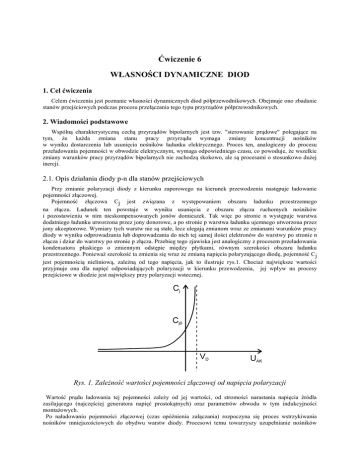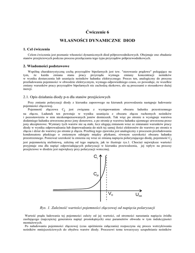 Ćwiczenie 6 WŁASNOŚCI DYNAMICZNE DIOD 1. Cel ćwiczenia Celem ćwiczenia jest poznanie własności dynamicznych diod półprzewodnikowych. Obejmuje ono zbadanie stanów przejściowych podczas procesu przełączania tego typu przyrządów półprzewodnikowych. 2. Wiadomości podstawowe Wspólną charakterystyczną cechą przyrządów bipolarnych jest tzw. "sterowanie prądowe" polegające na tym, że każda zmiana stanu pracy przyrządu wymaga zmiany koncentracji nośników w wyniku dostarczenia lub usunięcia nośników ładunku elektrycznego. Proces ten, analogiczny do procesu przeładowania pojemności w obwodzie elektrycznym, wymaga odpowiedniego czasu, co powoduje, że wszelkie zmiany warunków pracy przyrządów bipolarnych nie zachodzą skokowo, ale są procesami o stosunkowo dużej inercji. 2.1. Opis działania diody p-n dla stanów przejściowych Przy zmianie polaryzacji diody z kierunku zaporowego na kierunek przewodzenia następuje ładowanie pojemności złączowej. Pojemność złączowa Cj jest związana z występowaniem obszaru ładunku przestrzennego na złączu. Ładunek ten powstaje w wyniku usunięcia z obszaru złącza ruchomych nośników i pozostawieniu w nim nieskompensowanych jonów domieszek. Tak więc po stronie n występuje warstwa dodatniego ładunku utworzona przez jony donorowe, a po stronie p warstwa ładunku ujemnego utworzona przez jony akceptorowe. Wymiary tych warstw nie są stałe, lecz ulegają zmianom wraz ze zmianami warunków pracy diody w wyniku odprowadzania lub doprowadzania do nich tej samej ilości elektronów do warstwy po stronie n złącza i dziur do warstwy po stronie p złącza. Przebieg tego zjawiska jest analogiczny z procesem przeładowania kondensatora płaskiego o zmiennym odstępie między płytkami, równym szerokości obszaru ładunku przestrzennego. Ponieważ szerokość ta zmienia się wraz ze zmianą napięcia polaryzującego diodę, pojemność Cj jest pojemnością nieliniową, zależną od tego napięcia, jak to ilustruje rys.1. Chociaż największe wartości przyjmuje ona dla napięć odpowiadających polaryzacji w kierunku przewodzenia, jej wpływ na procesy przejściowe w diodzie jest największy przy polaryzacji wstecznej. Rys. 1. Zależność wartości pojemności złączowej od napięcia polaryzacji Wartość prądu ładowania tej pojemności zależy od jej wartości, od stromości narastania napięcia źródła zasilającego (najczęściej generatora napięć prostokątnych) oraz parametrów obwodu w tym indukcyjności montażowych. Po naładowaniu pojemności złączowej (czas opóźnienia załączania) rozpoczyna się proces wstrzykiwania nośników mniejszościowych do obydwu warstw diody. Procesowi temu towarzyszy uzupełnianie nośników większościowych poprzez złącza „ms”. W rezultacie koncentracja nośników w diodzie rośnie zachowując zasadę obojętności ładunku. Ten wzrost powoduje zwiększenie prawdopodobieństwa rekombinacji co w rezultacie uniemożliwia dalszy wzrost koncentracji nośników. Z kolei wzrost koncentracji nośników powoduje zmniejszenie rezystywności obydwu warstw półprzewodnika, czemu towarzyszy zmniejszanie się spadku napięcia na diodzie a tym samym umożliwia dalszy wzrost prądu w obwodzie (czas załączania). W chwili zmiany napięcia generatora prąd w obwodzie zmienia swój kierunek usuwając nośniki z diody (czas opóźnienia wyłączania). Oprócz tego nośniki są usuwane przez proces rekombinacji. Napięcie na diodzie ulega niewielkiemu obniżeniu wskutek zmiany kierunku spadku napięcia na rezystancji półprzewodnika. Jednak ponieważ przy dużej koncentracji nośników nie może powstać bariera na złączu „pn” dodatnie napięcie na diodzie utrzymują bariery na złączach „ms”. Prąd wsteczny diody powoduje usuwanie nośników mniejszościowych przez ich przemieszczenie do warstw sąsiednich gdzie stają się nośnikami większościowymi zaś nośniki większościowe przechodząc przez złącza „ms” oddają swoją energię z powrotem do obwodu. Po usunięciu nośników z diody powstaje znów bariera na złączu „pn” (czas wyłączania) powodując początkowo zmniejszenie napięcia na diodzie a następnie w wyniku ładowania pojemności złączowej napięcie na diodzie jest znów ujemne. Najczęściej z uwagi na jego prostotę do analizy obwodów zawierających diody używa się schematu zastępczego przedstawionego na rys. 2. Rys.2. Schemat zastępczy diody p-n dla stanów dynamicznych Występująca w tym schemacie pojemność dyfuzyjna Cd ma odwzorować procesy gromadzenia i usuwania energii nagromadzonej w diodzie w postaci energii nośników. Pojemność ta jest również silnie nieliniowa bowiem ilość energii nagromadzonej w nośnikach zależy od prądu zaś energia w pojemności zależy od napięcia. Stąd mimo swojej prostoty używanie tego schematu zastępczego nie jest zbyt łatwe a wyniki analizy zwłaszcza układów komutacyjnych obarczone znacznymi błędami. Mimo to, jest to schemat najczęściej przedstawiany w literaturze. Rys.3. Rozkłady nośników w diodzie p-n spolaryzowanej w kierunku przewodzenia Schemat zastępczy diody rzeczywistej dla stanów dynamicznych przedstawiono na rys.2. Obok elementów odpowiedzialnych za kształt charakterystyki statycznej, do których należą dioda idealna D i,(patrz opis ćwicz. „Paramtery statyczne diod półprzewodnikowych”), rezystancja szeregowa Rs oraz konduktancja upływu Gu, zawiera on dwie pojemności: pojemność złączową Cj i pojemność dyfuzyjną Cd . 2.2. Przełączanie diody p-n. Zasadniczą rolą diody w układach przełączających jest umożliwianie przepływu prądu w jednym kierunku i blokowanie jego przepływu w kierunku przeciwnym. Dioda idealna pracująca w takim układzie powinna charakteryzować się zerową rezystancją w kierunku przewodzenia, nieskończenie wielką rezystancją w kierunku zaporowym oraz zupełnym brakiem inercji podczas przełączania.