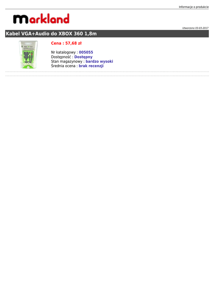Informacje o produkcie Utworzono 03-03-2017 Kabel VGA+Audio do XBOX 360 1,8m Cena : 57,68 zł Nr katalogowy : 005055 Dostępność : Dostępny Stan magazynowy : bardzo wysoki Średnia ocena : brak recenzji