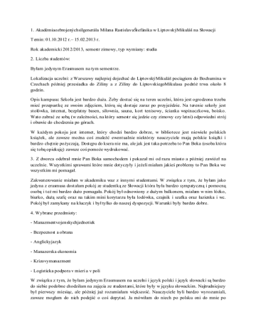 1. Akadémiaozbrojenýchsílgenerála Milana RastislavaŠtefánika w LiptovskýMikuláš na Słowacji T emin: 01.10.2012 r.– 15.02.2013 r. Rok akademicki 2012/2013, semestr zimowy, typ wymiany: studia 2. Liczba studentów: Byłam jedynym Erasmusem na tym semestrze. Lokalizacja uczelni: z Warszawy najlepiej dojechać do LiptovskýMikuláš pociągiem do Bochumina w Czechach później przesiadka do Ziliny a z Ziliny do LiptovskiegoMikulasa podróż trwa około 8 godzin. Opis kampusu: Szkoła jest bardzo duża. Żeby dostać się na teren uczelni, która jest ogrodzona trzeba mieć przepustkę ze swoim zdjęciem, którą się dostaje zaraz po przyjeździe. Na terenie szkoły jest stołówka, internat, bezpłatny basen, siłownia, sauna, kort tenisowy, ścianka wspinaczkowa, boisko. Wato zabrać ze sobą (w zależności, na który semestr się jedzie czy zimowy czy letni) odpowiedni strój i obuwie do chodzenia po górach. W każdym pokoju jest internet, który chodzi bardzo dobrze, w bibliotece jest niewiele polskich książek, ale zawsze można coś znaleźć ewentualnie niektórzy nauczyciele mają polskie książki i bardzo chętnie pożyczają. Dostępu do ksera nie ma, ale jak jest taka potrzeba to Pan Boka (osoba która się tobą opiekuję) zawsze coś pomoże wydrukować. 3. Z dworca odebrał mnie Pan Boka samochodem i pokazał mi od razu miasto a później zawiózł na uczelnie. Wszystkimi sprawami które mnie dotyczyły i jeżeli miałam jakieś problemy to Pan Boka we wszystkim mi pomagał. Zakwaterowanie miałam w akademiku waz z innymi studentami. W związku z tym, że byłam jako jedyna z erasmusa dostałam pokój ze studentką ze Słowacji która była bardzo sympatyczną i pomocną osobą i też mi bardzo dużo pomagała. Pokój był odnowiony z dużym balkonem, miałam w nim łóżko, biurko, dużą szafę oraz na takim mini korytarzu była lodówka, czajnik i szafka oraz łazienka i wc. Pokój był zamykany na kluczyk i był tylko do naszej dyspozycji. Warunki były bardzo dobre. 4. Wybrane przedmioty: - Manazmentvojenskychjednotiek - Bezpecnost a obrana - Anglickyjazyk - Manazerska ekonomia - Krizovymanazment - Logisticka podpora v mieri a v poli W związku z tym, że byłam jedynym Erasmusem na uczelni i język polski i język słowacki są bardzo do siebie podobne chodziłam na zajęcia ze studentami, które były w języku słowackim. Najtrudniejszy był pierwszy miesiąc, ale później już rozumiałam większość. Nauczyciele byli bardzo wyrozumiali, zawsze mogłam do nich podejść o coś dopytać. Ja mówiłam do niech po polsku oni do mnie po słowacku i nie było żadnego problemu z czasem jak poznawałam jakieś słówka słowackie to starałam się mówić po słowacku. Wyjątkiem były zajęcia w języka angielskiego gdzie wszystko było po angielsku, każdy student AOS umie na bardzo wysokim poziomie język angielski. Przedmioty Manazmentvojenskychjednotiek i bezpecnost a obrana miałam prowadzone indywidualnie ponieważ te zajęcia nie były powadzone w semestrze zimowym. Na zaliczenie tych przedmiotów musiałam zrobić po 2 prezentacje w języku polskim i później je przedstawiałam. Anglickyjazyk miałam zaliczenie wraz ze studentami, pisałam wszystkie sprawdziany i robiłam prezentacje tak jak każdy student oczywiście po angielsku. Manazerska ekonomia na wykłady chodziałam ze studentami a na zaliczenie miałam napisać prace na 10 stron na temat, który dostałam do wyboru 1 z 10 i dodatkowo zrobić o tym prezentacje i przedstawić studentom wszystko w języku polskim. Krizovymanazment chodziłam na wykłady ze studentami a na zaliczenie miałam zrobić prezentacje oraz napisać pracę porównując strategię bezpieczeństwa Polski i Słowacji. Logisticka podpora v mieri a v poli była badzo ciekawym przedmiotem, ponieważ oprócz normalnych wykładów jeździłam ze studentami w ramach zajęć do jednostek wojskowych i oglądaliśmy wszystkie sprzęty, jakie Słowacja ma w razie np. wojny, byliśmy tez w największym na Słowacji szpitalu polowym na zaliczenie była prezentacja. Z tego, co mi wiadomo, jeżeli byłoby więcej Erasmusów z innych krajów zajęcia wtedy są prowadzone w języku angielskim. 5. Wydatki: Akademik: Płaciłam około 4 euro za dobę, jeżeli jechałam do Polski albo gdzieś na weekend to nie płaciłam. Za każdy miesiąc wypełnia się dokument i wpisuje dni, w jakie się było na akademiku. Wyżywienie: Śniadanie 1,66 euro, obiad 2,08 euro, kolacja 1,66 euro. Ja kupowałam tylko obiad, który składał się z pierwszego i drugiego dania (zawsze są do wyboru 4 opcje) i czasem deseru. Obiady były bardzo dobre i duże. Akademia jest oddalona kawałek od miasteczka można się dostać najszybciej taksówką płatna 4 euro albo około 15 minut do centrum autobusem 0,50-0,70 euro. Przystanek jest obok akademii. Autobusy kursują w miarę często. Jeden przystanek autobusowy albo 20 minut spacerkiem od akademii jest T esco, McDonald, Kaufland. Sądzę, ze stypendium w z upełności starcza na utrzymanie się na Sło wacji. 6. Strona towarzyska: Studenci są bardzo sympatyczni i bardzo chętnie zabierali mnie do miasta, na dyskoteki. W mieście jest jedna duża dyskoteka czynna w piątek i sobotę, ale w tygodniu też są otwarte bary gdzie jeździliśmy się bawić. Nie daleko jest też T atralandia a w Popradzie jest AquaCity. Nie daleko od akademii jest Jasna a dla lubiących chodzić po górach to jest raj. 7. Najbardziej zaskoczyła mnie sympatia ludzi do Polaków, wszyscy byli bardzo sympatyczni, mili, zawsze pomocni. Nie miałam żadnych nie miłych wydarzeń. Miałam koleżanki, które zabierały mnie na weekend do swoich domów i dzięki temu poznałam różne zakątki Słowacji oraz ludzi spoza akademii, co było bardzo fajnym przeżyciem. Bardzo się cieszyłam, że byłam sama z Erasmusów, bo dzięki temu poznałam język słowacki. Zaklimatyzowanie się zajęło mi około tygodnia, studenci musieli się do m