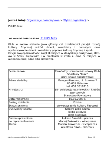 Jesteś tutaj: Organizacje pozarządowe > Wykaz organizacji > PULKS Max 01 kwiecień 2010 10:37:00 PULKS Max Klub w swoim statucie jako główny cel działalności przyjął rozwój kultury fizycznej wśród dzieci, młodzieży i dorosłych oraz wychowywanie dzieci i młodzieży poprzez kulturę fizyczną i sport. Dzięki swojej działalności zajął III miejsce w klasyfikacji drużynowej UKSów w Solcu Kujawskim i w Siedlcach w 2004 r. oraz IV miejsce w autonomicznej lidze piłki siatkowej. Pełna nazwa: Adres siedziby: Nr rejestru: Data rejestracji: Zasięg działania: Status prawny: Dyscypliny sportu: Osoba uprawniona do reprezentowania Klubu: http://www.osielsko.pl/blog/10_5-pulks_max.html Parafialny Uczniowski Ludowy Klub Sportowy "Max" przy Szkole Podstawowej Maksymilianowo, ul. Szkolna 7 86-031 Osielsko tel. 052 3818713 18- ewidencja uczniowskich klubów sportowych Starostwo Powiatowe 16.01.2000 r. Polska stowarzyszenie kultury fizycznej halowa piłka nożna lekka atletyka piłka siatkowa Łukasz Bazelak - prezes Maciej Zakowicz - wiceprezes Marian Krawczuk - wiceprezes Wiesława Śliwa - skarbnik Strona 1/5 Sposób reprezentacji: Wsparcie finansowe z budżetu gminy Osielsko: Michał Bazelak - sekretarz Do zawierania umów i składania oświadczeń woli we wszystkich sprawach majątkowych i innych Klubu w jego imieniu podpisują dwaj członkowie Zarządu: Prezes lub Wiceprezes i Skarbnik. Klub korzystał z dotacji udzielonych mu z budżetu gminy Osielsko: w 2009 roku przyznano mu kwotę 29 000 zł na realizację zadań z zakresu sportu kwalifikowanego, z czego rozliczono, zgodnie ze złożonym sprawozdaniem, 28 841,37 zł, wykorzystując również uzyskane odsetki bankowe. Rozliczenia następowały terminowo. w 2010 roku przyznano mu kwotę 29 000 zł na realizację zadań z zakresu rozwoju sportu kwalifikowanego, z czego Klub rozliczył 28.961,35 zł. Sprawozdania składano terminowo i udzielano wszystkich żądanych informacji, jednakże źle zaplanowano wydatki sekcji lekkiej atletyki. W związku z powyższym wzięto ten fakt pod uwagę http://www.osielsko.pl/blog/10_5-pulks_max.html Strona 2/5 przy podziale środków na kolejny rok. w 2011 roku przyznano mu kwotę 23 000 zł na działania z zakresu upowszechniania i rozwoju sportu, co rozliczono w całości, składając właściwe sprawozdania w terminach wskazanych w umowie. w 2012 roku przyznano mu kwotę 28 800 zł na działania z zakresu upowszechniania i rozwoju sportu. Wszystkie sprawozdania zostały sporządzone rzetelnie i składane były w terminach wyznaczonych umowami. Rozliczono całość przyznanych środków. w 2013 roku przyznano Klubowi dotację w kwocie 26 500 zł na działania z zakresu upowszechniania i rozwoju sportu na prowadzenie zajęć z piłki nożnej i siatkowej oraz szkolenia sportowego z zapasów. Przelew dotacji nastąpił w dwóch wyznaczonych przez Klub ratach. Rozliczenia składano ratalnie wg wy terminów zapisanych w umowie. Rozliczono całość http://www.osielsko.pl/blog/10_5-pulks_max.html Strona 3/5 przyznanych środków. Kilka szczegółów na temat wykorzystania dotacji. w 2014 roku przyznano Klubowi dotację w kwocie 9 500 zł na działania z zakresu upowszechniania i rozwoju sportu na prowadzenie zajęć z piłki siatkowej i nożnej. Przydzielając środki uwzględniono likwidację sekcji zapasów (zawodnicy zostali przeniesieni do nowego klubu Victorii Osielsko). Dotacja została przekazana w jednej transzy. Rozliczenie złożono po terminie wyznaczonym umową. Rozliczono całość przyznanych środków. Kilka szczegółów na temat wykorzystania dotacji. w 2015 roku Klub nie otrzymał dotacji. Szczegółowe informacje na temat wykorzystania środków finansowych przyznanych organizacjom z budżetu gminy w 2015 roku znajdują się w tekście wprowadzającym (sprawozdanie) u góry strony. http://www.osielsko.pl/blog/10_5-pulks_max.html Strona 4/5 Informacje o wykorzystaniu środków w pierwszym półroczu 2016 roku zawiera Sprawozdanie z wykonania budżetu. Data ostatniej aktualizacji: 22 kwietnia 2016 r. Informacje uzyskano z Parafialnego Uczniowskiego Ludowego Klubu Sportowego "Max", wypisu z rejestru oraz ze stanowiska ds. współpracy z organizacjami pozarządowymi. drukuj Wróć http://www.osielsko.pl/blog/10_5-pulks_max.html Powered by TCPDF (www.tcpdf.org) Strona 5/5