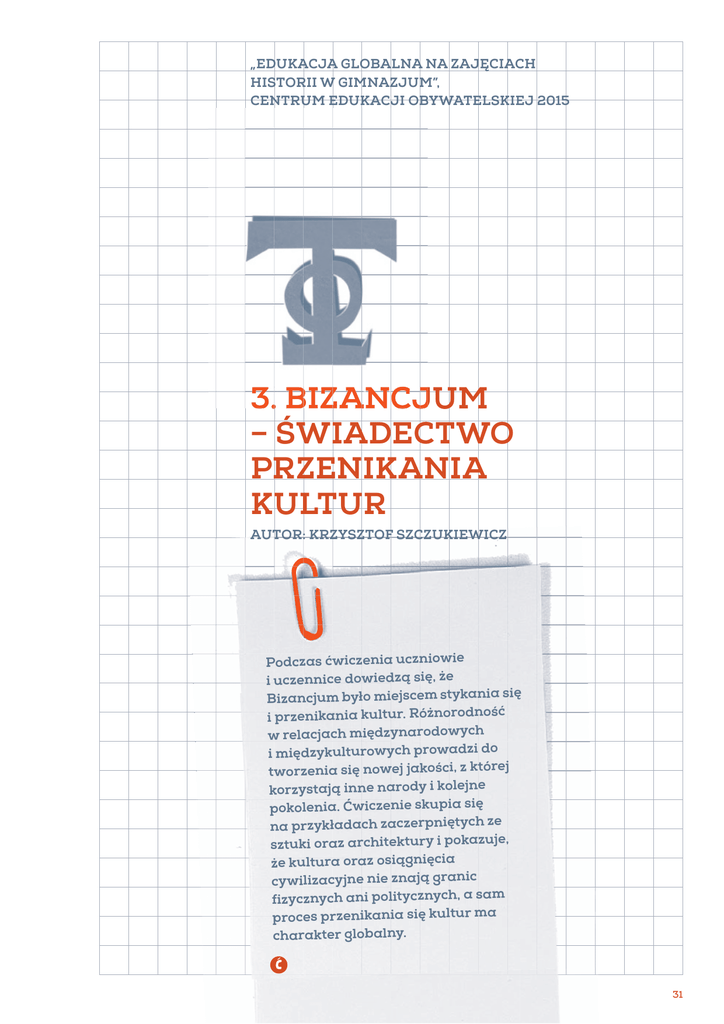 „EDUKACJA GLOBALNA NA ZAJĘCIACH HISTORII W GIMNAZJUM”, CENTRUM EDUKACJI OBYWATELSKIEJ 2015 3. BIZANCJUM – ŚWIADECTWO PRZENIKANIA KULTUR AUTOR: KRZYSZTOF SZCZUKIEWICZ Podczas ćwiczenia uczniowie i uczennice dowiedzą się, że Bizancjum było miejscem stykania się i przenikania kultur. Różnorodność w relacjach międzynarodowych i międzykulturowych prowadzi do tworzenia się nowej jakości, z której korzystają inne narody i kolejne pokolenia. Ćwiczenie skupia się na przykładach zaczerpniętych ze sztuki oraz architektury i pokazuje, że kultura oraz osiągnięcia cywilizacyjne nie znają granic fizycznych ani politycznych, a sam proces przenikania się kultur ma charakter globalny. Ô 31 3. BIZANCJUM – ŚWIADECTWO PRZENIKANIA KULTUR Zagadnienia: Różnorodność i stosunki międzykulturowe Czas trwania: 25 minut Cele ćwiczenia: Umiejscowisz Bizancjum w czasie i przestrzeni. min 0 Wytłumaczysz pojęcia: mozaika, ikona, Kościół wschodni. Wyjaśnisz, na czym polega przenikanie się kultur i jakie wartości płyną z tego w procesie historycznym. Związek z podstawą programową: I, II, 10.2 Środki dydaktyczne i materiały: Załączniki Słownik języka polskiego lub słownik pojęć historycznych Mapa ścienna „Imperium Rzymskie” lub „Cesarstwo Bizantyjskie” Atlas historyczny PRZEBIEG ĆWICZENIA: 1. 4 4 Zapisz na tablicy słowo „kultura” i przeprowadź burzę pomysłów, pytając młodzież o to, jakie ma z nim skojarzenia (mogą to być np.: sztuka, architektura, język, obyczaje, moda, struktura władzy, ceremonie itp.). Najistotniejsze pojęcia, wybrane przez uczniów i uczennice, zapisz na tablicy. Możesz też przytoczyć (bądź poprosić o to ochotnika/ochotniczkę) definicję słowa „kultura” ze słownika języka polskiego lub słownika pojęć historycznych. 5 1 2. Rozdaj młodzieży wydrukowane taśmy chronologiczne (załącznik nr 1). Wyjaśnij, że ma na nich zaznaczać daty, które pojawią się w czasie miniwykładu. 6 1 3. Poproś wybraną uczennicę lub ucznia o wskazanie na mapie ściennej wschodniego cesarstwa rzymskiego oraz jego stolicy. 4. Przeprowadź miniwykład na temat Bizancjum. Podkreśl centralne położenie Konstantyno12 6 pola. Przypomnij, w jaki sposób takie położenie sprzyjało wielostronnym kontaktom kulturowym, handlowym i bogaceniu się Bizancjum. Nawiąż do późniejszych losów Konstantynopola, wyjaśniając, kto nim władał, a także kwestię zmiany nazwy na Stambuł. Na koniec poproś chętne osoby o zaprezentowanie swoich zapisków z taśm chronologicznych. 5. Powiedz, że w dalszej części ćwiczenia uczniowie i uczennice będą pracować w parach. Każ20 8 da para otrzyma jeden z dwóch zestawów materiałów pomocniczych dotyczących architektury i sztuki (załączniki nr 2 i 3), a jej zadaniem będzie wcielenie się w krytyków/krytyczki sztuki, porównanie otrzymanych zestawów ikonograficznych oraz zaprezentowanie swoich ustaleń na forum klasy (komentarze do materiałów znajdziesz w załączniku nr 4). 6. Na forum omówcie spostrzeżenia i komentarze uczniów i uczennic. Wspólnie odpowiedzcie na pytania: Jaką wartość niesie ze sobą przenikanie się kultur? W jaki sposób przejawia się to współcześnie? 25 5 W podsumowaniu ćwiczenia zwróć uwagę na to, że kultura Bizancjum budziła zainteresowanie wielu ówczesnych narodów, czerpiących z niej inspirację. Przypomnij także lub wprowadź datę 1453 r., upadek Cesarstwa Bizantyjskiego. Zachęć uczniów i uczennice do poszukania analogii we współczesnej kulturze – z jakiego rodzaju wpływami kulturowymi mamy obecnie do czynienia? (możesz zaproponować to jako element pracy domowej). Źródła: Oktawiusz Jurewicz (red.), Encyklopedia Kultury Bizantyńskiej, Warszawa 2002. Władysław Kopaliński, Słownik wyrazów obcych i zwrotów obcojęzycznych z almanachem, Warszawa 2000. Tadeusz Mosiek, Historia, Starożytność i średniowiecze – Ćwiczenia ze źródłami dla gimnazjum, Warszawa 2003. Victoria Chico Picaza, Francesc Massip Bonet, Historia sztuki świata, t. 2, Bizancjum, islam, sztuka romańska, Warszawa 1999. Załączniki: Załącznik nr 1 – Taśma chronologiczna Załącznik nr 2 – Materiał ikonograficzny: Architektura Załącznik nr 3 – Materiał ikonograficzny: Sztuka Załącznik nr 4 – Materiał pomocniczy: Komentarze do materiałów ikonograficznych 32 3. BIZANCJUM – ŚWIADECTWO PRZENIKANIA KULTUR ZAŁĄCZNIK NR 1 – TAŚMA CHRONOLOGICZNA Zaznacz na taśmie chronologicznej najważniejsze daty dotyczące Bizancjum: 1000 R. 1500 R. 3. BIZANCJUM – ŚWIADECTWO PRZENIKANIA KULTUR ZAŁĄCZNIK NR 2 – MATERIAŁ IKONOGRAFICZNY ARCHITEKTURA Hagia Sophia, zbudowana w I poł. VI w., ówczesny Konstantynopol (widok współczesny, Istambuł) Źródło: Arild Vågen, CC BY-SA 3.0, http://en.wikipedia. org/wiki/File:Hagia_Sophia_ Mars_2013.jpg Bazylika Świętego Marka w Wenecji, XI w. Źródło: Jakub Hałun, GNU FDL: http://commons.wikimedia.org/ wiki/File:20110722_Venice_ Basilica_di_San_Marco_4449.jpg 3. BIZANCJUM – ŚWIADECTWO PRZENIKANIA KULTUR 33 ZAŁĄCZNIK NR 1 – TAŚMA CHRONOLOGICZNA Zaznacz na taśmie chronologicznej najważniejsze daty dotyczące Bizancjum: 1000 R. 1500 R. 3. BIZANCJUM – ŚWIADECTWO PRZENIKANIA KULTUR ZAŁĄCZNIK NR 3 – MATERIAŁ IKONOGRAFICZNY SZTUKA Hagia Sophia, mozaika z I poł. X w. Źródło: http://hu.wikipedia. org/wiki/F%C3%A1jl:Istanbul. Hagia_Sophia075.jpg Sobór w Kijowie, mozaika z XI w. Źródło: http://pl.wikipedia.org/ wiki/Plik:Oranta-Kyiv.jpg 34 3. BIZANCJUM – ŚWIADECTWO PRZENIKANIA KULTUR ZAŁĄCZNIK NR 4 – MATERIAŁ POMOCNICZY KOMENTARZE DO MATERIAŁÓW IKONOGRAFICZNYCH MATERIAŁ IKONOGRAFICZNY: ARCHITEKTURA Porównanie kościoła Mądrości Bożej (Hagia Sophia) w Konstantynopolu z bazyliką Świętego Marka w Wenecji Hagia Sophia, będąc świątynią chrześcijańską (przed 1453 r.; później została przez Turków zmieniona w meczet), nosiła nazwę ś