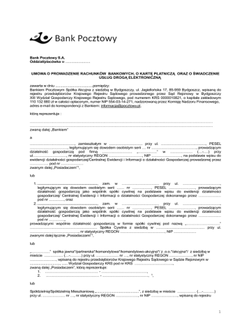 Bank Pocztowy S.A. Oddział/placówka w ......................... UMOWA O PROWADZENIE RACHUNKÓW BANKOWYCH, O KARTĘ PŁATNICZĄ ORAZ O ŚWIADCZENIE USŁUG DROGĄ ELEKTRONICZNĄ zawarta w dniu ......................................pomiędzy: Bankiem Pocztowym Spółka Akcyjna z siedzibą w Bydgoszczy, ul. Jagiellońska 17, 85-959 Bydgoszcz, wpisaną do rejestru przedsiębiorców Krajowego Rejestru Sądowego prowadzonego przez Sąd Rejonowy w Bydgoszczy XIII Wydział Gospodarczy Krajowego Rejestru Sądowego, pod numerem KRS 0000010821, o kapitale zakładowym 110 132 880 zł w całości opłaconym, numer NIP 554-03-14-271, nadzorowaną przez Komisję Nadzoru Finansowego, adres e-mail do korespondencji z Bankiem: [email protected], którą reprezentuje : ………………………………………………………………………………………………………………………………… ………………………………………………………………………………………………………………………………… zwaną dalej „Bankiem” a ………………………………, zamieszkałym w ……………………… przy ul. ………………………………, PESEL …………………………, legitymującym się dowodem osobistym serii … nr ………………………………, prowadzącym działalność gospodarczą pod firmą …………………… „……………” w ……………… (…-.…) przy ul………………………, nr statystyczny REGON ………………………, NIP ……………………, na podstawie wpisu do ewidencji działalności gospodarczej/Centralnej Ewidencji i Informacji o działalności Gospodarczej prowadzonej przez …………… pod nr ……………… zwanym dalej „Posiadaczem”1, lub 1. …………………………………………, zam. w ………………………… przy ul. …………………………, legitymującym się dowodem osobistym serii …… nr ……………, PESEL …………………, prowadzącym działalność gospodarczą jako wspólnik spółki cywilnej na podstawie wpisu do ewidencji działalności gospodarczej/ Centralnej Ewidencji i Informacji o działalności Gospodarczej dokonanego przez ……………… pod nr …………, oraz 2. …………………………………………, zam. w ………………………… przy ul. …………………………, legitymującym się dowodem osobistym serii …… nr ……………, PESEL …………………, prowadzącym działalność gospodarczą jako wspólnik spółki cywilnej na podstawie wpisu do ewidencji działalności gospodarczej/ Centralnej Ewidencji i Informacji o działalności Gospodarczej dokonanego przez ……………… pod nr …………,, prowadzącymi wspólnie działalność gospodarczą w formie spółki cywilnej pod nazwą „………………………” ……………………………………………… Spółka Cywilna z siedzibą w ………………………………… przy ul. …………………………………, nr statystyczny REGON ………………………………, NIP ……………… zwanymi dalej łącznie „Posiadaczami”1, lub „……………” spółka jawna*/partnerska*/komandytowa*/komandytowo-akcyjna*/ z .o.o.*/akcyjna*/ z siedzibą w mieście …………… (…-………) przy ul. ……………… nr …, nr statystyczny REGON ………………, nr NIP …………………, wpisaną do rejestru przedsiębiorców Krajowego Rejestru Sądowego w Sądzie Rejonowym w .............................., ...... Wydział Gospodarczy KRS pod nr KRS …………………………., zwaną dalej „Posiadaczem”, którą reprezentuje: 1. …………………………………… - ………………………………, 2. …………………………………… - ………………………………, 1, lub Spółdzielnią/Spółdzielnią Mieszkaniową „...........................................”, z siedzibą w mieście …………… (…-………) przy ul. ……………… nr …, nr statystyczny REGON ………………, nr NIP …………………, wpisaną do rejestru 1 przedsiębiorców Krajowego Rejestru Sądowego w Sądzie Rejonowym w .............................., ...... Wydział Gospodarczy KRS, pod nr KRS …………………………. zwaną dalej „Posiadaczem”, reprezentowaną przez: 1. …………………………………… - ………………………………, 2. …………………………………… - ………………………………, 1 lub Wspólnotą Mieszkaniową ul. ................................................, w mieście ........................... (.....-.........) nr statystyczny REGON ……………..………………, nr NIP …………………………………………. zwaną dalej „Posiadaczem” 1, reprezentowaną przez Zarząd w składzie: ....................................................................................................................................................... (imię i nazwisko, nr dow.os.) ...................................................................................................................................................... imię i nazwisko, nr dow.os.) reprezentowaną przez Zarządcę ………………………………, PESEL …………………………, legitymującym się dowodem osobistym serii … nr ………………………………, prowadzącym działalność gospodarczą pod firmą …………………… „……………” w ……………… (…-.…) przy ul………………………, nr statystyczny REGON ………………………, NIP ……………………, na podstawie wpisu do ewidencji działalności gospodarczej/Centralnej Ewidencji i Informacji o działalności Gospodarczej prowadzonej przez …………… pod nr ……………… „……………” spółka jawna*/partnerska*/komandyto