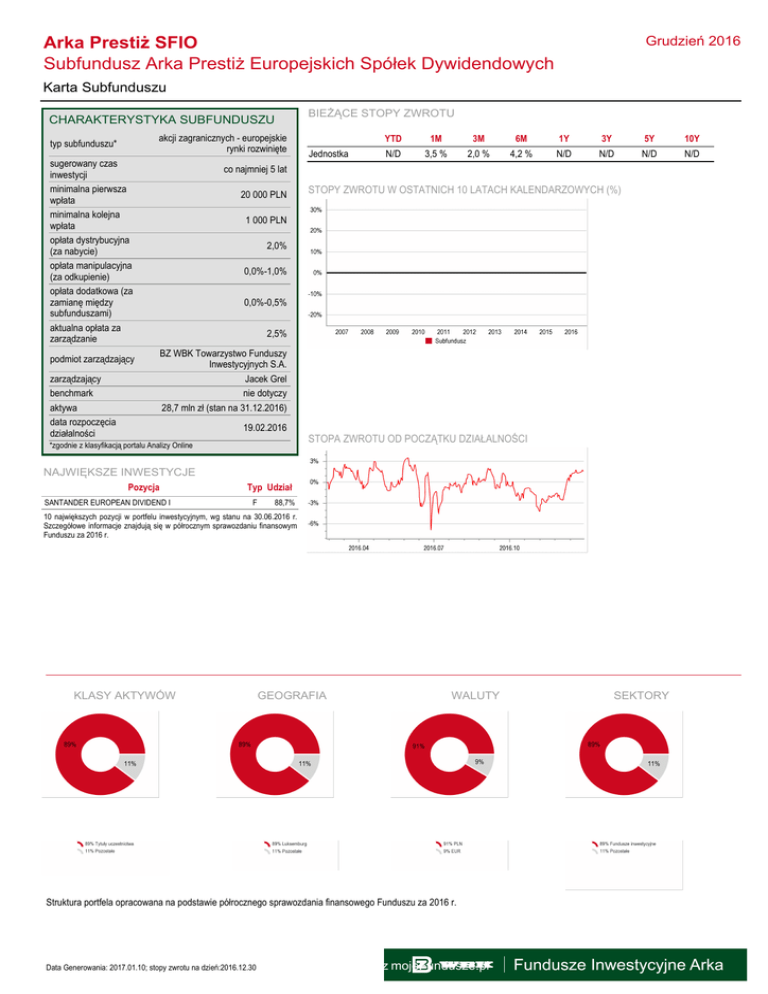 Grudzień 2016 Arka Prestiż SFIO Subfundusz Arka Prestiż Europejskich Spółek Dywidendowych Karta Subfunduszu CHARAKTERYSTYKA SUBFUNDUSZU akcji zagranicznych - europejskie rynki rozwinięte typ subfunduszu* sugerowany czas inwestycji minimalna pierwsza wpłata minimalna kolejna wpłata opłata dystrybucyjna (za nabycie) opłata manipulacyjna (za odkupienie) opłata dodatkowa (za zamianę między subfunduszami) aktualna opłata za zarządzanie podmiot zarządzający zarządzający benchmark aktywa data rozpoczęcia działalności BIEŻĄCE STOPY ZWROTU Jednostka YTD 1M 3M 6M 1Y 3Y 5Y 10Y N/D 3,5 % 2,0 % 4,2 % N/D N/D N/D N/D co najmniej 5 lat 20 000 PLN STOPY ZWROTU W OSTATNICH 10 LATACH KALENDARZOWYCH (%) 1 000 PLN 2,0% 0,0%-1,0% 0,0%-0,5% 2,5% BZ WBK Towarzystwo Funduszy Inwestycyjnych S.A. Jacek Grel nie dotyczy 28,7 mln zł (stan na 31.12.2016) 19.02.2016 *zgodnie z klasyfikacją portalu Analizy Online STOPA ZWROTU OD POCZĄTKU DZIAŁALNOŚCI NAJWIĘKSZE INWESTYCJE Pozycja SANTANDER EUROPEAN DIVIDEND I Typ Udział F 88,7% 10 największych pozycji w portfelu inwestycyjnym, wg stanu na 30.06.2016 r. Szczegółowe informacje znajdują się w półrocznym sprawozdaniu finansowym Funduszu za 2016 r. KLASY AKTYWÓW GEOGRAFIA WALUTY Struktura portfela opracowana na podstawie półrocznego sprawozdania finansowego Funduszu za 2016 r. Data Generowania: 2017.01.10; stopy zwrotu na dzień:2016.12.30 Dokument pobrano z mojeFundusze.pl SEKTORY ZASADY POLITYKI INWESTYCYJNEJ n n n ZARZĄDZAJĄCY subfundusz inwestuje do 100% wartości Aktywów subfunduszu w tytuły uczestnictwa subfunduszu Santander European Dividend wydzielonego w ramach Santander société d'investissement à capital variable („SICAV”) otwartego funduszu inwestycyjnego o zmiennym kapitale z siedzibą w Luksemburgu, który inwestuje większość swoich aktywów w akcje emitowane przez spółki z wysokorozwiniętych krajów Europy wypłacające wysokie dywidendy subfundusz może lokować max. 30% aktywów w dłużne papiery wartościowe i instrumenty rynku pieniężnego emitowane przez Skarb Państwa i Narodowy Bank Polski intencją zarządzającego jest utrzymanie stałego, wysokiego zaangażowania w tytuły uczestnictwa subfunduszu Santander European Dividend wydzielonego w ramach Santander SICAV Jacek Grel ukończył studia na wydziale ekonomicznym Uniwersytetu Opolskiego, specjalność: zarządzanie i organizacja przedsiębiorstw. Dodatkowo uzyskał również dyplom z makroekonomii w ramach Central European University. W latach 2004-2008 zdobywał doświadczenie w bankach inwestycyjnych w Londynie (m.in. Morgan Stanley i Deutsche Bank) oraz w funduszu hedgingowym. W lipcu 2008 r. rozpoczął pracę w firmie na stanowisku analityka. W lipcu 2009 r. objął stanowisko młodszego zarządzającego. W kwietniu 2010 r. objął stanowisko zarządzającego funduszami. Od października 2014 jest kierownikiem ds. alokacji aktywów. Jest posiadaczem prestiżowego tytułu CFA (Chartered Financial Analyst), przyznawanego przez CFA Institute. Proces inwestycyjny w BZWBK TFI opiera się on zarówno na kompetencjach Komitetu Inwestycyjnego jak i zarządzających poszczególnymi subfunduszami. Komitet Inwestycyjny, w skład którego wchodzą wszyscy zarządzający, akceptuje instrumenty finansowe, które mogą znajdować się portfelach subfunduszy oraz podejmuje decyzje kierunkowe dotyczące zarządzanych portfeli. Zarządzający subfunduszami podejmują decyzje inwestycyjne dotyczące docelowych udziałów poszczególnych instrumentów finansowych w portfelu. INFORMACJA O TFI BZ WBK Towarzystwo Funduszy Inwestycyjnych S.A. to jedno z największych i najbardziej doświadczonych TFI działających na polskim rynku. Działamy na rynku od 1998 roku, zarządzając cieszącymi się uznaniem Klientów i ekspertów Funduszami Inwestycyjnymi Arka. Powierzone przez naszych Klientów środki lokujemy, w zależności od wybranego funduszu i subfunduszu, w instrumenty rynku kapitałowego i finansowego: akcje, obligacje, instrumenty pieniężne. Informacje kontaktowe: BZ WBK TFI S.A. www.arka.pl pl. Wolności 16 email: [email protected] 61-739 Poznań tel. 801 123 801 OBJAŚNIENIA DOTYCZĄCE POJĘĆ I SKRÓTÓW UŻYTYCH W DOKUMENCIE W kolumnie Typ w tabeli „Największe inwestycje” wskazany jest typ, do jakiego zalicza się dana pozycja; wartości w tej kolumnie oznaczają odpowiednio: U – papiery udziałowe: akcje i instrumenty o podobnym charakterze, np. kwity depozytowe, prawa do akcji itd. D – papiery dłużne: obligacje, listy zastawne i certyfikaty depozytowe F – certyfikaty inwestycyjne i tytuły uczestnictwa funduszy inwestycyjnych P – pozostałe Benchmark – punkt odniesienia dla oceny stóp zwrotu danego subfunduszu, biorący pod uwagę specyfikę jego polityki inwestycyjnej. Benchmarkiem dla funduszu akcji inwestującego na polskiej giełdzie może być np. indeks WIG, a dla funduszu rynku pieniężnego – rentowność bonów skarbowych. Benchmarki mogą być konstruowane w oparciu o wiele wskaźników jednocześnie, na przykład gdy fundusz inwestuje na wielu rynkach. WAŻNE INFORMACJE Prezentowane wyniki (stopy zwrotu) Arka Prestiż Akcji Polskich są danymi historycznymi i nie stanowią gwarancji uzyskania podobnych wyników w przyszłości. Wyniki te nie uwzględniają ewentualnego opodatkowania Uczestników oraz ponoszonych przez nich opłat z tytułu zbycia i odkupienia jednostek przez subfundusz. Materiał jest prezentowany w celach informacyjnych i nie powinien być wyłączną podstawą podejmowania decyzji inwestycyjnych. Wartość aktywów netto Arka Prestiż Akcji Polskich charakteryzuje się dużą zmiennością ze względu na skład portfela inwestycyjnego subfunduszu. Dane finansowe subfunduszu i szczegółowy opis czynników ryzyka znajduje się w Prospekcie Informacyjnym Funduszu Arka Prestiż SFIO. Przed dokonaniem inwestycji w subfundusz należy zapoznać się z Prospektem Informacyjnym dostępnym na stronie 
