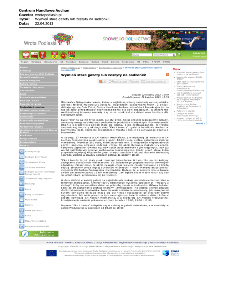Centrum Handlowe Auchan Gazeta: wrotapodlasia.pl Tytu³: Wymieñ stare gazety lub zeszyty na sadzonki! Data: 22.04.2013 MAPA SERWISU POMOC Poniedziałek, 22 kwietnia 2013 Imieniny: Kai, Leonii, Ł ukasza Wrota Podlasia Szukaj Region Strategia Gospodarka Region SI Rolnictwo Edukacja Kultura Sport Zdrowie Środowisko UE POKL RPOWP Pod patronatem Wrót Podlasia Zarząd Województwa Wymień stare gazety lub zeszyty na sadzonki! Wiosna w regionie RSS P o l eć artykuł Drukuj Kontakt z redakcją Kultura i sztuka Turystyka i rekreacja A to ciekawe... Sport Dodana: 22 kwietnia 2013, 10:49 Zmodyfikowana: 22 kwietnia 2013, 10:55 Promocja województwa Edukacja i nauka Gospodarka i praca Środowisko i rolnictwo Zdrowie i pomoc społeczna Konferencje i szkolenia Mieszkańcy Białegostoku i okolic, którzy w najbliżs zą sobotę i niedzielę wezmą udział w wielkiej zbiórce makulatury zostaną n a g r o d z e n i s a d z o n k a m i r ośl i n . Z o k a z j i zbliżającego się Dnia Ziemi, Centra Handlowe Auchan Hetmańska i Produkcyjna już po r a z k o l e j n y p r z y g o t o w ały e k o n i e s p o d z i a n k i d l a o d w i e d z a jąc y c h . W p r o g r a m i e weekendowej imprezy znalazły s ię m . i n . s p e k t a k l d l a d z i e c i o r a z k o n k u r s d l a okolicznych szkół. Komunikaty Organizacje pozarządowe Fundusze europejskie Wydarzenia religijne Współpraca zagraniczna i Biuro w Brukseli Załóż konto PROW Wrota Podlasia pl > W i a d o m ości > Środowisko i rolnictwo > Wymień stare gazety lub zeszyty na sadzonki! Samorząd Logowanie 6 Bycie "eko" to już nie tylko moda, ale styl życia. Coraz czę ściej segregujemy odpady, zwracamy uwagę na skład oraz pochodzenie produktów spożywczych i kosmetycznych. D b a n i e o środowisko powoli staje się normą, a nie ekstrawagancją. W trakcie dwudniowej imprezy ekologicznej "Eko i trendy", galerie handlowe Auchan w Białymstoku będą zachęcać mieszkańców miasta i okolic do aktywnego dbania o środowisko. Strony Wymień stare gazety lub zeszyty na sadzonki! Uczniowie uczczą Świę to Brzozy Stan rzek w województwie podlaskim Dwie ekologiczne inwestycje w Elektrociepłowni Białystok Jak bezpłatnie usunąć azbest - seminarium Województwo Podlaskie na Targach Prodexpo 2013 w Kijowie Konferencja Dobre Praktyki w Gospodarce Odpadami Pytania o odpady Uwaga na szlaki migracyjne zwierząt Projekt "Super RDOŚ 2" tylko do końca kwietnia Kraj i świat Uwaga konkurs Fotoreportaże Historia Cyfrowy Urzą d Centrum Certyfikacji Turystyczne Wrota TV Wrota Podlasia Podlaski System Informacji Przestrzennej Transmisje sesji Sejmiku Przetargi Praca Kursy i szkolenia Multimedia Galerie W sobotę, 27 kwietnia w CH Auchan Hetmańska, a w niedzielę 28 kwietnia w CH Auchan Produkcyjna punktualnie o godz. 10.00 rusza wielka, całodniowa zbiórka makulatury. Pierwsze 200 osób, które przyniesie min. 5 kilogramów niepotrzebnych gazet i papieru, otrzyma sadzonki roślin. Do akcji zbierania makulatury centra handlowe zaprosiły również uczniów szkół podstawowych i gimnazjalnych, aby już wśród najmłodszych szerzyć zachowania proekologiczne. Każdy uczeń klasy, która przyniesie najwięcej kilogramów gazet, starych zeszytów i tektury, dostanie atrakcyjną nagrodę. Zbiórka w obydwu galeriach potrwa do godziny 18.00. "Eko i trendy to już stały punkt naszego kalendarza. W tym roku po raz kolejny zachęcamy okolicznych mieszkańc ó w d o świadomego gospodarowania domowymi odpadami. Cieszy mnie, że akcja zyskuje coraz większe zainteresowanie i z każdą edycją zbieramy coraz więcej surowców wtórnych" - mówi Marlena Brzostowska, menedżer CH Auchan Produkcyjna i Hetmańska. Dodaje, że w zeszłym roku w trakcie dwóch dni zebrano ponad 12 ton makulatury. Jaki będzie bilans w tym roku i czy uda się pobić rekord, przekonamy się już wkrótce. W dniu zbiórki w każdej galerii na najmłodszych czekają przedstawienia teatralne o tematyce ekologicznej. Aktorzy teatru dziecięcego wystawią spektakl pt. "Wagary z ekologii", który ma uwrażliwić dzieci na potrzebę dbania o środowisko. Główny bohater bajki za złe zachowanie zostaje ukarany i zmniejszony. Na własnej skórze odczuje skutki zaśmiecania środowiska. Pozornie małe i nieistotne przedmioty, jak nakrętka od butelki czy guma do żucia okaż ą się dla niego i otaczającej go przyrody dużym zagrożeniem. Jak sobie poradzi w tym nieprzyjaznym świecie zobaczą dzieci, które w sobotę odwiedzą CH Auchan Hetmańs k a , a w n i e d z i e lę CH Auchan Produkcyjna. Przedstawienie zostanie pokazane w trzech turach o 13.00, 15.00 i 17.00. Impreza "Eko i trendy" odbędzie się w sobotę w galerii Hetmańska, a w niedzielę w galerii Produkcyjna w godzinach od 10.00 do 18.00. Nasze patronaty Kartki Mapa Województwa Archiwum Wiadomości Wrota Podlasia | Pomoc | Redakcja portalu | Urząd Marszałkowski Województwa Podlaskiego | Podlaski Urząd Wojewódzki Copyright 2003-2011 Urząd Marszałkowski Województwa Podlaskiego. Wszystkie prawa zastrzeżon e . Rozbudowę portalu internetowego Wrota Podlasia zrealizowano w ramach Projektu Nr Z/2.20/I/1.5/9/05 "Wdrażanie elektronicznych usług dla ludnoś ci w województwie podlaskim" współfinansowanego przez Unię Europejską z Europejskiego Funduszu Rozwoju Regionalnego. więcej >