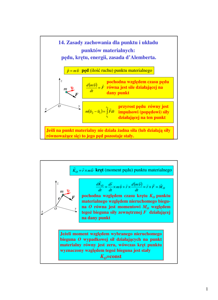14. Zasady zachowania dla punktu i układu punktów materialnych: pędu, krętu, energii, zasada d’Alemberta. r r p = mυ pęd (ilość ruchu) punktu materialnego z pochodna względem czasu pędu r d (mυ ) r = F równa jest sile działającej na dt m υ dany punkt F y O x t2 r v v m(υ 2 − υ1 ) = ∫ Fdt t1 przyrost pędu równy jest impulsowi (popędowi) siły działającej na ten punkt Jeśli na punkt materialny nie działa żadna siła (lub działają siły równoważące się) to jego pęd pozostaje stały. r r r KO = r × mυ kręt (moment pędu) punktu materialnego r r r r r d (mυ ) r r r dK O dr = × mυ + r × = r × F = MO dt dt dt z m υ r x O F y pochodna względem czasu krętu KO punktu materialnego względem nieruchomego bieguna O równa jest momentowi MO względem tegoż bieguna siły zewnętrznej F działającej na dany punkt Jeżeli moment względem wybranego nieruchomego bieguna O wypadkowej sił działających na punkt materialny równy jest zeru, wówczas kręt punktu wyznaczony względem tegoż bieguna jest stały KO=const 1 Ek = mυ 2 2 energia kinetyczna Przyrost energii kinetycznej punktu materialnego w skończonym przedziale czasu równy jest sumie prac, które wykonały w tym samym czasie wszystkie siły działające na ten punkt ∆Ek = Ek(2 ) − Ek(1) = W1, 2 W zachowawczym (potencjalnym) polu sił praca sił pola równa jest różnicy energii potencjalnych W1, 2 = E (p1) − E (p2 ) Gdy punkt materialny porusza się w (1) (1) (2 ) (2 ) zachowawczym polu sił, suma jego Ek + E p = Ek + E p energii kinetycznej i potencjalnej, E m(1) = Em(2 ) zwana energią mechaniczną, jest stała. Jeśli na punkt działają siły niezachowawcze (niepotencjalne) to przyrost energii mechanicznej punktu równy jest pracy tych sił Em(2 ) − Em(1) = W 2 Układ punktów materialnych r n r p = ∑ miυ i pęd układu punktów materialnych z υi mi Fi x i =1 m1 υ1 F1 y O mn υn pochodna względem czasu pędu r układu punktów materialnych dp n r = ∑ Fi równa jest sumie wszystkich sił dt i =1 zewnętrznych działających na punkty tego układu Fn ZASADA ZACHOWANIA PĘDU Jeśli na układ punktów materialnych nie działają siły zewnętrzne, to pęd układu pozostaje stały. n r r r K O = ∑ ri × miυ i kręt układu punktów materialnych i =1 z υi mi Fi x m1 ri r1 O υ1 rn m n υn Fn F1 y pochodna względem czasu krętu układu punktów materialnych względem r dK O n r r dowolnego nieruchomego = ∑ ri × Fi dt bieguna równa jest sumie i =1 momentów wszystkich sił zewnętrznych względem tegoż bieguna ZASADA ZACHOWANIA KRĘTU Jeżeli momenty wszystkich sił zewnętrznych układu punktów materialnych względem nieruchomego bieguna są równe zeru, to kręt układu względem tego bieguna pozostaje stały. 3 Zadanie 1/14 Człowiek o masie m siedzi na wózku o masie M1 poruszającym się z prędkością υ1. W pewnej chwili przeskakuje na wózek o masie M2 poruszający się z prędkością υ2 odbijając się z prędkością υ względem pierwszego wózka. Obliczyć prędkości wózków po przeskoczeniu człowieka. Opory toczenia się wózków pominąć. m M1 υ1 Zadanie 2/14 Klocek o masie m ustawiono na równi nachylonej pod kątem α i pchnięto z wysokości h z prędkością υ0. Jaką odległość l przebędzie klocek po poziomym odcinku toru do chwili zatrzymania się, jeśli współczynnik tarcia o podłoże wynosi µ?. υ2 M2 m h α l Zadanie 3/14 W górę równi nachylonej pod kątem α pchnięto klocek z prędkością początkową υ0. Jaką drogę przebędzie on do chwili zatrzymania się i z jaką prędkością powróci do miejsca, z którego został wypchnięty, jeśli współczynnik tarcia o równię wynosi µ? Przeprowadzić dyskusję rozwiązania. m Zadanie 4/14 Klocek o masie m zsuwa się bez prędkości początkowej wzdłuż równi nachylonej pod kątem α przebywając drogę l do chwili uderzenia w sprężynę o sztywności k. Jaką drogę l1 przebędzie klocek po odbiciu się od sprężyny, jeśli współczynnik tarcia o równię wynosi µ? Masę sprężyny pominąć. Przeprowadzić dyskusję wyniku. α l l1 k 4 m Zadanie 5/14 Z wierzchołka gładkiej półkuli o promieniu r zsuwa się z pomijalnie małą prędkością początkową punkt materialny o masie m. Znaleźć kąt α0 określający położenie punktu, w którym oderwie się on od powierzchni półkuli. A α0 r Zadanie 6/14 A Ciężar o masie m może ślizgać się po pionowym pręcie AB, którego sztywność na rozciąganie równa jest k1.Koniec B pręta opiera się o śrubową sprężynę o sztywności k2. Obliczyć największe wydłużenie pręta h przy spadku ciężaru z wysokości H bez prędkości początkowej. Masę pręta i sprężyny pominąć. m k1 Zadanie 7/14 k2 Na końcu nie odkształconej nici o sztywności c, która może przenieść maksymalną siłę Q, zaczepiono ciężar o masie m i puszczono bez prędkości początkowej. Jaka jest minimalna wartość m, przy której nić zerwie się i jaka będzie prędkość ciężaru w chwili zerwania nici? Zadanie 8/14 Skoczek o masie m odbija się od ławki z prędkością υ0 i zjeżdża ze skoczni o wysokości h. Obliczyć reakcję podłoża na narty w punkcie A jeśli promień krzywizny toru w tym miejscu wynosi ρ. Tarcie i opór powietrza pominąć. H B υ0 h ρ A Zadanie 9/14 W celu pomiaru prędkości υ pocisku karabinowego o masie m oddano strzał w tzw. wahadło balistyczne, które odchyliło się od pionu o kąt α Obliczyć prędkość pocisku, jeśli wiadomo, że masa wahadła równa jest M, zaś jego długość wynosi l. α l υ m M 5 Zadanie 10/14 A Sprężynę o sztywności k i długości swobodnej l zamocowano w punkcie A i połączono z tuleją B mogącą ślizgać się bez tarcia po poziomej prowadnicy. Tuleję wychylono do punktu C i puszczono bez prędkości początkowej. Jaka będzie jej prędkość υD przy przejściu przez punkt D? Dany jest wymiar a oraz masa tulei równa m. k l B C m D a Zadanie 11/14 Z