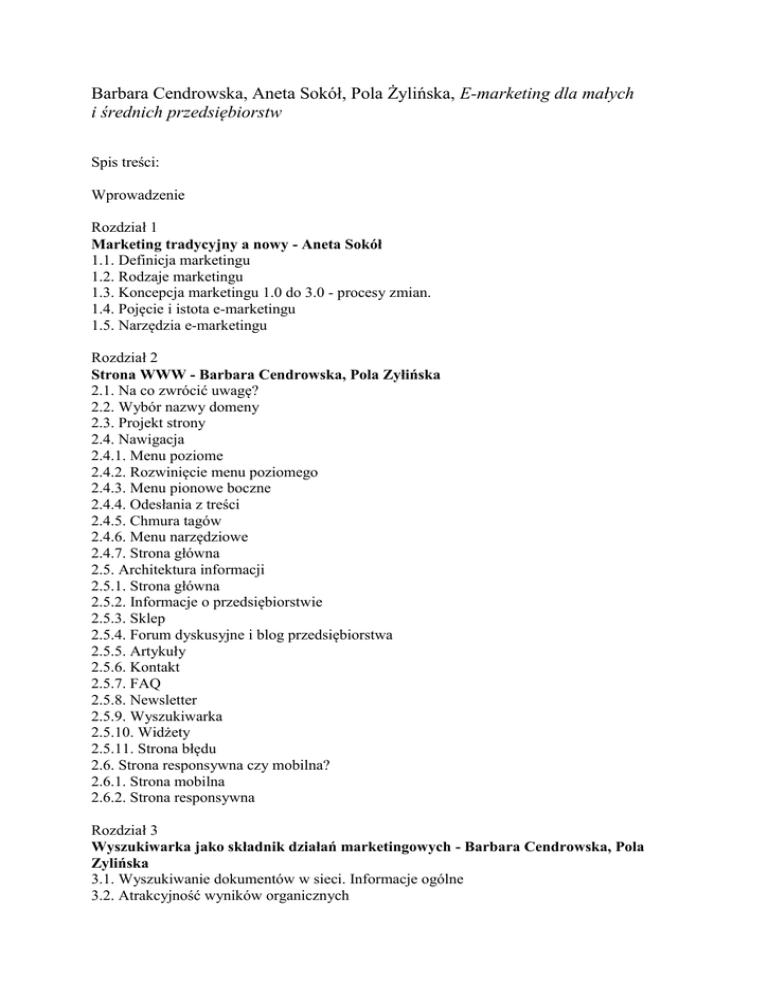 Barbara Cendrowska, Aneta Sokół, Pola Żylińska, E-marketing dla małych i średnich przedsiębiorstw Spis treści: Wprowadzenie Rozdział 1 Marketing tradycyjny a nowy - Aneta Sokół 1.1. Definicja marketingu 1.2. Rodzaje marketingu 1.3. Koncepcja marketingu 1.0 do 3.0 - procesy zmian. 1.4. Pojęcie i istota e-marketingu 1.5. Narzędzia e-marketingu Rozdział 2 Strona WWW - Barbara Cendrowska, Pola Zyłińska 2.1. Na co zwrócić uwagę? 2.2. Wybór nazwy domeny 2.3. Projekt strony 2.4. Nawigacja 2.4.1. Menu poziome 2.4.2. Rozwinięcie menu poziomego 2.4.3. Menu pionowe boczne 2.4.4. Odesłania z treści 2.4.5. Chmura tagów 2.4.6. Menu narzędziowe 2.4.7. Strona główna 2.5. Architektura informacji 2.5.1. Strona główna 2.5.2. Informacje o przedsiębiorstwie 2.5.3. Sklep 2.5.4. Forum dyskusyjne i blog przedsiębiorstwa 2.5.5. Artykuły 2.5.6. Kontakt 2.5.7. FAQ 2.5.8. Newsletter 2.5.9. Wyszukiwarka 2.5.10. Widżety 2.5.11. Strona błędu 2.6. Strona responsywna czy mobilna? 2.6.1. Strona mobilna 2.6.2. Strona responsywna Rozdział 3 Wyszukiwarka jako składnik działań marketingowych - Barbara Cendrowska, Pola Zylińska 3.1. Wyszukiwanie dokumentów w sieci. Informacje ogólne 3.2. Atrakcyjność wyników organicznych 3.3. Budowa wyszukiwarki 3.3.1. Robot indeksujący 3.3.2. Indeksowanie 3.3.3. Analizator zapytań 3.3.4. Wyniki wyszukiwania stron (SERP) 3.4. PageRank 3.5. TrustRank 3.5.1. TrustRank w praktyce 3.6. Google Hummingbird Rozdział 4 Optymalizacja witryny internetowej pod kątem wyszukiwarek - Barbara Cendrowska, Pola Zylińska 4.1. Tytuł strony 4.2. Adres URL 4.3. Dobór słów kluczowych 4.3.1. Planowanie słów kluczowych w AdWords 4.3.2. Podglądaj konkurencję 4.3.3. Alexa jako serwis informacji o konkurencji 4.3.4. Google Trends 4.3.5. RankTracker 4.3.6. Wskaźnik efektywności słów kluczowych KEI 4.4. Odnośniki 4.4.1. Klasyfikacja linków pozycjonujących 4.4.2. Atrybuty odnośników 4.4.3. Sztuka zdobywania linków 4.4.4. Tworzenie wartościowych linków w praktyce. Rozdział 5 Marketing w serwisach społecznościowych - - Barbara Cendrowska, Pola Żyłińska 5.1. Social Media Marketingu 5.2. Facebook 5.3. Jak założyć fanpage? 5.4. Blog 5.4.1. Pomysł na treść błoga 5.4.2. Wybór platformy błoga 5.4.2.1. WordPress.com 5.4.2.2. Blogger.com 5.5. Google + 5.5.1. Od czego zacząć? 5.5.2. Kręgi odbiorców 5.5.3. Rozmowy wideo 5.5.4. Skype - konkurencja dla Hangouts Spis rysunków Spis tabel Bibliografia