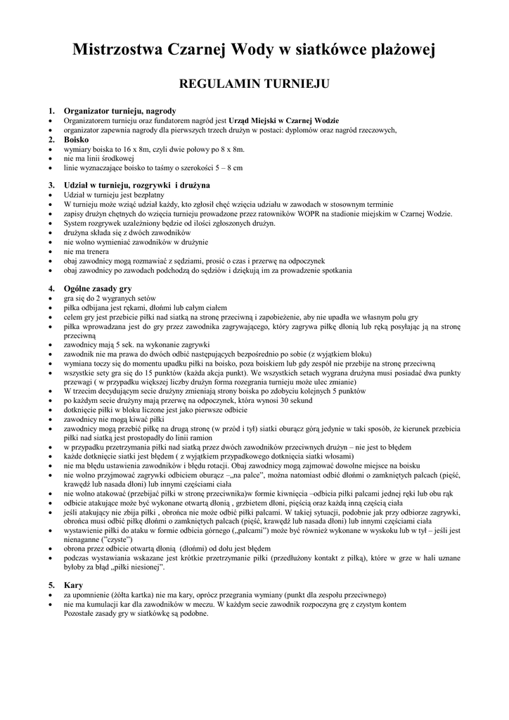 Mistrzostwa Czarnej Wody w siatkówce plażowej REGULAMIN TURNIEJU 1. Organizator turnieju, nagrody Organizatorem turnieju oraz fundatorem nagród jest Urząd Miejski w Czarnej Wodzie organizator zapewnia nagrody dla pierwszych trzech drużyn w postaci: dyplomów oraz nagród rzeczowych, 2. Boisko wymiary boiska to 16 x 8m, czyli dwie połowy po 8 x 8m. nie ma linii środkowej linie wyznaczające boisko to taśmy o szerokości 5 – 8 cm 3. Udział w turnieju, rozgrywki i drużyna Udział w turnieju jest bezpłatny W turnieju może wziąć udział każdy, kto zgłosił chęć wzięcia udziału w zawodach w stosownym terminie zapisy drużyn chętnych do wzięcia turnieju prowadzone przez ratowników WOPR na stadionie miejskim w Czarnej Wodzie. System rozgrywek uzależniony będzie od ilości zgłoszonych drużyn. drużyna składa się z dwóch zawodników nie wolno wymieniać zawodników w drużynie nie ma trenera obaj zawodnicy mogą rozmawiać z sędziami, prosić o czas i przerwę na odpoczynek obaj zawodnicy po zawodach podchodzą do sędziów i dziękują im za prowadzenie spotkania 4. Ogólne zasady gry gra się do 2 wygranych setów piłka odbijana jest rękami, dłońmi lub całym ciałem celem gry jest przebicie piłki nad siatką na stronę przeciwną i zapobieżenie, aby nie upadła we własnym polu gry piłka wprowadzana jest do gry przez zawodnika zagrywającego, który zagrywa piłkę dłonią lub ręką posyłając ją na stronę przeciwną zawodnicy mają 5 sek. na wykonanie zagrywki zawodnik nie ma prawa do dwóch odbić następujących bezpośrednio po sobie (z wyjątkiem bloku) wymiana toczy się do momentu upadku piłki na boisko, poza boiskiem lub gdy zespół nie przebije na stronę przeciwną wszystkie sety gra się do 15 punktów (każda akcja punkt). We wszystkich setach wygrana drużyna musi posiadać dwa punkty przewagi ( w przypadku większej liczby drużyn forma rozegrania turnieju może ulec zmianie) W trzecim decydującym secie drużyny zmieniają strony boiska po zdobyciu kolejnych 5 punktów po każdym secie drużyny mają przerwę na odpoczynek, która wynosi 30 sekund dotknięcie piłki w bloku liczone jest jako pierwsze odbicie zawodnicy nie mogą kiwać piłki zawodnicy mogą przebić piłkę na drugą stronę (w przód i tył) siatki oburącz górą jedynie w taki sposób, że kierunek przebicia piłki nad siatką jest prostopadły do linii ramion w przypadku przetrzymania piłki nad siatką przez dwóch zawodników przeciwnych drużyn – nie jest to błędem każde dotknięcie siatki jest błędem ( z wyjątkiem przypadkowego dotknięcia siatki włosami) nie ma błędu ustawienia zawodników i błędu rotacji. Obaj zawodnicy mogą zajmować dowolne miejsce na boisku nie wolno przyjmować zagrywki odbiciem oburącz –„na palce”, można natomiast odbić dłońmi o zamkniętych palcach (pięść, krawędź lub nasada dłoni) lub innymi częściami ciała nie wolno atakować (przebijać piłki w stronę przeciwnika)w formie kiwnięcia –odbicia piłki palcami jednej ręki lub obu rąk odbicie atakujące może być wykonane otwartą dłonią , grzbietem dłoni, pięścią oraz każdą inną częścią ciała jeśli atakujący nie zbija piłki , obrońca nie może odbić piłki palcami. W takiej sytuacji, podobnie jak przy odbiorze zagrywki, obrońca musi odbić piłkę dłońmi o zamkniętych palcach (pięść, krawędź lub nasada dłoni) lub innymi częściami ciała wystawienie piłki do ataku w formie odbicia górnego („palcami”) może być również wykonane w wyskoku lub w tył – jeśli jest nienaganne (”czyste”) obrona przez odbicie otwartą dłonią (dłońmi) od dołu jest błędem podczas wystawiania wskazane jest krótkie przetrzymanie piłki (przedłużony kontakt z piłką), które w grze w hali uznane byłoby za błąd „piłki niesionej”. 5. Kary za upomnienie (żółta kartka) nie ma kary, oprócz przegrania wymiany (punkt dla zespołu przeciwnego) nie ma kumulacji kar dla zawodników w meczu. W każdym secie zawodnik rozpoczyna grę z czystym kontem Pozostałe zasady gry w siatkówkę są podobne.
