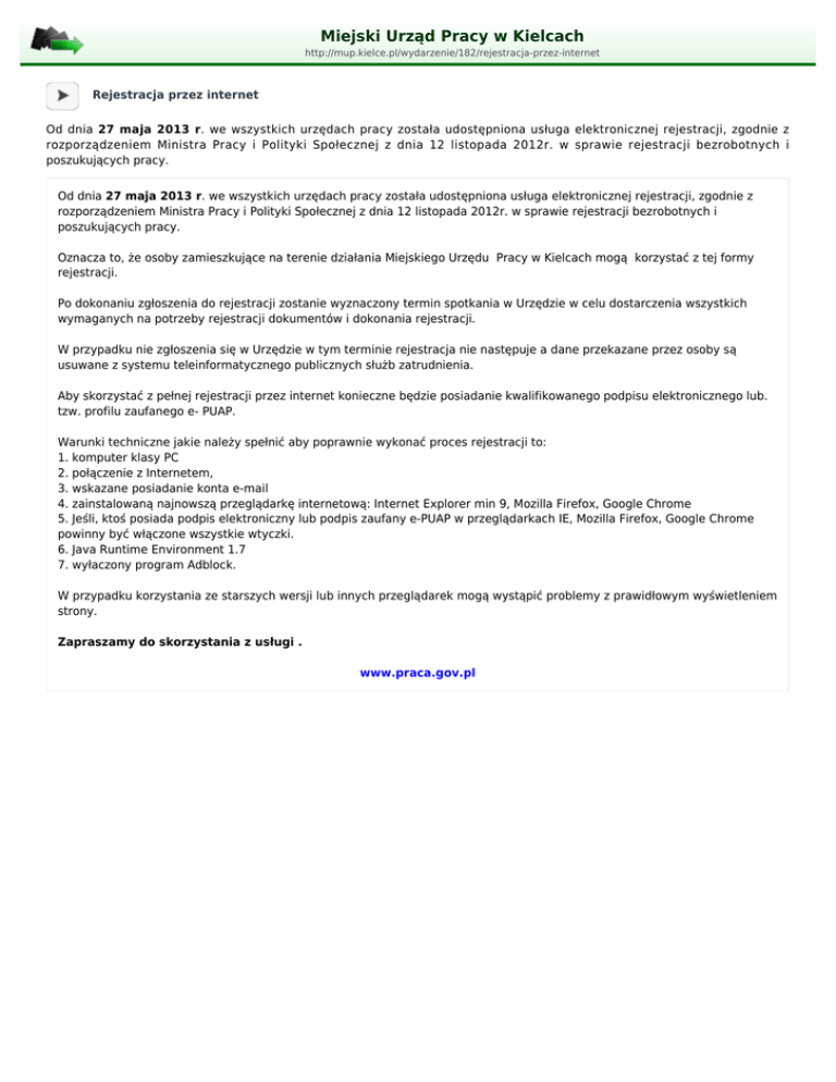 Miejski Urząd Pracy w Kielcach http://mup.kielce.pl/wydarzenie/182/rejestracja-przez-internet Rejestracja przez internet Od dnia 27 maja 2013 r. we wszystkich urzędach pracy została udostępniona usługa elektronicznej rejestracji, zgodnie z rozporządzeniem Ministra Pracy i Polityki Społecznej z dnia 12 listopada 2012r. w sprawie rejestracji bezrobotnych i poszukujących pracy. Od dnia 27 maja 2013 r. we wszystkich urzędach pracy została udostępniona usługa elektronicznej rejestracji, zgodnie z rozporządzeniem Ministra Pracy i Polityki Społecznej z dnia 12 listopada 2012r. w sprawie rejestracji bezrobotnych i poszukujących pracy. Oznacza to, że osoby zamieszkujące na terenie działania Miejskiego Urzędu Pracy w Kielcach mogą korzystać z tej formy rejestracji. Po dokonaniu zgłoszenia do rejestracji zostanie wyznaczony termin spotkania w Urzędzie w celu dostarczenia wszystkich wymaganych na potrzeby rejestracji dokumentów i dokonania rejestracji. W przypadku nie zgłoszenia się w Urzędzie w tym terminie rejestracja nie następuje a dane przekazane przez osoby są usuwane z systemu teleinformatycznego publicznych służb zatrudnienia. Aby skorzystać z pełnej rejestracji przez internet konieczne będzie posiadanie kwalifikowanego podpisu elektronicznego lub. tzw. profilu zaufanego e- PUAP. Warunki techniczne jakie należy spełnić aby poprawnie wykonać proces rejestracji to: 1. komputer klasy PC 2. połączenie z Internetem, 3. wskazane posiadanie konta e-mail 4. zainstalowaną najnowszą przeglądarkę internetową: Internet Explorer min 9, Mozilla Firefox, Google Chrome 5. Jeśli, ktoś posiada podpis elektroniczny lub podpis zaufany e-PUAP w przeglądarkach IE, Mozilla Firefox, Google Chrome powinny być włączone wszystkie wtyczki. 6. Java Runtime Environment 1.7 7. wyłaczony program Adblock. W przypadku korzystania ze starszych wersji lub innych przeglądarek mogą wystąpić problemy z prawidłowym wyświetleniem strony. Zapraszamy do skorzystania z usługi . www.praca.gov.pl
