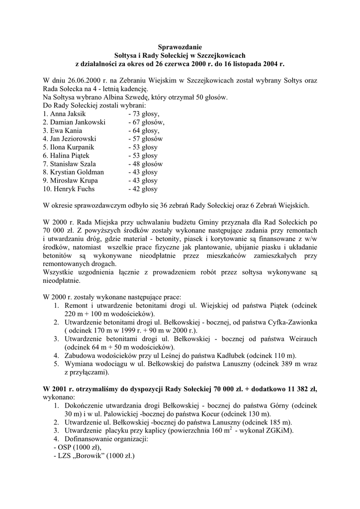 Sprawozdanie Sołtysa i Rady Sołeckiej w Szczejkowicach z działalności za okres od 26 czerwca 2000 r. do 16 listopada 2004 r. W dniu 26.06.2000 r. na Zebraniu Wiejskim w Szczejkowicach został wybrany Sołtys oraz Rada Sołecka na 4 - letnią kadencję. Na Sołtysa wybrano Albina Szwedę, który otrzymał 50 głosów. Do Rady Sołeckiej zostali wybrani: 1. Anna Jaksik - 73 głosy, 2. Damian Jankowski - 67 głosów, 3. Ewa Kania - 64 głosy, 4. Jan Jeziorowski - 57 głosów 5. Ilona Kurpanik - 53 głosy 6. Halina Piątek - 53 głosy 7. Stanisław Szala - 48 głosów 8. Krystian Goldman - 43 głosy 9. Mirosław Krupa - 43 głosy 10. Henryk Fuchs - 42 głosy W okresie sprawozdawczym odbyło się 36 zebrań Rady Sołeckiej oraz 6 Zebrań Wiejskich. W 2000 r. Rada Miejska przy uchwalaniu budŜetu Gminy przyznała dla Rad Sołeckich po 70 000 zł. Z powyŜszych środków zostały wykonane następujące zadania przy remontach i utwardzaniu dróg, gdzie materiał - betonity, piasek i korytowanie są finansowane z w/w środków, natomiast wszelkie prace fizyczne jak plantowanie, ubijanie piasku i układanie betonitów są wykonywane nieodpłatnie przez mieszkańców zamieszkałych przy remontowanych drogach. Wszystkie uzgodnienia łącznie z prowadzeniem robót przez sołtysa wykonywane są nieodpłatnie. W 2000 r. zostały wykonane następujące prace: 1. Remont i utwardzenie betonitami drogi ul. Wiejskiej od państwa Piątek (odcinek 220 m + 100 m wodościeków). 2. Utwardzenie betonitami drogi ul. Bełkowskiej - bocznej, od państwa Cyfka-Zawionka ( odcinek 170 m w 1999 r. + 90 m w 2000 r.). 3. Utwardzenie betonitami drogi ul. Bełkowskiej - bocznej od państwa Weirauch (odcinek 64 m + 50 m wodościeków). 4. Zabudowa wodościeków przy ul Leśnej do państwa Kadłubek (odcinek 110 m). 5. Wymiana wodociągu w ul. Bełkowskiej do państwa Lanuszny (odcinek 389 m wraz z przyłączami). W 2001 r. otrzymaliśmy do dyspozycji Rady Sołeckiej 70 000 zł. + dodatkowo 11 382 zł, wykonano: 1. Dokończenie utwardzania drogi Bełkowskiej - bocznej do państwa Górny (odcinek 30 m) i w ul. Palowickiej -bocznej do państwa Kocur (odcinek 130 m). 2. Utwardzenie ul. Bełkowskiej -bocznej do państwa Lanuszny (odcinek 185 m). 3. Utwardzenie placyku przy kaplicy (powierzchnia 160 m2 - wykonał ZGKiM). 4. Dofinansowanie organizacji: - OSP (1000 zł), - LZS „Borowik” (1000 zł.) 5. Parking przy cmentarzu komunalnym. Teren ponad 1000 m2 podarował pan Joachim Wodok, za co jemu i jego rodzinie w imieniu mieszkańców serdecznie dziękuję. Na podział geodezyjny ze środków Rady Sołeckiej wydaliśmy 1605 zł. Tłuczeń: czerwony łupek 6 samochodów po 27 ton = 162 tony wraz z transportem załatwił Burmistrz Gminy i Miasta Czerwionka-Leszczyny za co w imieniu mieszkańców wsi serdecznie dziękuję. Za wyrównanie tereniu i rozplantowanie tłucznia zapłaciłem 420 zł. z własnego dochodu. 6. Po usilnym staraniu w PWiK udało mi się załatwić wymianę wodociągu stalowego Ø 100 w ul. Rybnickiej (odcinek 310 m z przyłączami tj. odcinek od kaplicy do ul. Poprzecznej) za co składam podziękowanie panu prezesowi Kurdkowi i kierownikowi PWiK. 7. W sierpniu 2001 r. został wymieniony wodociąg w ul. Bełkowskiej ze środków RS (odcinek 525 m) od państwa Lupa do państwa Kisielewskich. 8. W listopadzie 2001 r. zostało wykonane oświetlenie ul. Rybnickiej obok państwa Furgoł do państwa Santarius - Cichecki (6 lamp). Ze środków RS wydaliśmy 3000 zł. dzięki pomocy pana Burmistrza Marka Kornasa, w dobrych układach z Energetyką. Energetyka dołoŜyła do tego oświetlenia 5000 zł. W dniu 12 czerwca 2001 r. odbył się przetarg na budowę sali gimnastycznej i oddziału przedszkolnego przy Szkole Podstawowej im. Wł. Broniewskiego w Szczejkowicach . Przetarg wygrała firma: Gliwickie Przedsiębiorstwo Budownictwa Węglowego S. A. Na kwotę 1.705.278 zł. Dokumentację wykonał „PRO-STYL” z Rybnika (koszt: 64 206 zł). Budowa została rozpoczęta w lipcu 2001 r. Prace na budowie przebiegały bez zastrzeŜeń do czasu kłopotów finansowych firmy, co doprowadziło do jej upadku. Jak mi wiadomo stróŜowie na budowie: Jan Tomanek, Mateusz Tomanek. Bronisław Pająk do tej pory nie otrzymali wynagrodzenia. W dniu 8 maja 2002 r. odbył się II przetarg na dokończenie budowy sali gimnastycznej. Przetarg wygrała firma F-BUD pana Eugeniusza Fibica z Wodzisławia na kwotę 1.013.730 zł. Roboty prowadzone były terminowo i zostały zakończone na początku grudnia 2002 r. Tu chciałbym przypomnieć trochę historii. Na zebraniu wiejskim w dniu 26 czerwca 2000 r. kiedy nie chciałem juŜ kandydować na sołtysa, Burmistrz pan Marek Kornas powiedział: „Nie chce pan kandydować - nie będzie sali gimnastycznej”. Być moŜe była to dyplomacja ze strony Burmistrza. Ja te wypowiedź potraktowałem powaŜnie. Nie mogłem wziąć takie odpowiedzialności na siebie - bo jakby tak się stało to mieszkańcy Szczejkowic, by mi nie wybaczyli. Cieszę się z tego, Ŝe tak się stało, Ŝe doczekaliśmy się nowego obiektu, wybudowanego z budŜetu gminy, Ŝe nasze dzieci mają o wiele lepsze warunki nauki. Budowa ta była oczkiem w głowie, bardzo często przebywałem na tej budowie, chciałem jak najwięcej uzyskać dla szkoły. Podkreślam - chodniki wokół szkoły, parkingi, drogi dojazdowe nie były objęte zakresem przetargu na budowę sali gimnastycznej, a są wykonane. To są efekty mojej pracy. Dzięki Ŝyczliwości pana Burmistrza, Naczelnika Wydziału Inwestycji pana Grzybka i pana Skarbnika, a szczególnie dzięki solidnemu wykonawcy zarazem właścicielowi firmy, który nie był skąpy, u którego udało się wyprosić dodatkowe sfinansowanie płyty betonowej oraz pokrycia blacha (130 m2) wiaty na boisku sportowym (koszt: 5567 zł.). Pozostał prace przy wiacie wykonali przyjaciele sportowców. Z tego miejsca wszystkim dziękuję. Koszt budowy sali i oddziału przedszkolnego (760 m2) wynosi 1.8