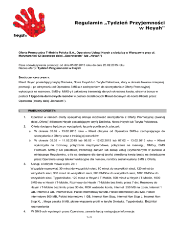 Regulamin „Tydzień Przyjemności w Heyah" Oferta Promocyjna T-Mobile Polska S.A., Operatora Usługi Heyah z siedzibą w Warszawie przy ul. Marynarskiej 12 (zwanego dalej „Operatorem” lub „Heyah”) Czas obowiązywania promocji: od dnia 05.02.2015 roku do dnia 20.02.2015 roku Nazwa oferty: Tydzień Przyjemności w Heyah SKRÓCONY OPIS OFERTY: Klient Heyah posiadający taryfę Dniówka, Nowa Heyah lub Taryfa Pakietowa, który w okresie trwania niniejszej promocji – po otrzymaniu od Operatora SMS-a z zachęceniem do skorzystania z Oferty Promocyjnej wykorzysta na rozmowy, SMS-y, MMS-y i pakietową transmisję danych określoną kwotę, otrzyma bonus w postaci 1 tygodnia darmowych rozmów w postaci dodatkowych Minut dodanych do konta Klienta przez Operatora (zwany dalej „Bonusem”). I. WARUNKI OFERTY: 1. Operator w ramach oferty specjalnej oferuje możliwość skorzystania z Oferty Promocyjnej (zwanej dalej „Ofertą”) Klientom Heyah posiadającym taryfę Dniówka, Nowa Heyah lub Taryfa Pakietowa. 2. Oferta dostępna będzie po wystąpieniu łącznie poniższych zdarzeń: a. W okresie 05.02 - 13.02.2015 roku – Klient otrzyma od Operatora SMS-a zachęcającego do skorzystania z Oferty wraz z treścią jej warunków b. W okresie 05.02 – 11.02.2015 lub 06.02 – 12.02.2015 lub 07.02 – 13.02.2015 roku – Klient wykorzysta na rozmowy, połączenia międzynarodowe, połączenia na roamingu, SMS-y, SMS Premium, MMS-y lub pakietową transmisję danych lub zakup usług (wymienionych w punkcie 3 niniejszego Regulaminu, o ile są dostępne dla danej taryfy) określoną kwotę brutto na świadczone przez Operatora usługi telekomunikacyjne dla numeru, na który został wysłany SMS z Ofertą 3. Usługi, o których mowa w pkt. 2b: : Wszędzie rozmawiaj, 30 minut do wszystkich sieci, 60 minut do wszystkich sieci, 120 minut do wszystkich sieci, 300 minut do wszystkich sieci, 500 SMSów do wszystkich sieci, 1000 SMSów do wszystkich sieci, Tygodniówka, 120 minut w Heyah i T-Mobile, 600 minut w Heyah i T-Mobile, 1000 SMS-ów w Heyah i T-Mobile, Rozmowy do Heyah i T-Mobile bez limitu przez 7 dni, Rozmowy do Heyah i T-Mobile bez limitu przez 30 dni, ROK ważności konta, Internet 250 MB na dzień, Internet 1 GB, Internet 3 GB, Internet 6GB, Pakiet Internetowy 50 MB, Pakiet Internetowy 250 MB, Pakiet Internetowy 500 MB, Pakiet Internetowy 1 GB, Internet Non Stop, Internet Non Stop L, Internet Non Stop XL , Mega paczka 5 MB, płatne włączenie profili w taryfie Dniówka, Tygodniówka, Bezmiar rozmawiania 4. W SMS-ach wysłanych przez Operatora, zawarte będą następujące informacje: 1z3 Warunki przyznania Bonusu i jego wartość Podziękowanie za skorzystanie z Oferty. Klient może otrzymać Bonus zgodnie z SMS-em od Operatora. W ramach niniejszej Oferty, Operator 5. przyznaje Bonus w postaci promocyjnych Minut. Skorzystanie z Oferty jest możliwe tylko dla numeru telefonu, na który został wysłany SMS od 6. Operatora. 7. W trakcie trwania Oferty jeden numer telefonu może zostać do niej zakwalifikowany tylko raz. 8. Dodanie Bonusu nastąpi w terminie do 10 dni od momentu spełnienia warunków Oferty, jednakże licząc nie wcześniej niż od dnia 12.02.2015 r. i zostanie potwierdzone SMS-em. W przypadku Klientów przebywających w roamingu czas aktywacji może zostać wydłużony do 14 dni. Warunki dotyczące Bonusu w postaci Minut, przyznawanego w ramach Oferty: 9. a. Minuty są możliwe do wykorzystania gdy konto jest aktywne na połączenia wychodzące. b. Dla taryfy Dniówka – minuty mogą być wykorzystane na krajowe połączenia głosowe na krajowe numery komórkowe Heyah i T-Mobile, z wyłączeniem połączeń wykonywanych na roamingu, połączeń międzynarodowych, połączeń wykonywanych na numery usługowe, specjalne, premium oraz połączeń przekierowanych. Minuty przyznane w ramach Oferty rozliczane są z dokładnością co do 1 sekundy. c. Dla taryf: Nowa Heyah oraz Taryfa Pakietowa minuty mogą być wykorzystane na krajowe połączenia głosowe na numery komórkowe Heyah i krajowe połączenia głosowe na numery stacjonarne, z wyłączeniem połączeń wykonywanych na roamingu, połączeń międzynarodowych, połączeń wykonywanych na numery usługowe, specjalne, premium oraz połączeń przekierowanych. Minuty przyznane w ramach Oferty rozliczane są z dokładnością co do 1 sekundy. d. Minuty są wykorzystywane przed zgromadzoną na koncie kwotą w złotych (PLN), o ile Użytkownik nie korzysta jednocześnie z minut dostępnych w ofercie "Przebieraj.Wybieraj". e. Minuty są możliwe do wykorzystania w ciągu 7 dni od daty dodania ich do konta. Po tym terminie przepadają, z zastrzeżeniem ppkt d oraz ppkt e. Jeżeli Klient z taryfą Dniówka posiada na koncie aktywne usługi: „120 minut w Heyah i T-Mobile” f. lub „600 minut w Heyah i T-Mobile” lub „Bezmiar rozmawiania” i otrzyma Bonus, wówczas liczba zgromadzonych minut na koncie Klienta sumuje się, a data ich ważności kończy się wraz z upływem Cyklu powyższej oferty. g. Jeżeli po przyznaniu Bonusu, a przed upłynięciem terminu jego ważności, Klient aktywuje dowolną z ofert wymienionych w ppkt f. wówczas niewykorzystane minuty z Bonusu ulegają automatycznemu usunięciu z konta Klienta. h. Jeżeli Klient posiadający taryfę Taryfa Pakietowa zakupi usługę „Pakiet Heyah i Stacjonarne” posiadając na koncie niewykorzystane minuty wynikające z Oferty, wówczas liczba zgromadzonych minut sumuje się, a data ich ważności jest liczona od ostatniego włączonego na koncie pakietu jednostek z terminem ważności. 10. Klient nie ma możliwości rezygnacji z otrzymanego Bonusu. 11. Skorzystanie z niniejszej Oferty przez Klienta oznacza akceptację przez Niego niniejszego Regulaminu. 2z3 II. REKLAMACJE: 1. Reklamacje dotyczące oferty Tydzień Przyjemności w Heyah należy zgłaszać drogą elektroniczną: [email protected] pisemnie na adres: T-Mobile Polska S.A. Biuro Obsługi Użytkow