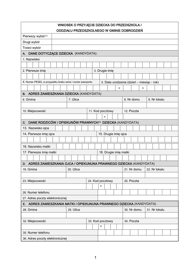WNIOSEK O PRZYJĘCIE DZIECKA DO PRZEDSZKOLA / ODDZIAŁU PRZEDSZKOLNEGO W GMINIE DOBRODZIEŃ Pierwszy wybór(1) Drugi wybór Trzeci wybór A. DANE DOTYCZĄCE DZIECKA (KANDYDATA): 1. Nazwisko 2. Pierwsze imię 3. Drugie imię 4. Numer PESEL w przypadku braku seria i numer paszportu 5. Data urodzenia (dzień – miesiąc - rok) B. - ADRES ZAMIESZKANIA DZIECKA (KANDYDATA) 6. Gmina 7. Ulica 10. Miejscowość 8. Nr domu 11. Kod pocztowy 9. Nr lokalu 12. Poczta C. DANE RODZICÓW / OPIEKUNÓW PRAWNYCH(4) DZIECKA (KANDYDATA) 13. Nazwisko ojca 14. Pierwsze imię ojca 15. Drugie imię ojca 16. Nazwisko matki 17. Pierwsze imię matki D. 18. Drugie imię matki ADRES ZAMIESZKANIA OJCA / OPIEKUNUNA PRAWNEGO DZIECKA (KANDYDATA) 19. Gmina 20. Ulica 23. Miejscowość 21. Nr domu 24. Kod pocztowy 22. Nr lokalu 25. Poczta 26. Numer telefonu 27. Adres poczty elektronicznej E. ADRES ZAMIESZKANIA MATKI / OPIEKUNUNA PRAWNEGO DZIECKA (KANDYDATA) 28. Gmina 32. Miejscowość 29. Ulica 30. Nr domu 33. Kod pocztowy 35. Numer telefonu 36. Adres poczty elektronicznej 1 34. Poczta 31. Nr lokalu F. ISTOTNE INFORMACJE O STANIE ZDROWIA , STOSOWANEJ DIECIE, ROZWOJU PSYCHOFIZYCZNYM DZIECKA (KANDYDATA) G. DEKLAROWANY CZAS POBYTU DZIECKA (KANDYDATA) W PRZEDSZKOLU / ODDZIALE Od godziny(2) H. do godziny DEKLAROWANE POSIŁKI DZIECKA (KANDYDATA) W PRZEDSZKOLU / ODDZIALE Śniadanie(3) Obiad Podwieczorek 37. Czytelny podpis ojca /opiekuna(4) 38. Czytelny podpis matki /opiekunki(4) 39. Miejscowość 40. Data złożenia wniosku I. ZAŁĄCZNIKI DO WNIOSKU W PIERWSZYM ETAP POSTĘPOWANIA REKRUTACYJNEGO WYPEŁNIA WNIOSKODAWCA 41. Kryteria ustawowe równoważne WYPEŁNIA KOMISJA REKRUTACYJNA Potwierdzenie spełnienia (3) kryterium a) wielodzietność rodziny kandydata. (rodzina wychowująca troje i więcej dzieci) b) niepełnosprawność kandydata. 42. Nazwa załącznika do wniosku, potwierdzającego spełnienie kryterium (za każde spełnienie kryterium przyznaje się 1 punkt) oświadczenie wnioskodawcy o wielodzietności rodziny dziecka orzeczenie o potrzebie kształcenia specjalnego wydane ze względu na niepełnosprawność (o ile takie wystawiono) orzeczenie o niepełnosprawności lub o stopniu niepełnosprawności c) niepełnosprawność obojga rodziców/ opiekunów prawnych kandydata. orzeczenie o niepełnosprawności lub o stopniu niepełnosprawności lub orzeczenie równoważne w rozumieniu przepisów ustawy z dnia 27.08.1997r. o rehabilitacji zawodowej i społecznej oraz zatrudnianiu osób niepełnosprawnych d) niepełnosprawność jednego z rodziców/ opiekunów prawnych kandydata. (Dz. U. z 2011 r. Nr 127, poz. 721, z późn. zm.) orzeczenie o potrzebie kształcenia specjalnego wydane ze względu na e) niepełnosprawność rodzeństwa kandydata. (o ile takie wystawiono) orzeczenie o niepełnosprawności lub o stopniu niepełnosprawności 2 Przyznane punkty prawomocny wyrok sądu rodzinnego orzekający rozwód lub separację lub f) samotne wychowywanie kandydata w rodzinie. (wychowywanie dziecka przez pannę, kawalera, wdowę, wdowca, osobę pozostającą w separacji orzeczonej prawomocnym wyrokiem sądu, osobę rozwiedzioną, chyba że osoba taka wychowuje wspólnie co najmniej jedno dziecko z jego rodzicem) akt zgonu oraz oświadczenie o samotnym wychowywaniu dziecka oraz oświadczenie o niewychowywaniu żadnego dziecka wspólnie z jego rodzicem dokument poświadczający objęcie dziecka pieczą zastępczą, zgodnie z ustawą z dnia 9 czerwca 2011 r. o wspieraniu rodziny i systemie pieczy zastępczej (Dz. U. z 2013 r. poz. 135, z 2012 r. g) objęcie kandydata pieczą zastępczą. poz.1519 oraz z 2013 r. poz. 154 i 866) 43.SUMA PUNKTÓW W PIERWSZYM ETAPIE POSTĘPOWANIA REKRUTACYJNEGO: ZAŁĄCZNIKI są składane w oryginale, notarialnie poświadczonej kopii albo w postaci urzędowo poświadczonego, zgodnie z art. 76a § 1 Kodeksu postępowania administracyjnego, odpisu lub wyciągu z dokumentu; mogą być składane także w postaci kopii poświadczanej za zgodność z oryginałem przez wnioskodawcę. Wzory oświadczeń - w załączeniu do „WNIOSKU". J. ZAŁĄCZNIKI DO WNIOSKU W DRUGIM ETAPIE POSTĘPOWANIA REKRUTACYJNEGO WYPEŁNIA WNIOSKODAWCA 44. Kryteria dodatkowe nierównoważne WYPEŁNIA KOMISJA REKRUTACYJNA Potwierdzenie spełnienia 45. Nazwa załącznika do wniosku, (3) potwierdzającego spełnienie kryterium kryterium Przyznane punkty oświadczenie rodziców/opiekunów prawnych a) dziecko 5 lub 6 letnie PUNKTACJA: 20 pkt oświadczenie rodziców/opiekunów b) dziecko obojga pracujących/ studiujących rodziców / opiekunów prawnych prawnych PUNKTACJA: 8 pkt oświadczenie rodziców/opiekunów prawnych c) dziecko z rodziny, w której pracuje tylko jedno z rodziców/opiekunów prawnych PUNKTACJA: 2pkt oświadczenie rodziców/opiekunów d) kontynuacja edukacji przedszkolnej w danym przedszkolu przez rodzeństwo kandydata ubiegającego się o przyjęcie do przedszkola e) dziecko 4-letnie (Dotyczy dzieci, które 1września roku, w którym składany jest wniosek, będą miały ukończone 4 lata; dziecko to w następnym roku szkolnym zostanie objęte obowiązkiem przedszkolnym.) prawnych PUNKTACJA: 6 pkt oświadczenie rodziców/opiekunów prawnych PUNKTACJA: 4 pkt 46. SUMA PUNKTÓW W DRUGIM ETAPIE POSTĘPOWANIA REKRUTACYJNEGO: UWAGA! Załączniki są składane przez rodziców/ opiekunów prawnych w formie oświadczeń. Każde oświadczenie zawiera klauzulę następującej treści: "Jestem świadomy odpowiedzialności karnej za złożenie fałszywego oświadczenia.". Wzory oświadczeń - w załączeniu do „WNIOSKU". 3 K. DECYZJA O ZAKWALIFIKOWANIU DZIECKA DO PRZEDSZKOLA / ODDZIAŁU PRZEDSZKOLNEGO 47. Data posiedzenia komisji rekrutacyjnej 48. Decyzja komisji o zakwalifikowaniu dziecka do przedszkola / oddziału przedszkolnego(4) zakwalifikowano nie zakwalifikowano 49. Uzasadnienie decyzji o niezakwalifikowaniu 50. Czytelne podpisy komisji rekrutacyjnej Przewodniczący komisji Członek komisji Członek komisji Członek komisji 