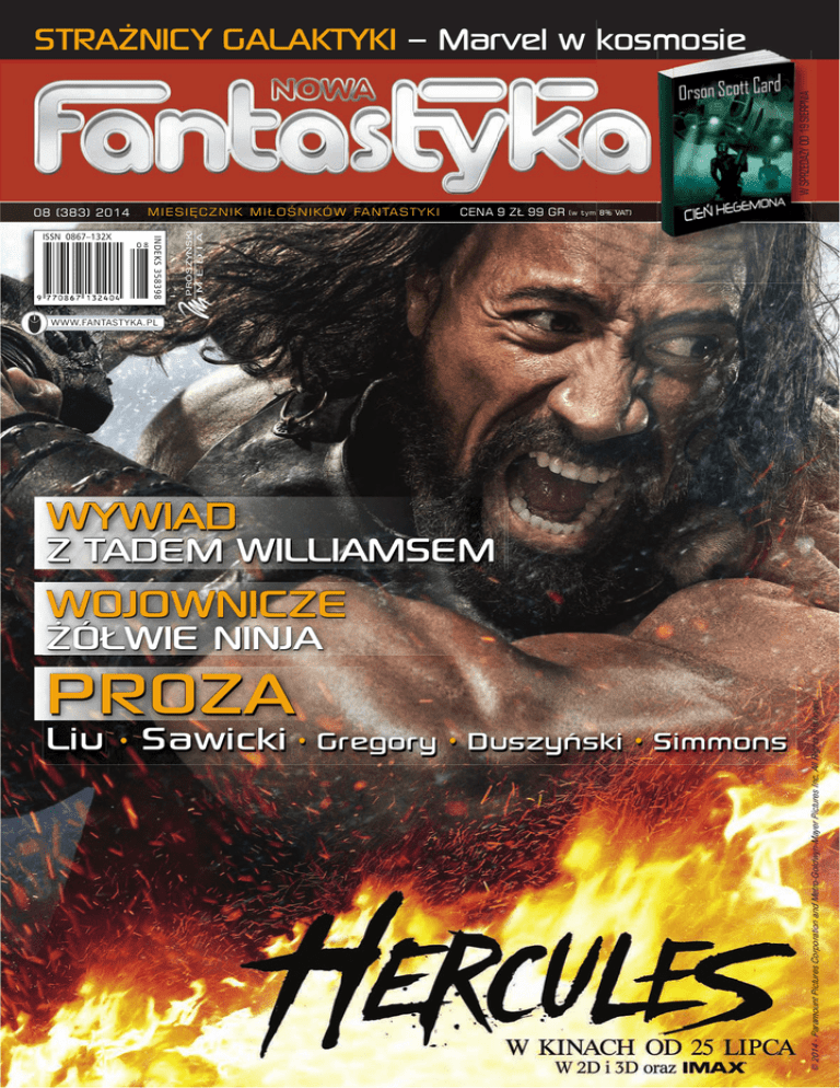 W sprzedaży od 19 sierpnia STRAŻNICY GALAKTYKI – Marvel w kosmosie CENA 9 ZŁ 99 GR (w tym 8% VAT) VA V AT) AT) M E D I A PRÓSZYŃSKI miesięcznik miŁośników fantastyki INDEKS 358398 ISSN 0867–132X P RÓS ZYŃSKI M E D I A 08 (383) 2014 WWW.FANTASTYKA.PL WYWIAD Z TADEM WILLIAMSEM WOJOWNICZE PROZA Liu Sawicki Gregory • • • Duszyński • Simmons © 2014 - Paramount Pictures Corporation and Metro-Goldwyn-Mayer Pictures Inc. All Rights Reserved. ŻÓŁWIE NINJA fot. J. Lubas 08/2014 06 07 00 04 Bohaterowie, którzy na Ziemi przekroczyli wszelkie granice, prędzej czy później trafiają w kosmos. Marvel również zwrócił wzrok ku gwiazdom, dając szansę wielkoekranowego debiutu jednej z mniej znanych serii. Niebawem na ekrany kin trafią „Wojownicze Żółwie Ninja”. Przekonajcie się, w jaki sposób undergroundowy hit o zielonych mutantach zamieszkujących podziemia Nowego Jorku stał się światowym fenomenem. 00 10 14 65 Dbam, aby moje książki miały magiczny pierwiastek, lecz pozostawały realistyczne – jak świat, w którym jest dobro i zło, ale nic nie jest proste. Na pewno znasz pojęcie hard SF, ja staram się tworzyć hard fantasy. Największy bohater świata starożytnego, który wyszedł zwycięsko z dziesiątków przygód i sięgnął po zasłużoną chwałę na Olimpie, wciąż nie został należycie potraktowany przez kulturę popularną. PUBLICYSTYKA 2 ZAPOWIEDZI 3 ZASTRZYK PRZYSZŁOŚCI Mateusz Wielgosz 4 MARVEL W KOSMOSIE Radosław Pisula 7 IMPERIUM ZMUTOWANYCH NINJA Paweł Deptuch 10 PISZĄC MAM W GŁOWIE MUZYKĘ Rozmowa z Tadem Williamsem 14 FANTASTYCZNY ŚWIAT: BRAZYLIA CZ. 2 Marek Grzywacz 63 CENZOR, TWÓJ BRAT CZ. 2 Maciej Parowski 65 HERKULESA BOJE Z POPKULTURĄ Jerzy Rzymowski 72 WEHIKUŁ CZASU NARZĘDZIEM SPRAWIEDLIWOŚCI Rafał Kosik 73 ATAK MATEMATYKI... Peter Watts 78 KU! Łukasz Orbitowski PROZA POLSKA 17 KSIĘŻNICZKA I ŚPIĄCY RYCERZE Andrzej W. Sawicki 30 KOLCZASTY Tomasz Duszyński Jerzy Rzymowski 39 ILUSTROWANA BIOGRAFIA LORDA GRIMMA Daryl Gregory 47 ODRODZENIE Ken Liu 56 RAJ NA PUSTYNI Adrian Simmons 67 KSIĄŻKI 74 Nową FILM 76 KOMIKS Polihistor. Omnibus. Człowiek renesansu. Według definicji – osoba posiadająca rozległą wiedzę z wielu różnych dziedzin. Coraz trudniej znaleźć takich ludzi. Nie wynika to jednak z degrengolady naszego gatunku. Dużo łatwiej było stać się „człowiekiem renesansu” podczas renesansu. Jednak od czasów Leonarda da Vinci minęło pięćset lat i zakres wiedzy naukowej stał się niewyobrażalnie większy. To, co dawniej byłoby rozległą wiedzą z danej dziedziny, teraz jest płycizną, a i nowych gałęzi nauki pojawiły się dziesiątki, jeśli nie setki. Powiedzenie, że jeśli coś jest do wszystkiego, to jest do niczego, staje się coraz prawdziwsze również w odniesieniu do ludzi. W ten oto sposób omnibusów wypierają specjaliści – już nawet nie w danej dziedzinie, jak nauki biologiczne, fizyczne czy ekonomiczne, ale w coraz węższych, uszczegółowionych dyscyplinach. Bezbłędnie poruszają się na swoim podwórku, ale płacą za to cenę oderwania się od innych, często istotnych życiowo zagadnień. Problem pojawia się, gdy próbują zdobyć wiedzę z takiego nieznanego im zakresu. O ile w naukach ścisłych da się to jeszcze w miarę bezpiecznie zrobić, o tyle w dziedzinach humanistycznych czy społecznych coraz trudniej o obiektywne źródła, a coraz łatwiej o materiały podszyte indoktrynacją. Coraz częściej też rozmaite badania prowadzi się pod przyjętą tezę, manipulując próbą i wynikami, aby uwiarygodnić taką czy inną ideologię. W ostatecznym rozrachunku, najcenniejszą umiejętnością współczesnego człowieka staje się zdolność sprawnego docierania do wiarygodnych źródeł i oddzielania informacyjnego ziarna od plew. Współczesny polihistor, zanim posiądzie nową wiedzę, w pierwszej kolejności musi nauczyć się odróżniać rzeczywistość od fikcji. Kto jak kto, ale fantaści powinni w tym przodować. Zapraszam do lektury! P.S. Miłośników cyklu „Science w fiction” Wawrzyńca Podrzuckiego uspokajam: kolejny odcinek już w październiku. PROZA ZAGRANICZNA RECENZJE ws óŁczesny POLIHISTOR w następnym numerze : Marcin Podlewski Dobranoc, Pimky Limky Polub Fanta st na Faceb o ykę oku! Peter Watts Olbrzymy FANTASTYKA WYDANIE SPECJALNE 4/2014 od 16 października komiks / film MARVEL W KOSMOSIE Radosław Pisula Co można zrobić z bohaterami, którzy na Ziemi przekroczyli wszelkie granice? Godzilla, Spider-Man, Pan Kleks, James Bond, Jason Voorhees, a nawet Leprechaun z popularnej serii slasherów – wszyscy prędzej czy później zostali wysłani w kosmos. Marvel Studios również zwróciło wzrok w stronę gwiazd, dając szansę wielkoekranowego debiutu jednej ze swoich mniej znanych serii. ZDARZyŁO SIę JUTRO K omiksowa przygoda Strażników Galaktyki zaczyna się dosyć przypadkowo. W 1969 roku Arnold Drake i Gene Colan zaprezentowali w 18 numerze antologii „Marvel Super-Heroes” świat Marvela w XXXI wieku. Przyszłość naznaczona została wielką ekspansją Ziemian na wszystkie planety Układu Słonecznego (a nawet dalej), gdzie powstawały kolonie zamieszkane przez genetycznie zmodyfikowanych ludzi, przystosowanych do warunków panujących na poszczególnych obiektach astronomicznych. 4 Pierwsza grupa, która przyjęła miano Strażników Galaktyki, musiała stawić czoło jaszczurowatym najeźdźcom zwanym Bractwem Badoon. W jej skład wchodzili: Charlie-27 (stróż prawa z Jowisza o ciele jedenastokrotnie twardszym niż u przeciętnego człowieka), krystaliczny Martinex (ostatni mieszkaniec Plutona, emitujący z rąk fale ekstremalnego gorąca i zimna), Yondu Udonta (niebieskoskóry „szlachetny dzikus” z Centauri IV) oraz Vance Astro, zwany później Majorem Victory (telekinetyk, kosmiczna wariacja na temat Kapitana Ameryki). Ten przypadkowy zbiór bohaterów z różnych planet, połączonych wspólnym