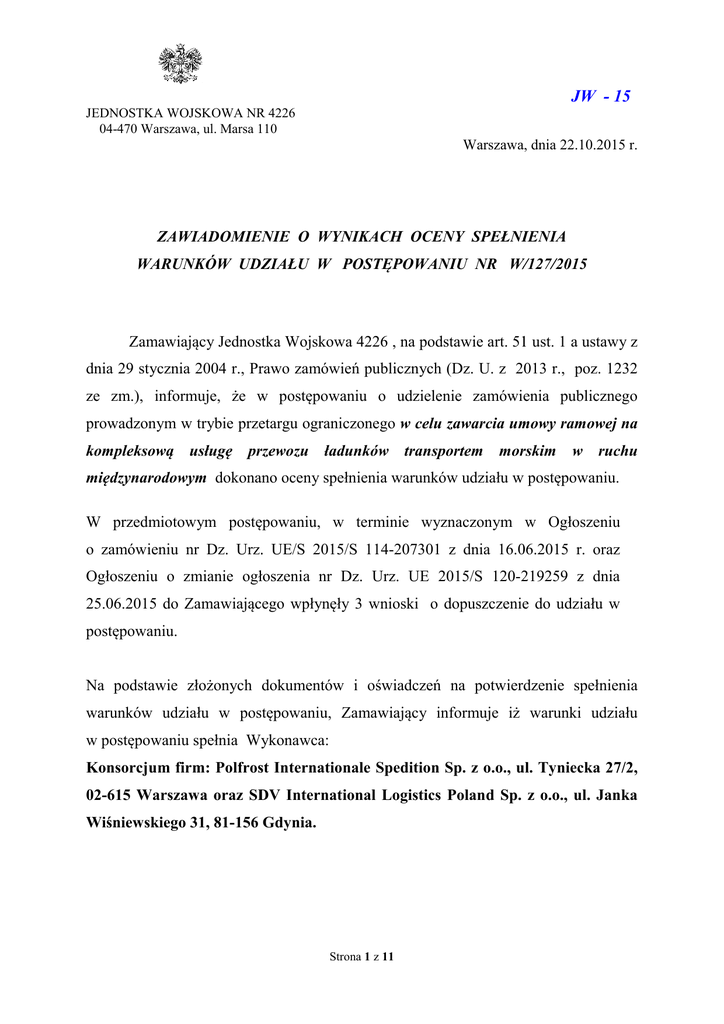 JW - 15 JEDNOSTKA WOJSKOWA NR 4226 04-470 470 Warszawa, ul. Marsa 110 Warszawa, dnia 22.10.2015 r. ZAWIADOMIENIE O WYNIKACH OCENY SPEŁNIENIA WARUNKÓW UDZIAŁU UDZIAŁ W POSTĘPOWANIU NR W/127/2015 Zamawiający cy Jednostka Wojskowa 4226 , na podstawie art. 511 ust. 1 a ustawy z dnia 29 stycznia 2004 r., Prawo zamówień zamówie publicznych (Dz. U. z 2013 rr., poz. 1232 ze zm.), informuje, że w post postępowaniu o udzielenie zamówienia amówienia publicznego p prowadzonym w trybie przetargu ograniczonego w celu zawarcia umowy ramowej na kompleksową usługę przewozu ładunków transportem morskim w ruchu międzynarodowym dokonano oceny spełnienia warunków udziału w postępowaniu. post W przedmiotowym postępowaniu, powaniu, w terminie wyznaczonym w Ogłoszeniu o zamówieniu nr Dz. Urz. UE/S 2015/S 114-207301 z dnia 16.0 .06.2015 r. oraz Ogłoszeniu o zmianie ogłoszenia nr Dz. Urz. UE 2015/S 201 120-219259 219259 z dnia 25.06.2015 do Zamawiającego ącego wpłyn wpłynęły 3 wnioski o dopuszczenie do udziału w postępowaniu. Na podstawie złożonych żonych dokumentów i oświadczeń o na potwierdzenie spełnienia warunków udziału w postępowaniu, postę Zamawiający informuje iż warunki udziału w postępowaniu spełnia Wykonawca: Konsorcjum firm: Polfrost olfrost Internationale Spedition Sp. z o.o., ul. Tyniecka 27/2, 02-615 615 Warszawa oraz SDV International Logistics Poland Sp. z o.o., ul. Janka Wiśniewskiego 31, 81-156 156 Gdynia. Gdynia Strona 1 z 11 Zamawiający wyklucza z postępowania następujących Wykonawców: 1) Konsorcjum firm: DSV Air&Sea A/S Hovedgaden 630, DK-2640 Hedehusene oraz TERRAMAR Sp. z o.o. Spedycja Międzynarodowa, ul. Rotterdamska 3, 81337 Gdynia. Uzasadnienie faktyczne: 1. Zamawiający wymagał załączenia do wniosku Pełnomocnictwa (oryginału dokumentu) do podpisania wniosku oraz innych dokumentów wraz z nim składanych, jeżeli prawo do reprezentowania Wykonawcy nie wynika z dokumentów złożonych wraz z wnioskiem. Wykonawca do wniosku załączył pełnomocnictwa dla panów Grzegorza Samoć oraz Larsa Klitten Jensen, z treści których nie wynika w sposób jednoznaczny prawo do reprezentowania firmy DSV. Ww. osoby zostały upoważnione do podpisywania wszelkich dokumentów związanych z przetargiem nr W/127/2015 organizowanym przez Jednostkę Wojskową nr 4226 oraz przyszłą umową obejmującą międzynarodowy transport lotniczy towarów. W pełnomocnictwach numer prowadzonego postępowania jest poprawny, błędna jest natomiast nazwa toczącego się postępowania – postępowanie nr W/127/2015 obejmuje kompleksową usługę przewozu ładunków transportem morskim a nie lotniczym. Pismem nr RTD 1080/15/843/08.07.2015 Zamawiający wezwał Wykonawcę do uzupełnienia poprawnego pełnomocnictwa. W odpowiedzi na wezwanie Wykonawca zwrócił się do Zamawiającego z prośbą o uznanie zapisu „transport lotniczy” zamiast „transport morski” i potraktowanie jako omyłki pisarskiej zaznaczając, iż ponowne uzyskanie upoważnienia w wyznaczonym terminie (do dnia 21.07.2015) było niemożliwe. Zamawiający nie przyjmuje wyjaśnień Wykonawcy oraz uznaje, że nie uzupełnił on poprawnego dokumentu. Zamawiający stwierdza, iż ze złożonego do wniosku pełnomocnictwa w sposób jednoznaczny powinno wynikać prawo do reprezentowania Wykonawcy. Potwierdza to stanowisko KIO ( wyrok KIO 2797/14 z 16.01.2015): „(…) wszelkie nieścisłości i wątpliwości w zakresie uprawnień pełnomocnika wynikających z pełnomocnictwa, szczególnie w obrocie tak sformalizowanym, jakim jest obrót w ramach systemu zamówień publicznych wymagają wyeliminowania. Postępowanie o zamówienie Strona 2 z 11 publiczne rządzi się bowiem regułami, które wymagają usunięcia wszelkich wątpliwości (…). Stąd wątpliwości co do zakresu umocowania powinny zostać usunięte, a rezultatem ich usunięcia powinno być uzyskanie przez zamawiającego dokumentu, z którego treści, bez jakichkolwiek wątpliwości będzie wynikało uprawnienie pełnomocnika do złożenia oferty. Stąd właściwym instrumentem do eliminowania tego rodzaju wątpliwości jest przede wszystkim uzupełnienie dokumentu pełnomocnictwa, do czego wyraźnie nawiązuje art. 26 ust. 3 ustawy, wymieniając wśród dokumentów podlegających uzupełnieniu pełnomocnictwa. (…) Potwierdza to uzasadnienie wyroku Sądu Okręgowego w Warszawie z 17 grudnia 2013 r w spr. V Ca 3201/13], w którym podkreślono: Praktyka stosowania omawianego przepisu wyewoluowała w ten sposób, że każdy dokument pełnomocnictwa budzący wątpliwości co do zakresu umocowania lub prawidłowości umocowania pełnomocnika powinien być uzupełniony – czyli poprawiony przez mocodawcę w ten sposób, by umocowanie z niego wynikało. Przepis art. 26 ust. 3 ustawy pzp ma charakter obligatoryjny na co wskazuje sformułowanie „wzywa”, a nie „może wezwać” i obliguje zamawiającego do wezwania wykonawcy celem uzupełnienia pełnomocnictw w sytuacjach uregulowanych w tym przepisie, tj. w sytuacji niezłożenia pełnomocnictwa lub złożenia pełnomocnictwa wadliwego.” 2. W celu wykazania braku podstaw do wykluczenia z postępowania o udzielenie zamówienia publicznego w okolicznościach, o których mowa w art. 24 ust. 1 oraz art. 131 e ust.1 ustawy PZP Zamawiający wymagał załączenia do wniosku aktualnej informacji z Krajowego Rejestru Karnego w zakresie określonym w art. 24 ust. 1 pkt. 4—8 oraz w art. art. 131 e ust. 1 pkt. 2 ustawy wystawionej nie wcześniej niż 6 miesięcy przed terminem składania wniosków o dopuszczenie do udziału w postępowaniu. W złożonym wniosku Zamawiający stwierdził brak informacji z Krajowego Rejestru Karnego dla członków zarządu lidera konsorcjum - firmy DSV tj: Henrik Nielsen, Carsten Elmdal Trolle, Jens Bjorn Andersen, Jens Hesselberg Lund, Jesper Kim Olsen, Trine van Binsbergen i pismem nr RTD 1080/15/843/08.07.2015 wezwał Wykonawcę do uzupełnienia brakujący